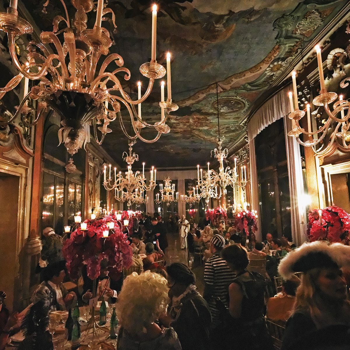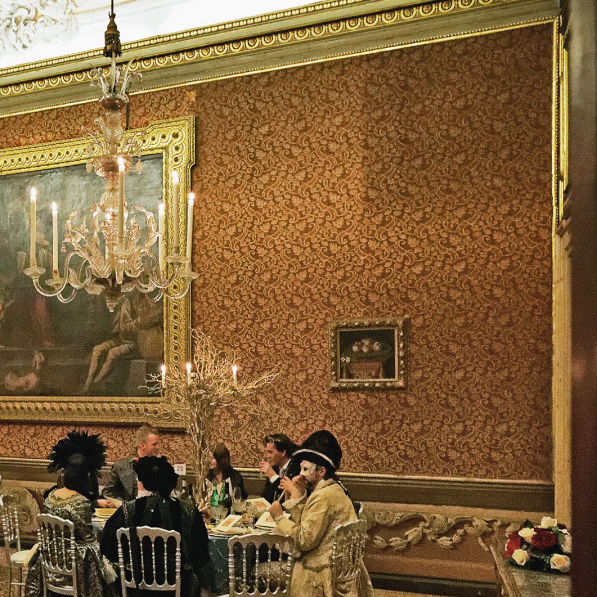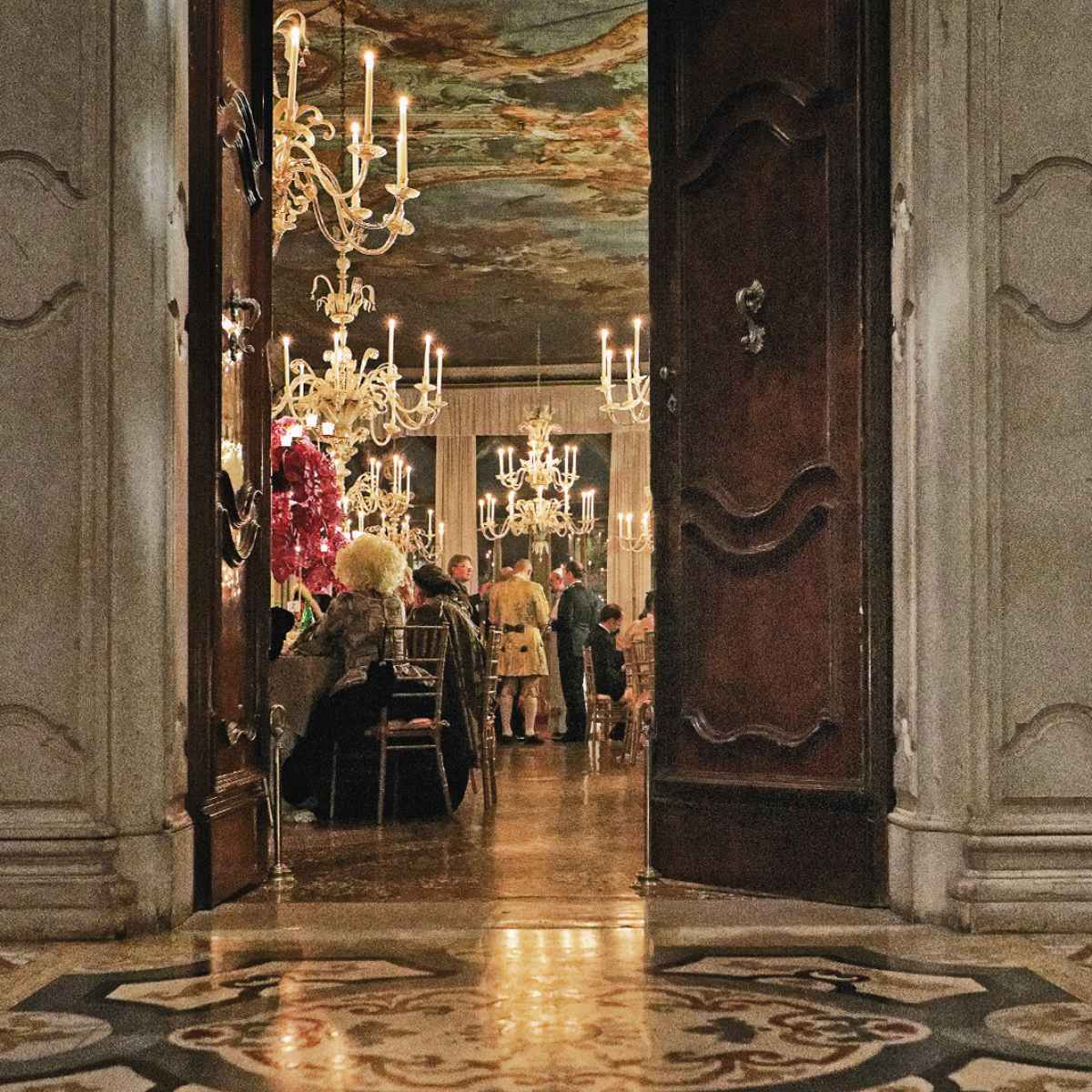 Wir sind zwar nicht für den Tiepolo Bal hier, aber uns erwartet ein unvergesslicher Abend in den alten Mauern, die sonst nicht für die Öffentlichkeit zugänglich sind. Den großen Salon in dem wir speisen, erreichen wir über eine prunkvolle Treppe. Wir durchschreiten die deckenhohe Türen und bewundern das renovierte Stockwerk: die Zimmer erhielten Spiegel und Kronleuchter, die in Murano hergestellt wurden, die Wände sind geschmückt mit gewobenen Tapeten und die Deckengemälde, die von Giambattista Tiepolo stammen, geben dem jetzt schon opulenten Erlebnis einen sehr gediegenen Rahmen.