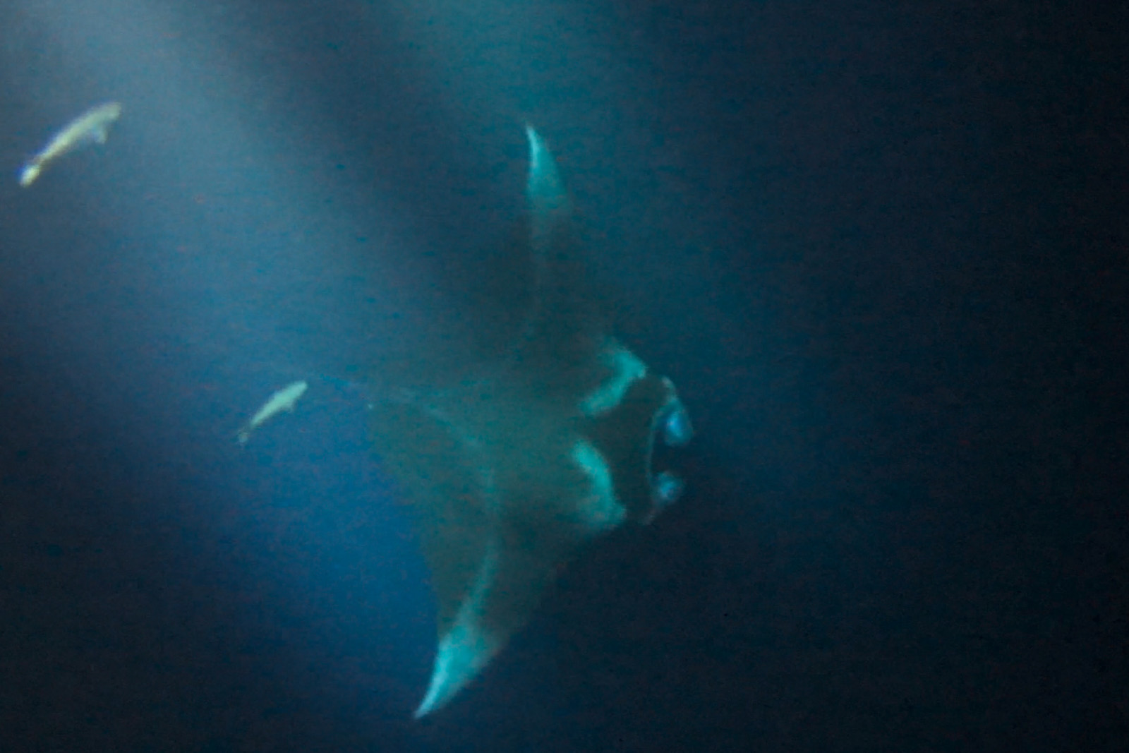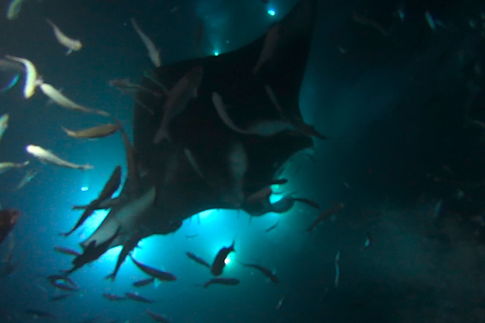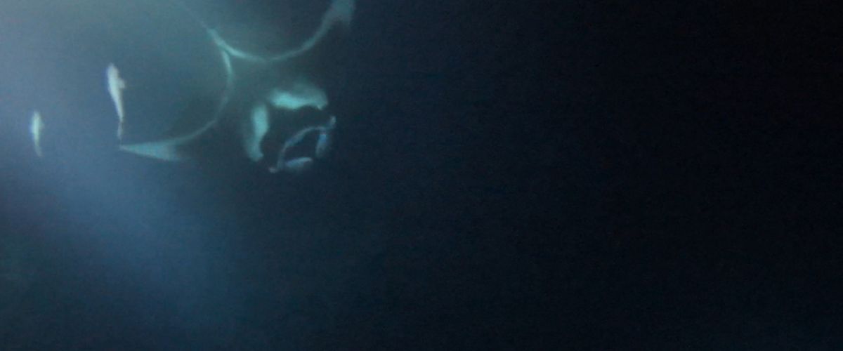 Wir paddeln und warten auf die Mantas. Im Lichtkegel schwimmen lauter Fische. Aber was ist außerhalb? Ein bisschen unheimlich ist das ganze schon... Und endlich kommt der erste Manta. Er schwebt durchs Wasser, immer näher auf uns zu, dreht aber 1 m vor uns ab und verschwindet wieder in der tiefen Dunkelheit des Meeres.