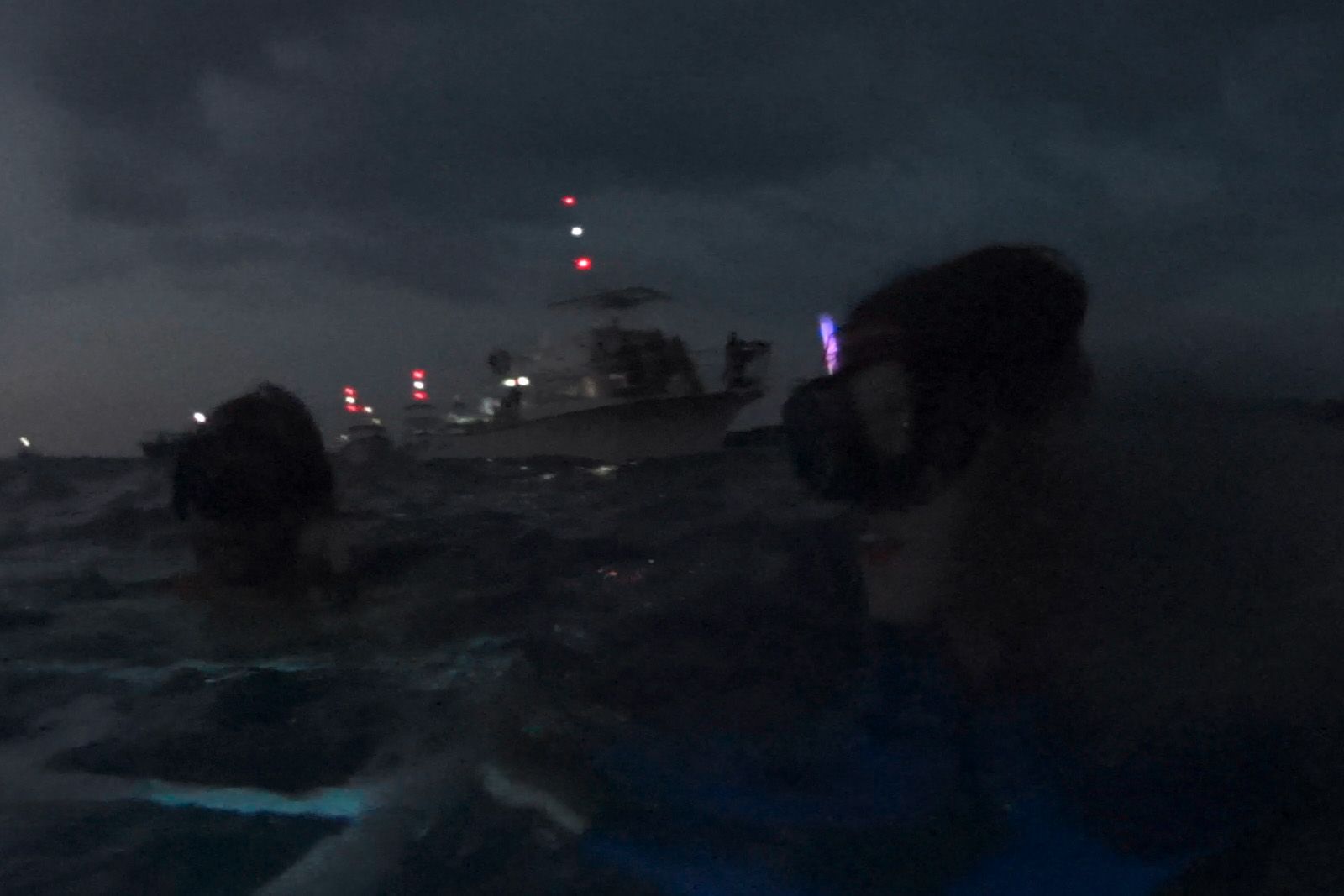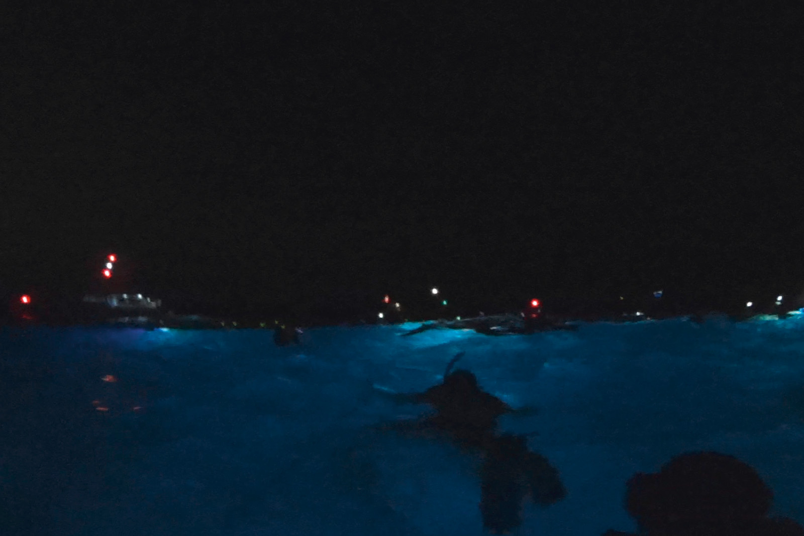 Wir kommen ins schwitzen. Also erstmal den Neopren-Anzug an, Leuchtstäbe am Schnorchel befestigen und ab ins Wasser. Ein umfunktioniertes Surfbrett mit Haltestangen aus dem Sanintärbedarf und Lampen dient als unsere Basis – die wir auch nicht verlassen dürfen. Es ist schließlich inzwischen stockdunkel.