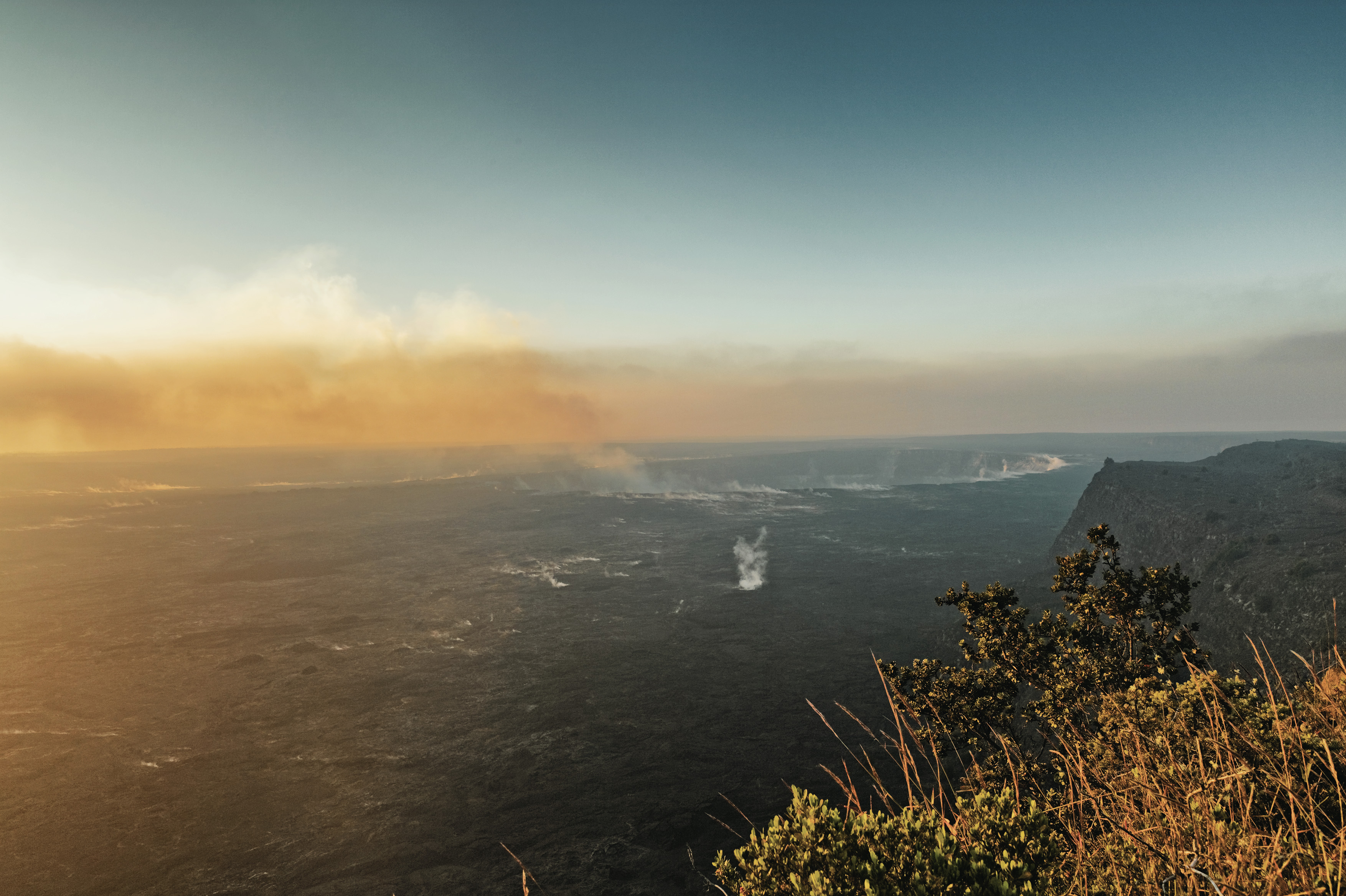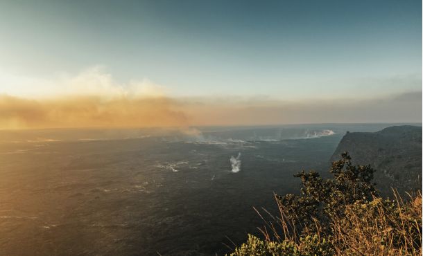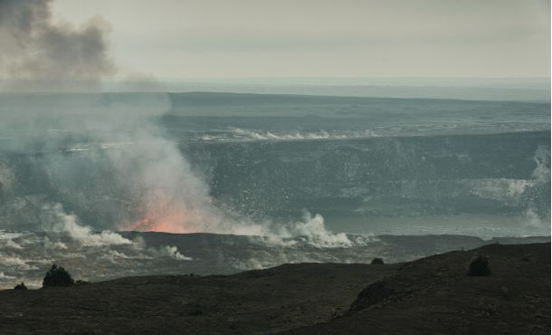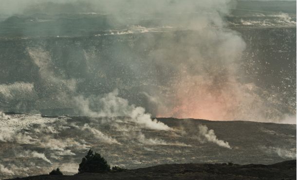 In der Caldera des Schildvulkans dampft und blubbert der Lavasee des Halema'uma'u-Kraters.