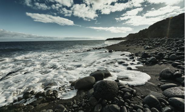 Schwarzer Basaltsand, der von Lava erzeugt wird, wärmt die urzeitlichen Riesen.