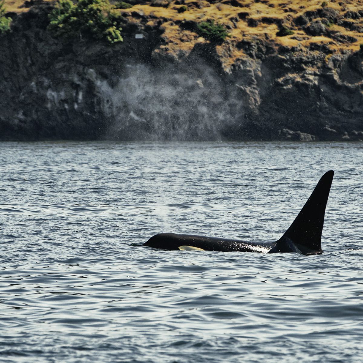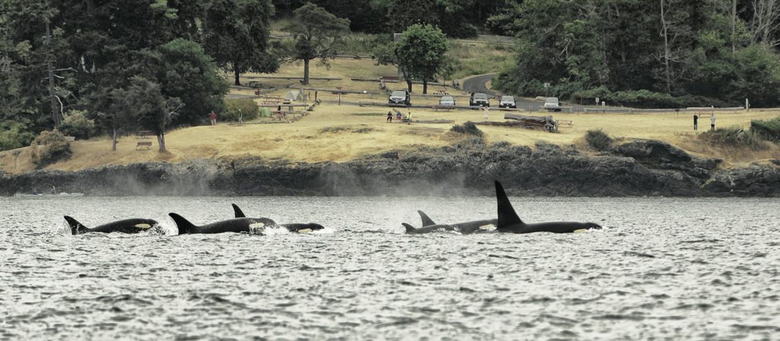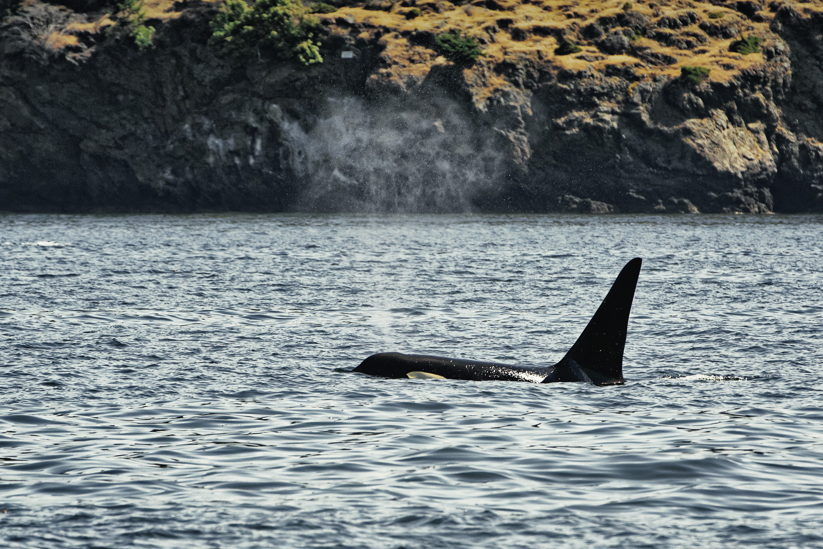 Plötzlich dreht das Boot scharf nach Backbord ab und der Captain teilt uns mit, dass weiter im Norden eine Gruppe von Transcendences in der Haro Strait gesichtet wurden. Wir hangeln uns am Küstensaum der San Juan Insel entlang und folgen einer kleiner Gruppe von Orcas, die mit schöner Regelmäßigkeit an der Wasseroberfläche erscheinen.