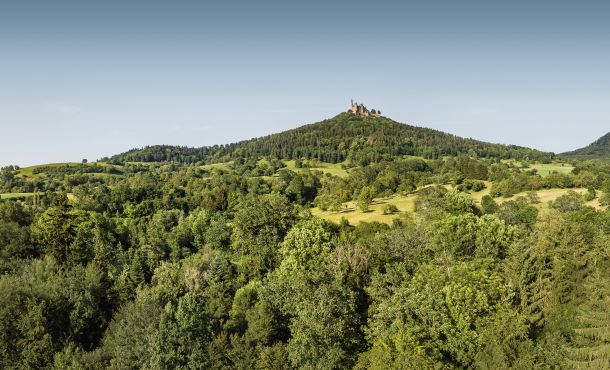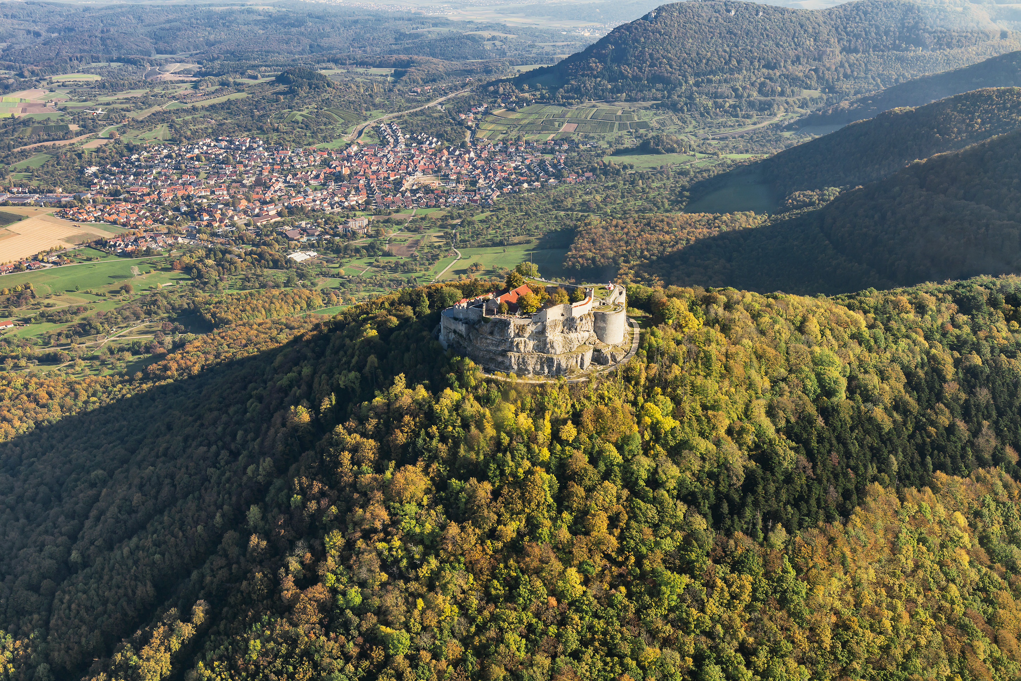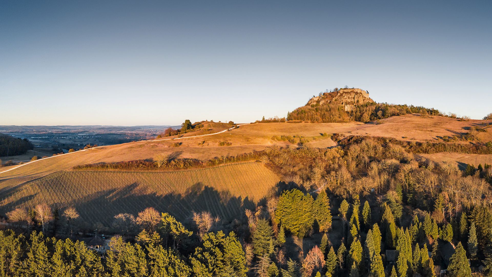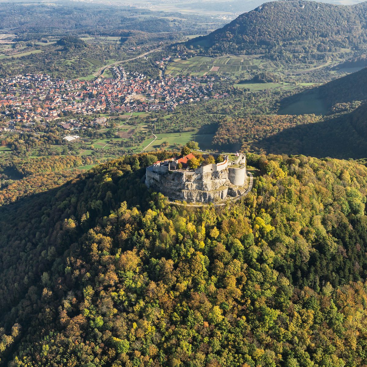 686 m hoher Berg im Hegau mit Festungsanlage aus dem 10 Jahrhundert, geschliffen unter Napoleon.