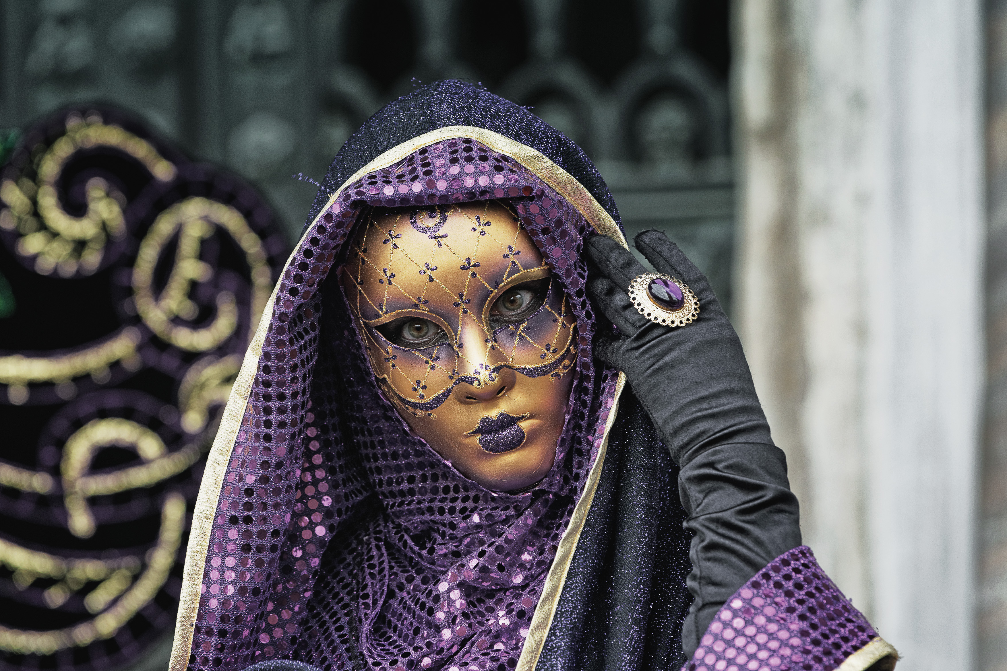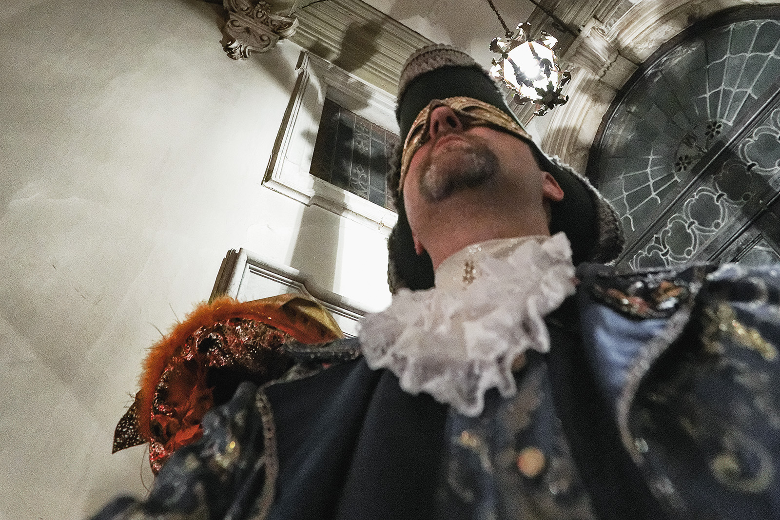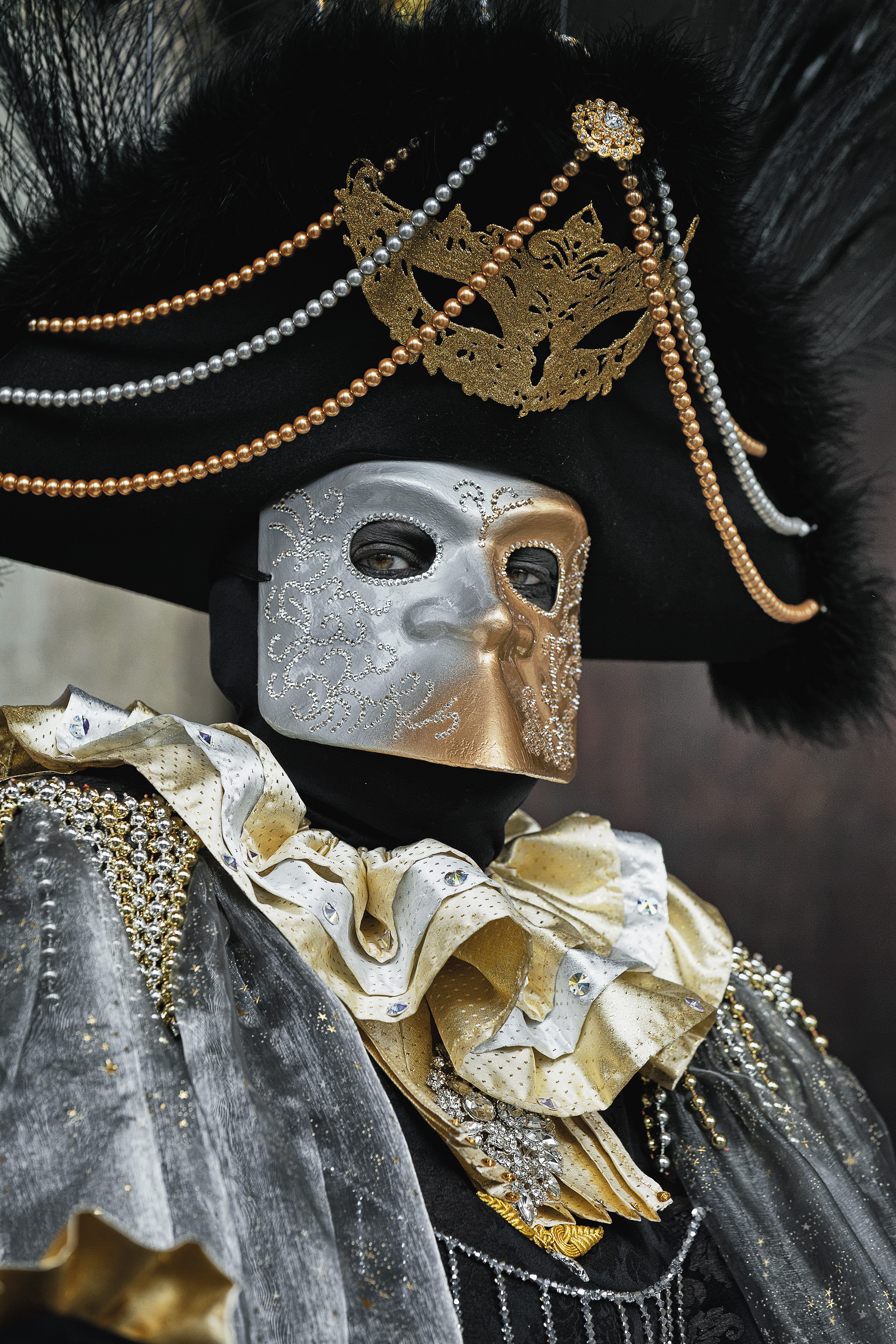 Gestärkt machen wir uns auf den Weg und haben nun genügend Zeit, die Stadt weiter zu erkunden und uns auf die Suche nach schönen Motiven zu machen. Viele Kostümträger lassen sich hier gerne vor antik-maroder Kulisse ablichten. Die meisten Kostüme haben aber kaum etwas mit der Historie der Stadt oder der Tradition des Karnevals in Venedig zu tun, sondern sind sehr fantasievoll und einfach zauberhaft. Und nicht gerade günstig auszuleihen. Meist gibt es Prozente auf den Mietpreis, wenn man eine Stunde damit durch die Stadt flaniert und die Ware für den optischen Genuss vermarktet. Wir suchen noch nebenbei die Strumpfhosen für die Herren und werden nördlich des Markusplatz fündig, in eben einem dieser Läden, die ein Rundum-Sorglos-Paket verleihen.