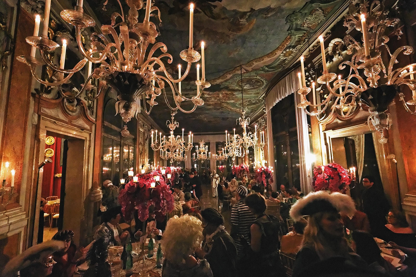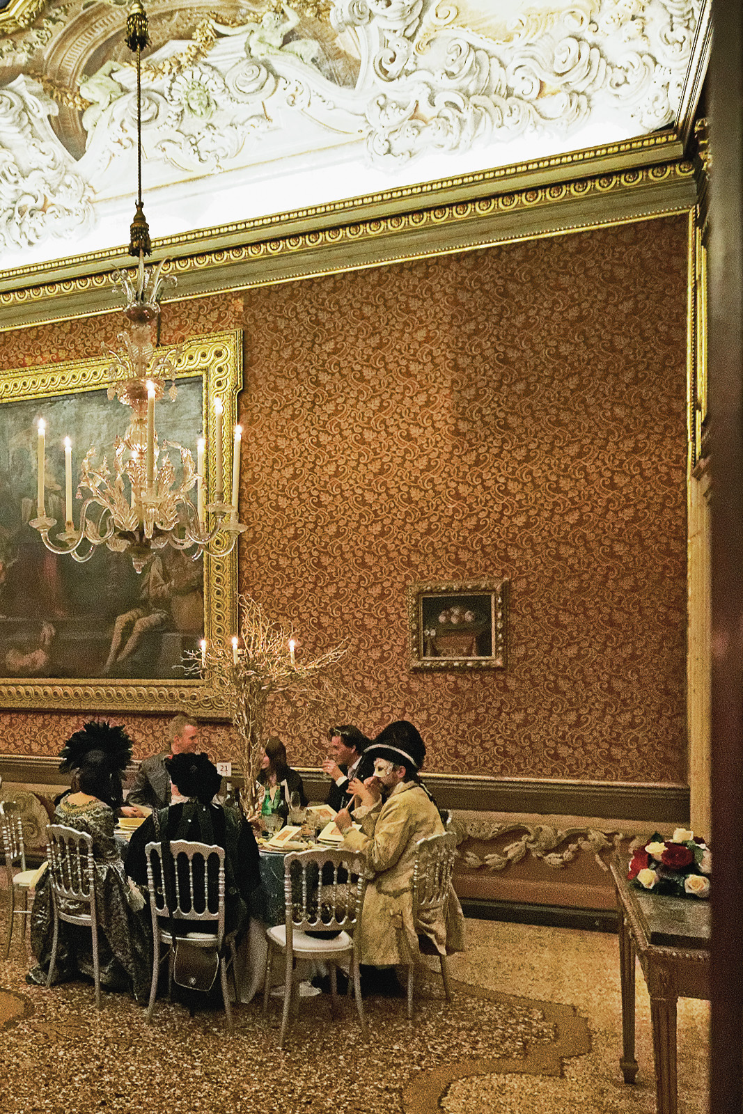 Wir sind zwar nicht für den Tiepolo Bal hier, aber uns erwartet ein unvergesslicher Abend in den alten Mauern, die sonst nicht für die Öffentlichkeit zugänglich sind. Den großen Salon in dem wir speisen, erreichen wir über eine prunkvolle Treppe. Wir durchschreiten die deckenhohe Türen und bewundern das renovierte Stockwerk: die Zimmer erhielten Spiegel und Kronleuchter, die in Murano hergestellt wurden, die Wände sind geschmückt mit gewobenen Tapeten und die Deckengemälde, die von Giambattista Tiepolo stammen, geben dem jetzt schon opulenten Erlebnis einen sehr gediegenen Rahmen.