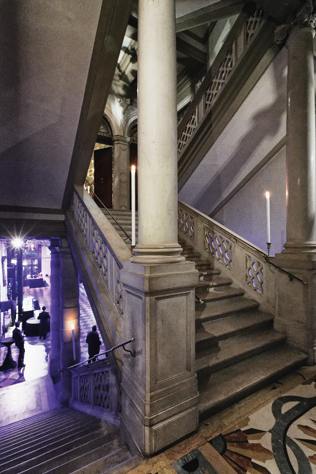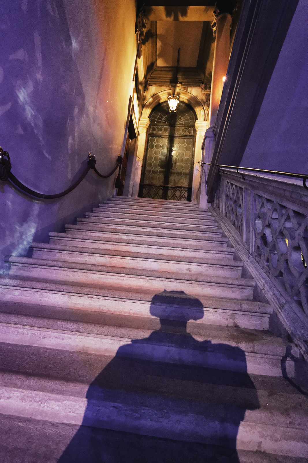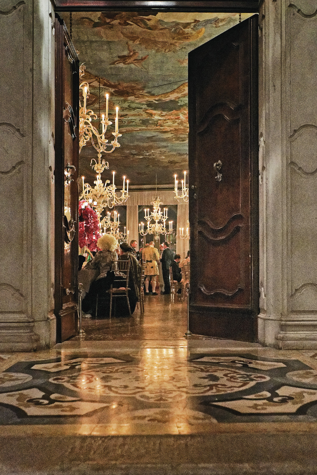 Es regnet in Strömen und wir können die Silhouette der Stadt nur verschwommen wahrnehmen. Unser Taxi legt am 'Palazzo Pisani Moretta' an und wir huschen über die mit Samtteppich ausgekleideten Pontons durch eines der zwei Portale, die in die schwarz-weiß geflieste Empfangshalle des Palazzos hinein führen.