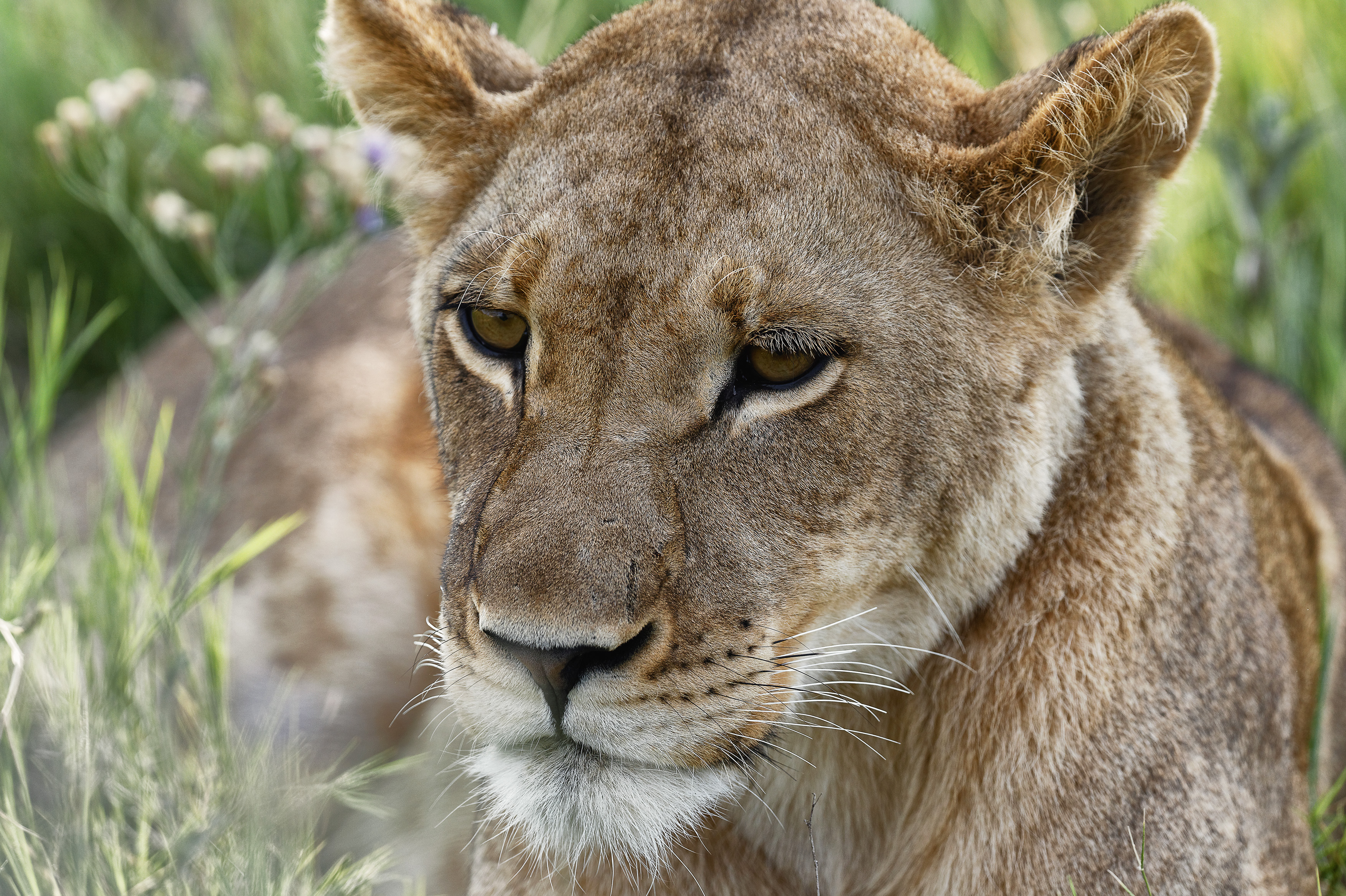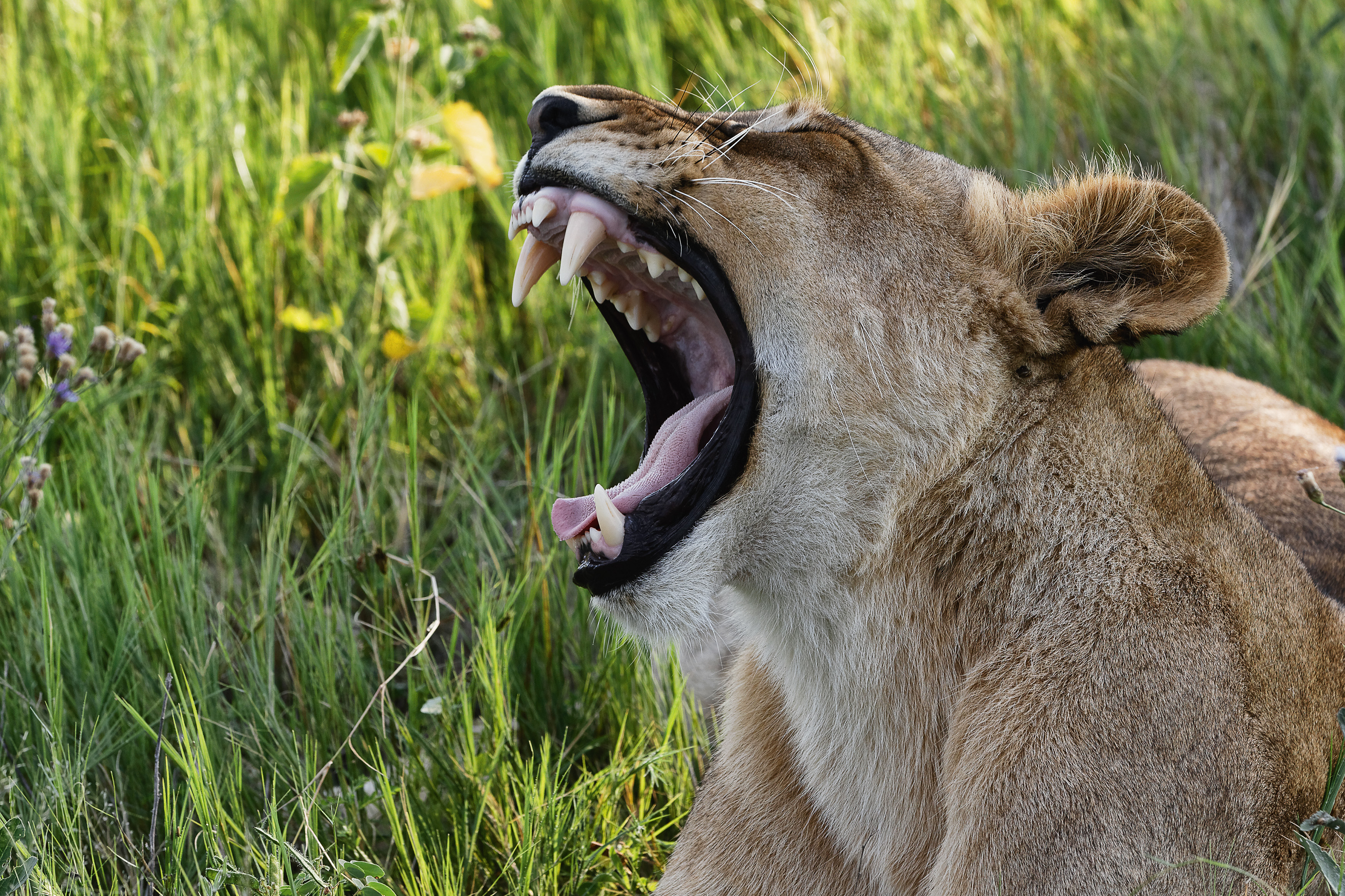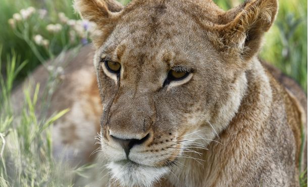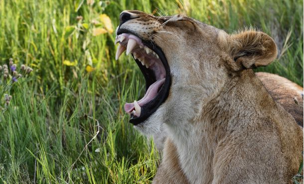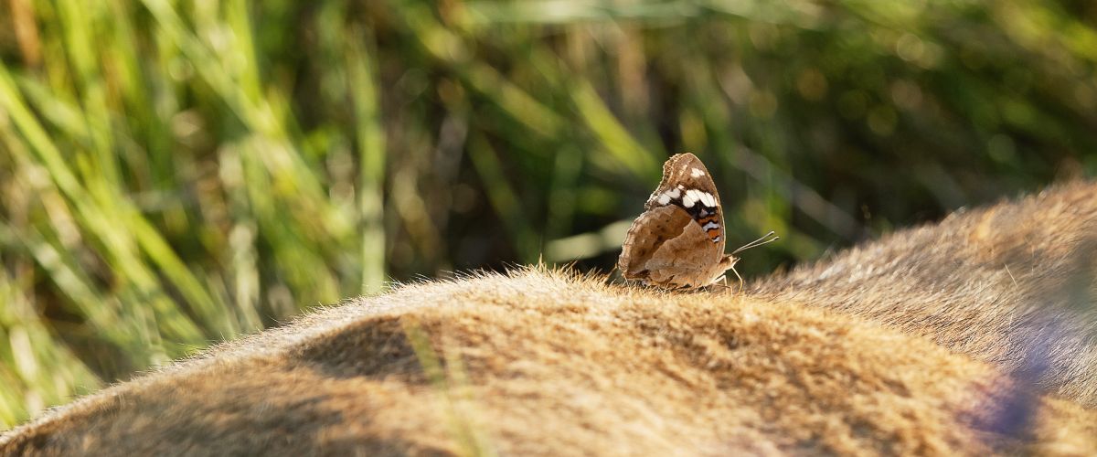 Die Löwen liegen unter dem Baum wie in einem Gemälde: zwischen saftigen Halmen, violetten und gelben Blumen und hier und da setzt sich sogar ein Schmetterling auf den rauen Pelz. Nachdem alle von Eindrücken, Aufnahmen und Erlebnissen gesättigt sind, geht es weiter.