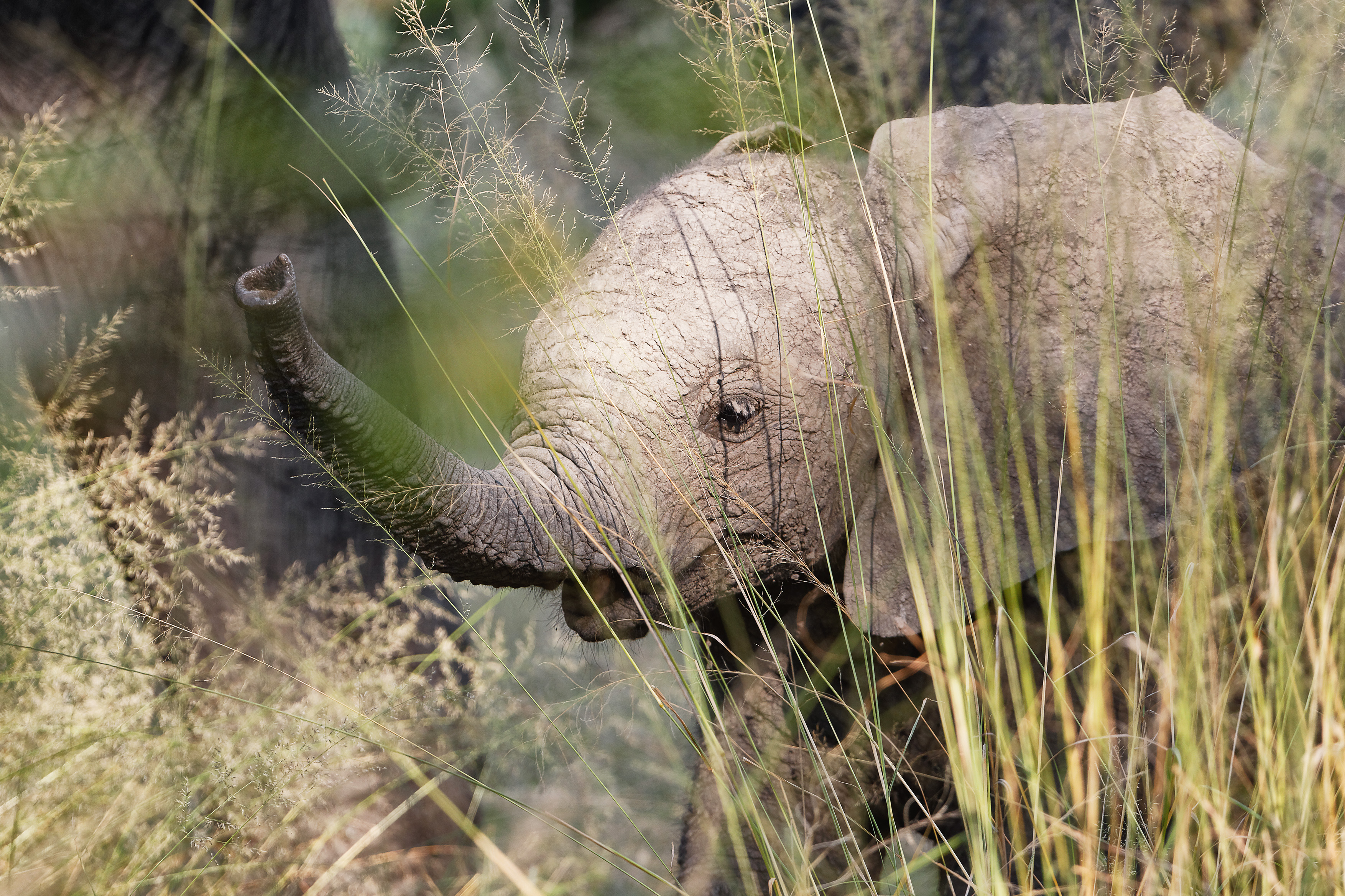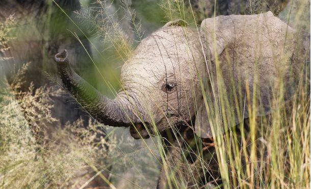 Wir kreuzen den Fluß auf einer aus Baumstämmen rudimentär zusammengeschusterten Brücke und fahren über das North Gate ins State Reserve. Kaum sind wir im Park, können wir eine Elefantenfamilie mit einem sehr fotogenen Jungbullen zwischen den Bäumen beobachten. Der weiß noch nicht, was er mit seinem Rüssel anfangen soll, aber sein Gesichtsausdruck sieht so aus, als ob er eine Menge Spaß daran hätte, seine Umgebung zu entdecken.