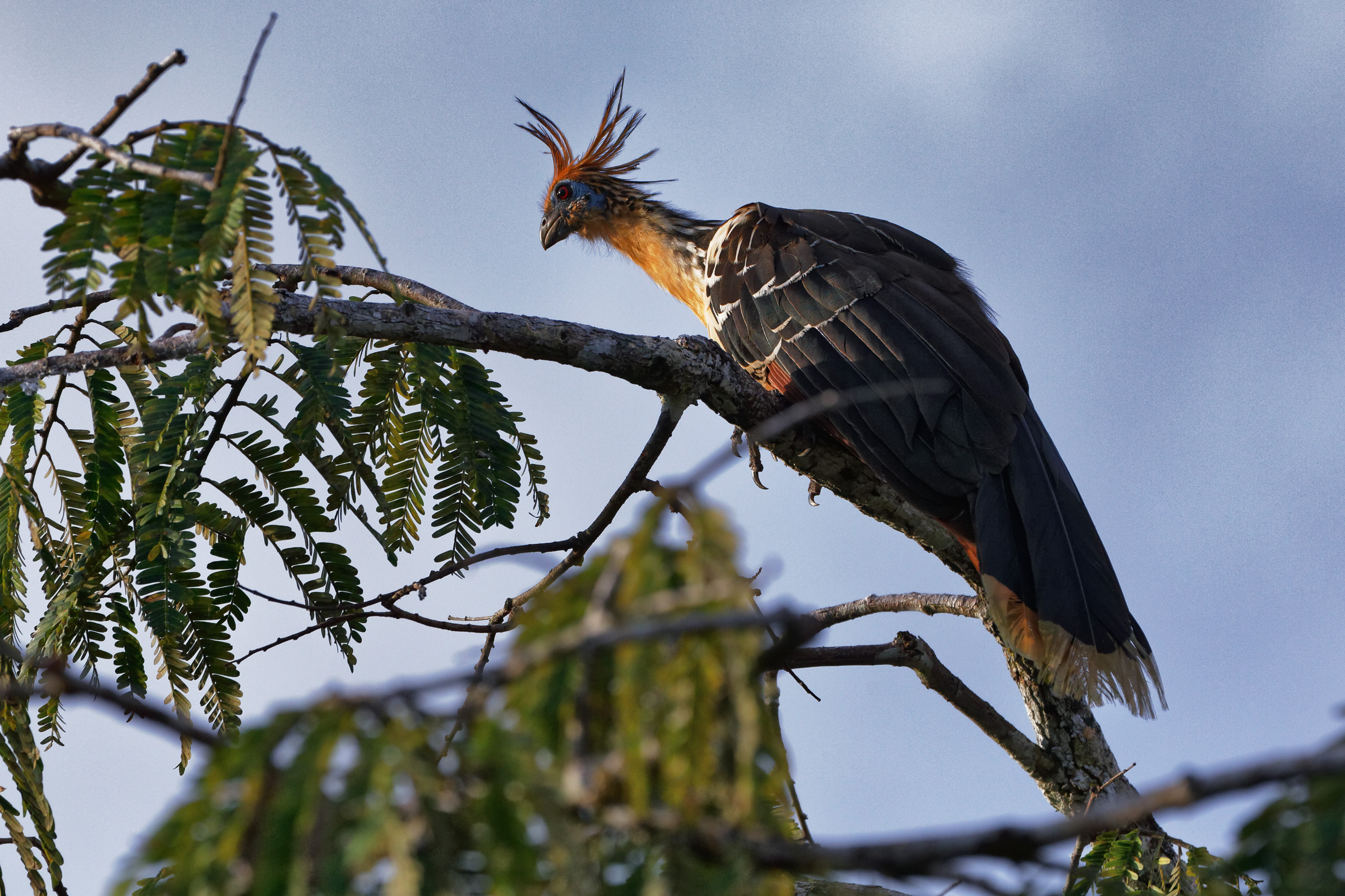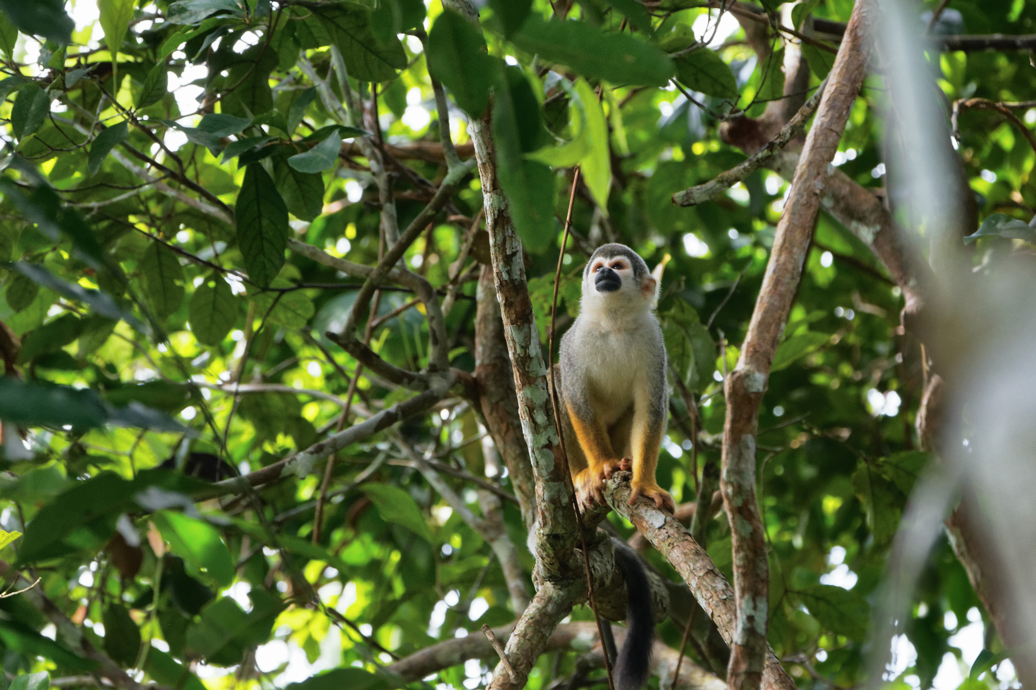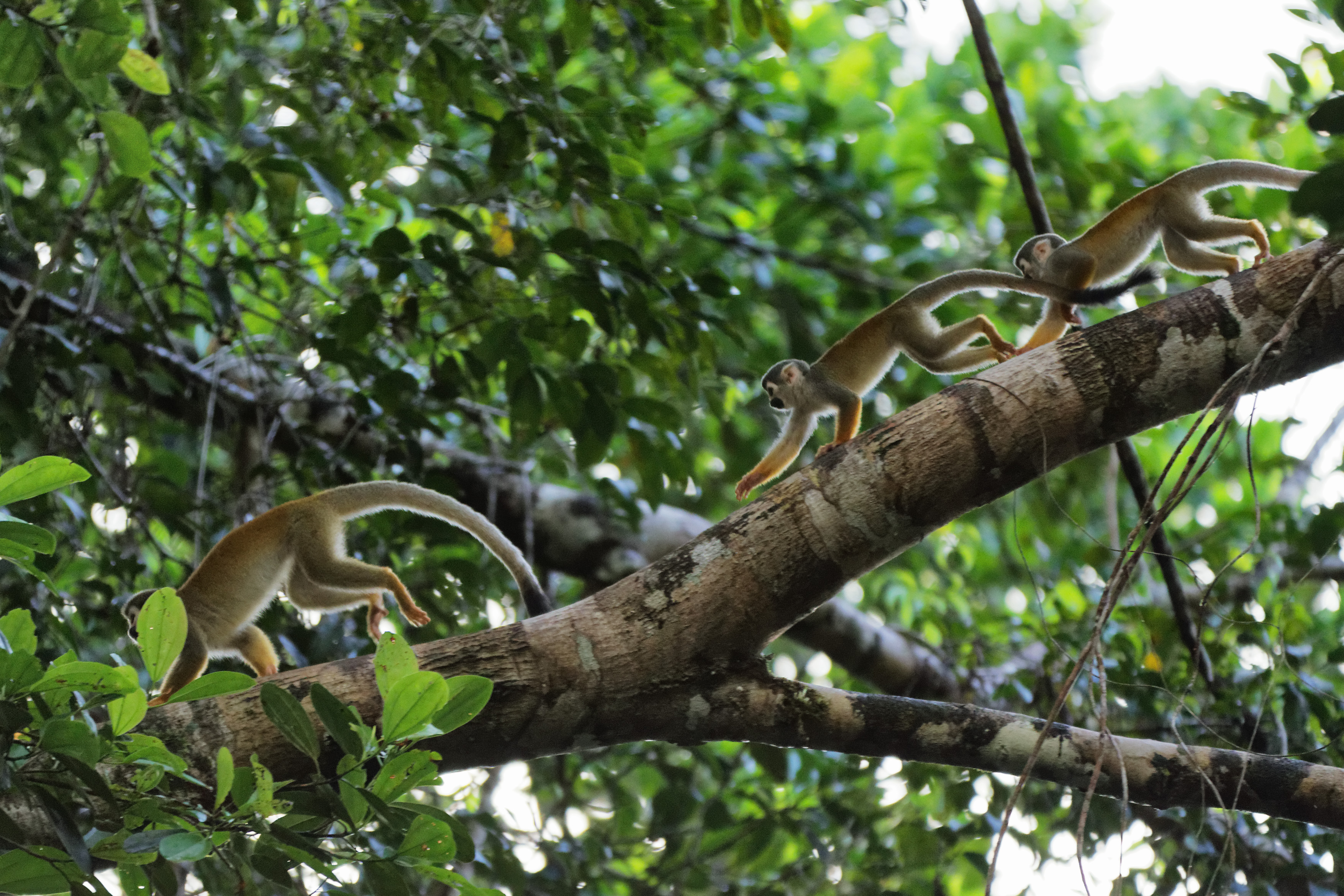 Hier und da sitzt ein Reiher im Buschwerk und trocknet sein Gefieder. Wir passieren einige sog. "Stinky Turkies" – Schopfhühner (Hoatzin), die wir die nächsten Tage wohl öfter sehen werden, und hören viele Vögel, die leider sehr weit entfernt im Blätterdach zu Hause sind. Wir sehen Kapuziner-, Woll und Mönchs-Affen und kleine Totenkopfäffchen, die jedoch allesamt sehr schwer zu fotografieren sind. Die Tiere sind flink, der Autofokus kämpft mit den Blättern und das Licht ist bescheiden.