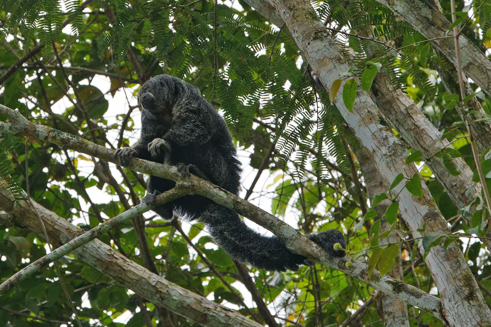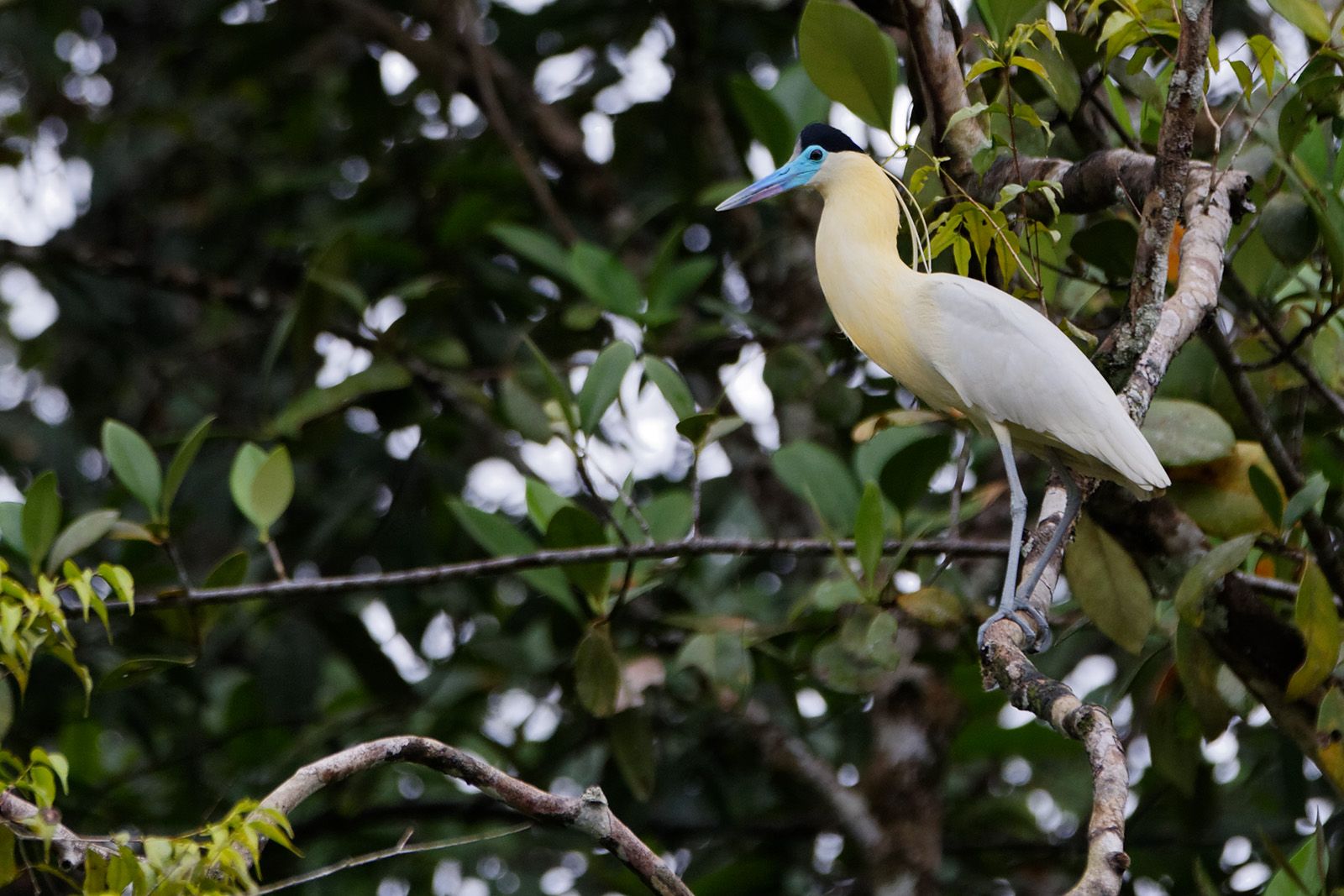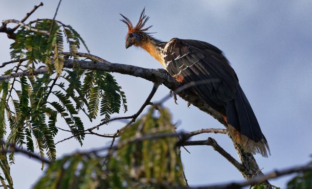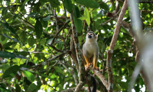 Hier und da sitzt ein Reiher im Buschwerk und trocknet sein Gefieder. Wir passieren einige sog. "Stinky Turkies" – Schopfhühner (Hoatzin), die wir die nächsten Tage wohl öfter sehen werden, und hören viele Vögel, die leider sehr weit entfernt im Blätterdach zu Hause sind. Wir sehen Kapuziner-, Woll und Mönchs-Affen und kleine Totenkopfäffchen, die jedoch allesamt sehr schwer zu fotografieren sind. Die Tiere sind flink, der Autofokus kämpft mit den Blättern und das Licht ist bescheiden.