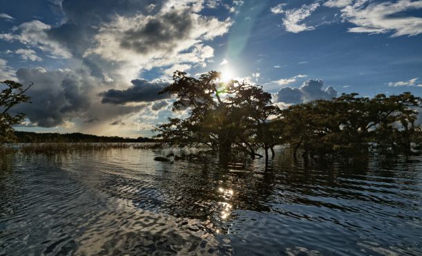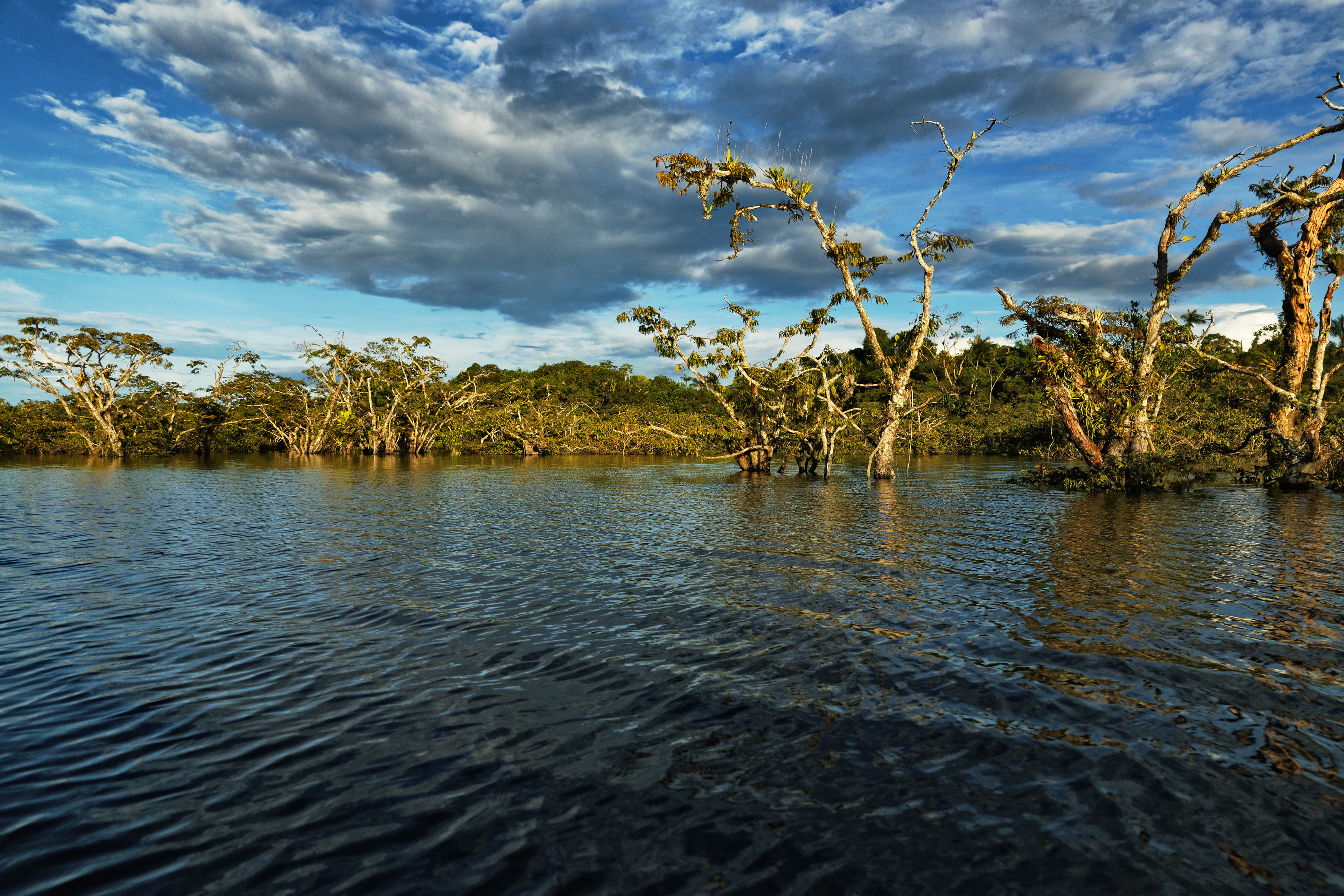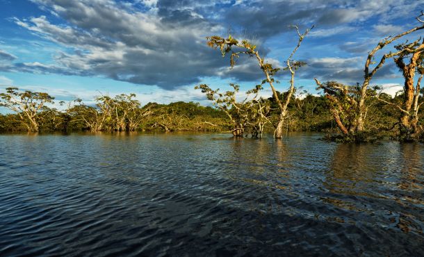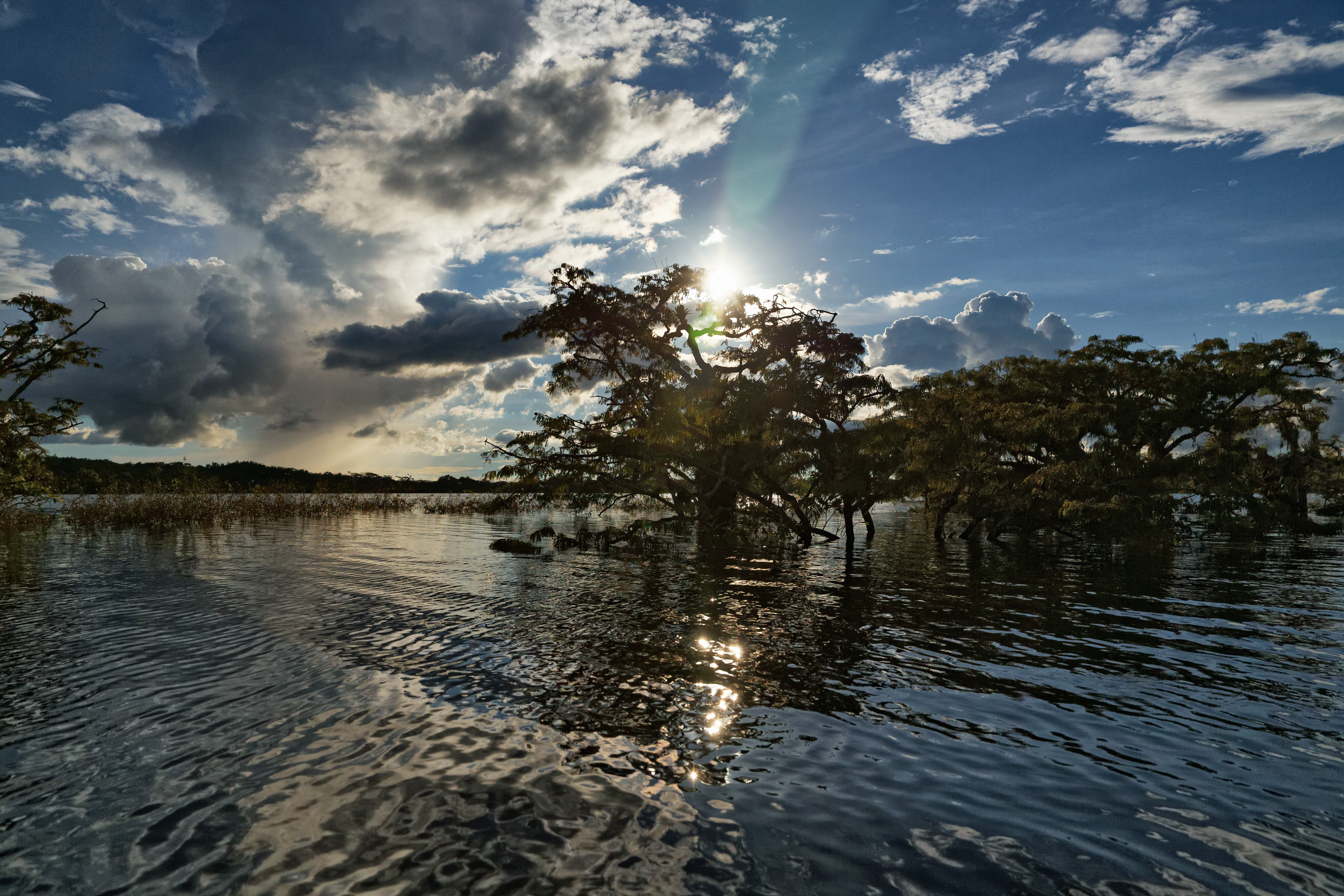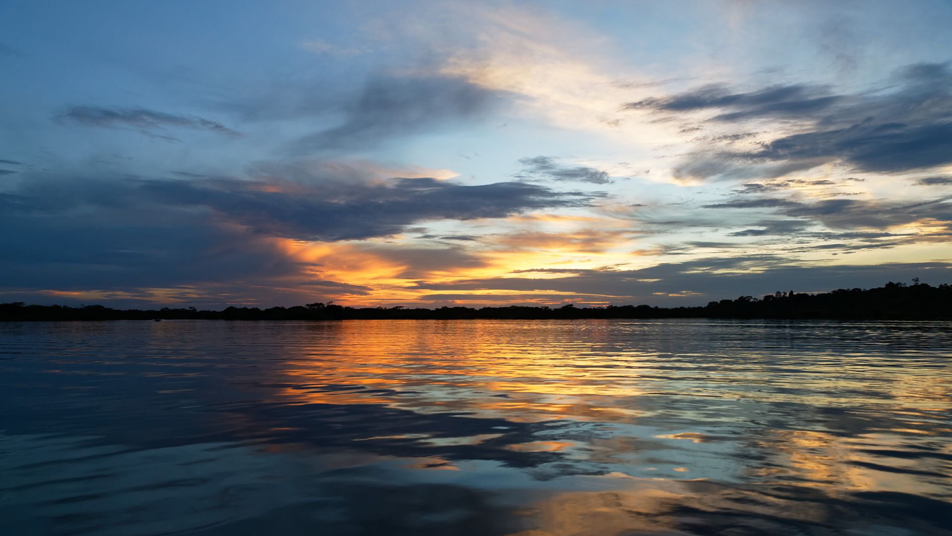 - In regenreichen Zeiten überschwemmt der Cuyabeno das Umland und in der Lagune spiegeln sich die Farben der untergehenden Sonne.
