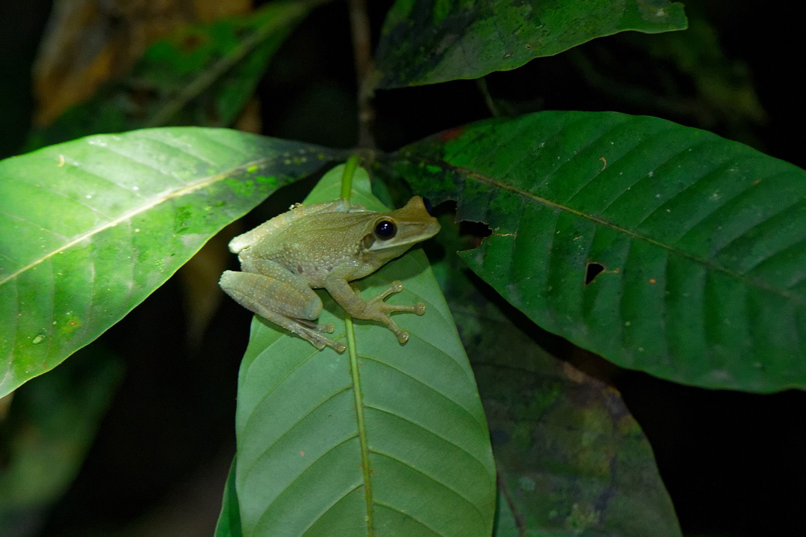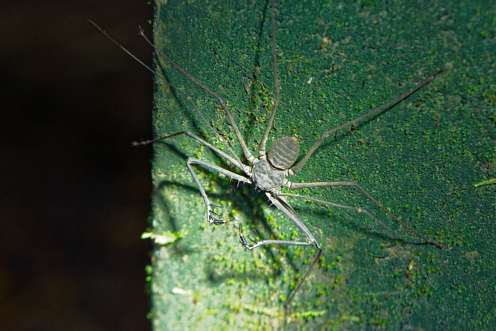 Abends geht es auf eine Nachtwanderung durch den Dschungel. Nach dem Abendessen landen wir auf der gegenüberliegenden Seite der Lagune an und setzen unseren Weg zu Fuß fort. Wir sehen viele Krabbeltiere, darunter eine ungefährliche Wolfspinne, die sich gehäutet hat und eine Skorpionspinne, die einfach nur ekelhaft aussieht. Diese sitzt an einem bemoosten Vermessungsstein, der den echten Äquator markiert. Wir nutzen das Licht der Stirnlampen zum Fotografieren, aber haben natürlich große Probleme mit der unregelmäßigen Bündelung des Lichts. Zu Dokumentationszwecken ist das wohl in Ordnung.