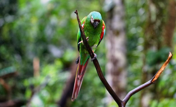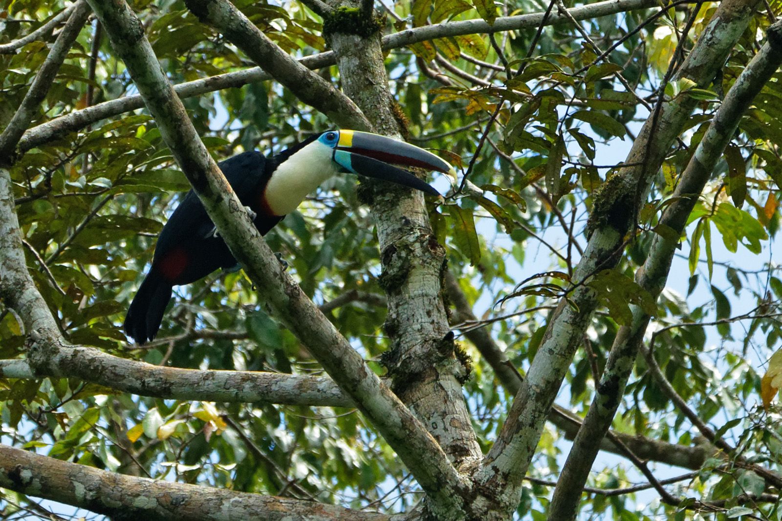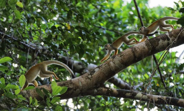 Auf dem Weg dorthin sehen wir ab und an riesengroße Schmetterlinge, die wie leuchtend blaue Lichtblitze durch das Grün der Wälder zucken. Edelfalter, deren sagenhaftes Blau durch Interferenz des Lichts auf den Schuppen der Flügel und nicht durch Pigmente entsteht. Zwischendurch entdecken wir noch Nachtaffen in einer Bruthöhle eines Baumes, bevor wir einen kurzen Landgang an den Wurzelstamm eines Baumriesen unternehmen.