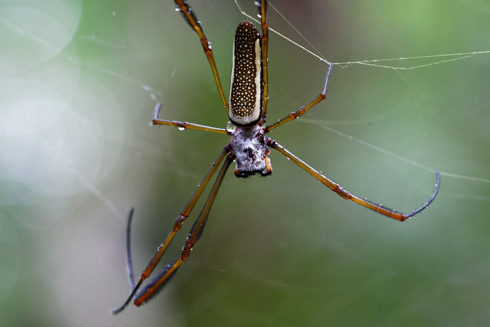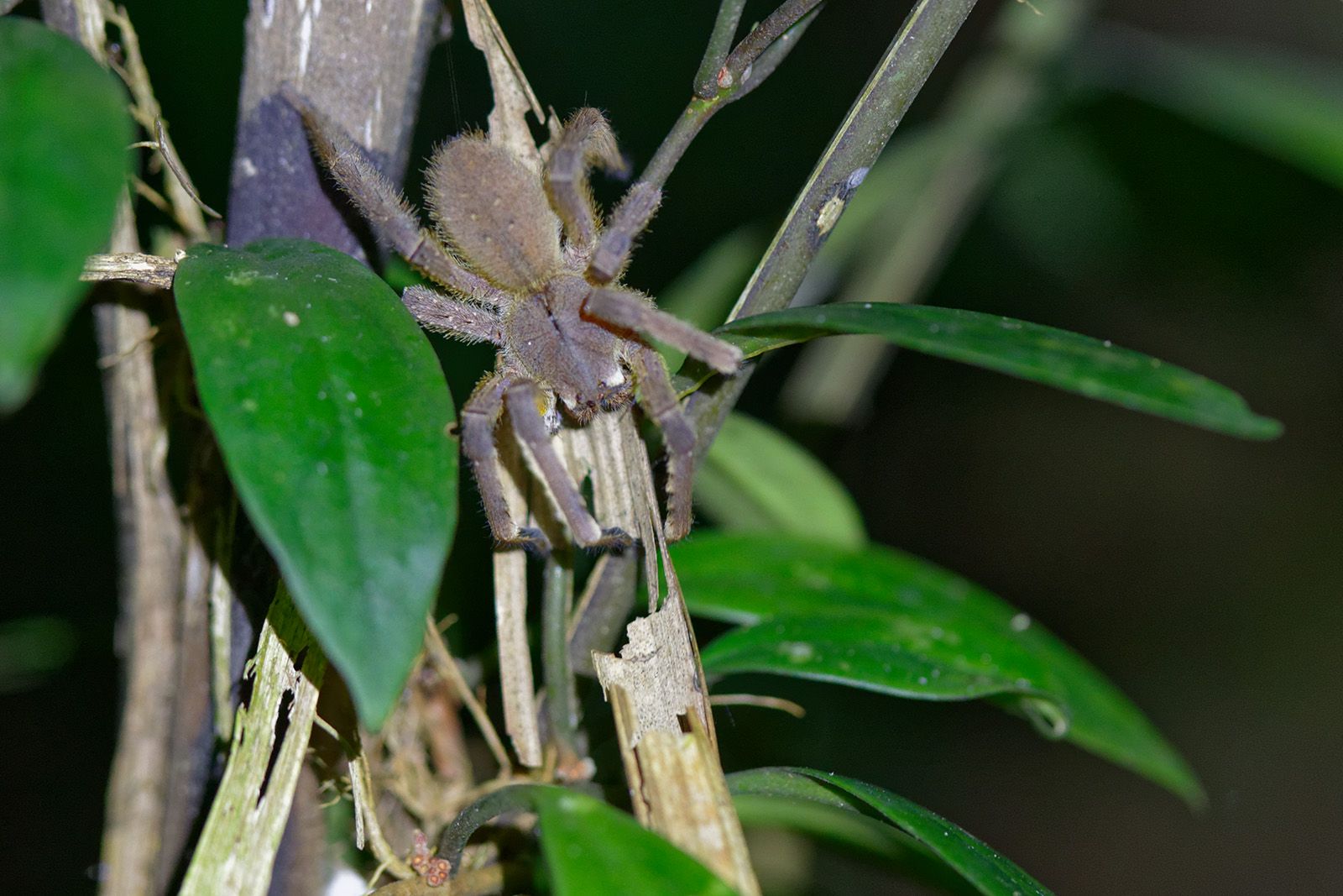 Gilver findet eine Bananenspinne und zeigt uns, wie aggressiv diese Tiere sind, indem er die Spinne mit einem Stöckchen reizt. Und diese macht dann auch einen großen Sprung auf das Stöckchen von unserem Guide. Aber wir haben das Gefühl, er weiß was er da tut, denn seelenruhig erzählt er uns dann, wie giftig diese Spinne ist.