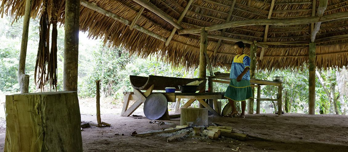 Kurze Zeit später holen wir Maria von ihrer Hütte ab und fahren zur einer Art Gemeindezentrum. Dort bekommen wir erst einmal einen theoretischen Abriss der Geschichte des Dorfes, bevor wir zu einem Maniokfeld geführt werden und Maria bei der Ernte einer Pflanze zuschauen. Wir fassen alle gemeinsam mit an, um die Knollen aus der Erde zu ziehen, die wir dann vor Ort schälen und wieder zurück zu der Gemeinschaftshütte bringen.