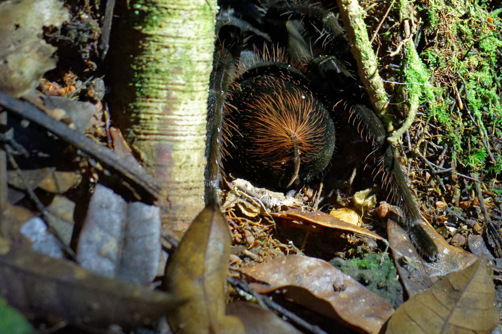 Wir sehen noch ein paar Frösche und ein Opossum im Baum. Und plötzlich ist auch Gilver begeistert: Wir haben eine schöne große Tarantel entdeckt und als Gilver noch sagt, wir sollen uns langsam und leise bewegen, da die Tiere auf Vibration reagieren, trampelt die gesamte Gruppe schon so heftig auf das arme Tier zu, dass die Spinne schnell in ihrem Bau verschwindet ...