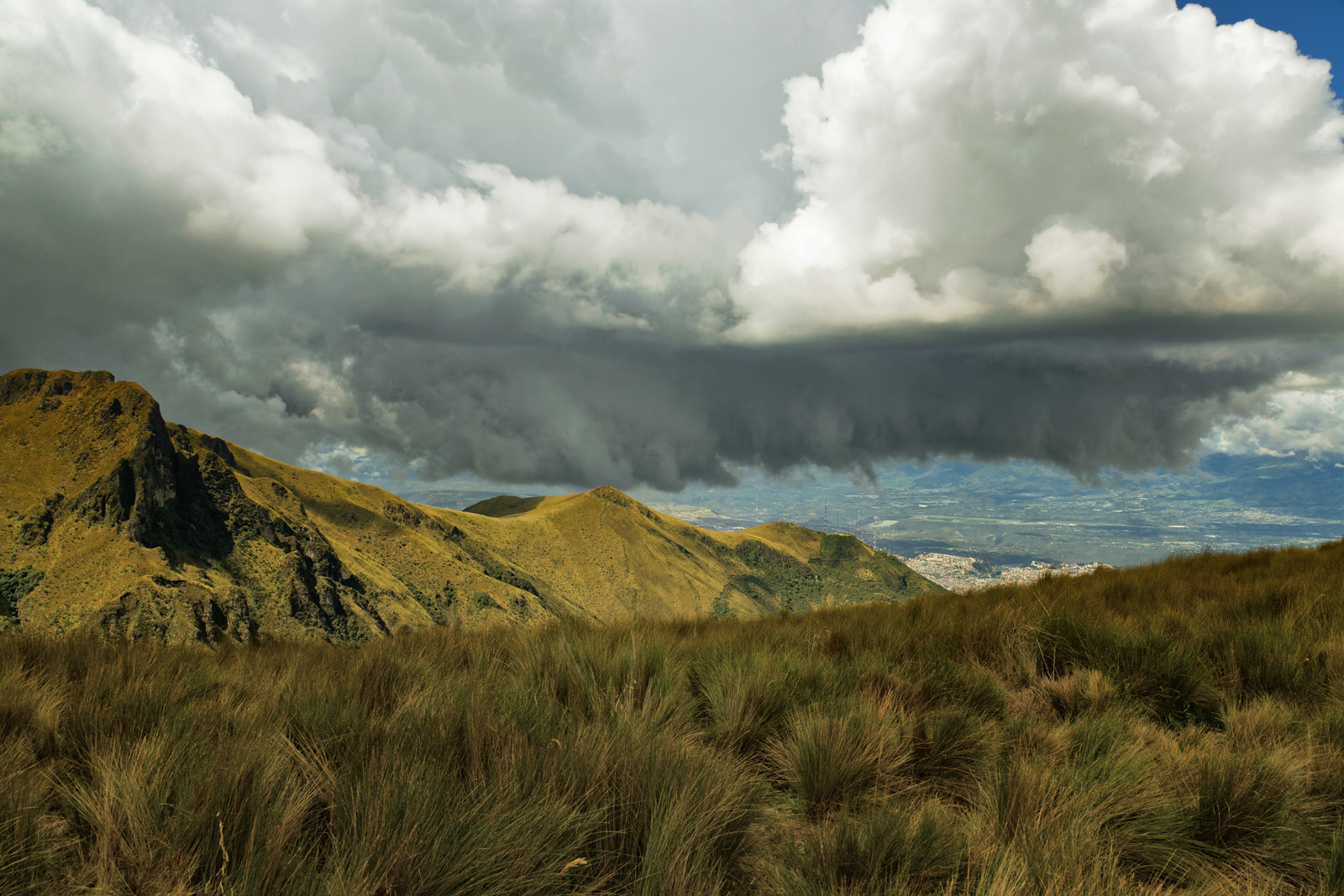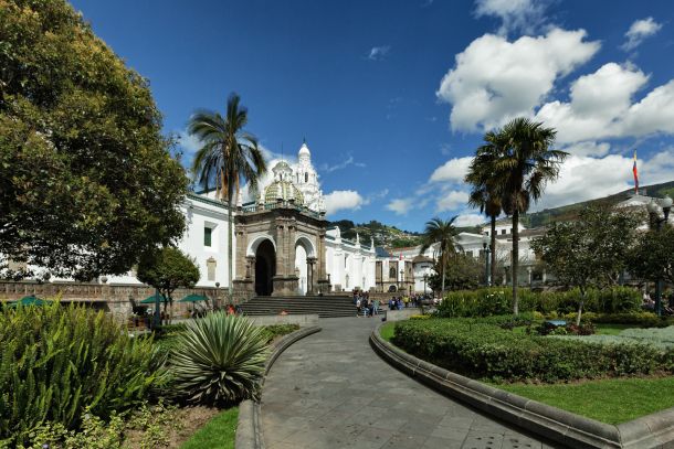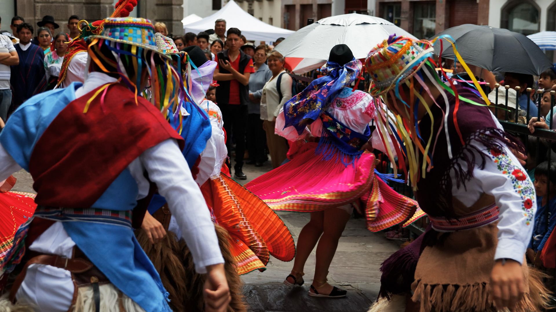 Vor einer Kirche tanzt ein Ensemble in traditioneller Kleidung, denen wir eine Weile zuschauen. Vor dem Regierungsgebäude gibt es gerade eine Wachablösung, danach fahren wir auf El Panecillo, einem Hügel mitten in Quito, von dem wir einen guten Ausblick auf die Nord- und Südstadt haben.