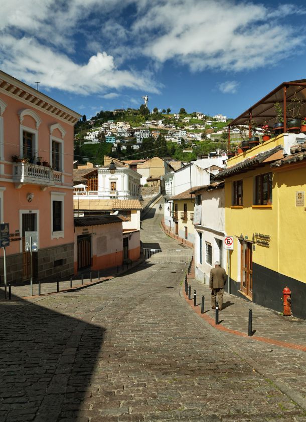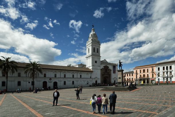 Am nächsten Morgen genehmigen wir uns erstmal ein frisches Frühstück in unserem Hostel, dann holt uns Roberto für eine Stadtführung ab. Hui, der Schnaps gestern steckt uns noch sehr in den Knochen. Es ist Sonntag, das bedeutet, die Innenstadt von Quito ist autofrei. Jeden Sonntag wird hier der Stadtkern für Fahrradfahrer und Fußgänger freigehalten. Wir laufen durch die Altstadt mit wunderschönen Kolonialbauten an jeder Ecke. Eine Kirche ist pompöser als die andere, innen können wir aber leider nur heimlich
