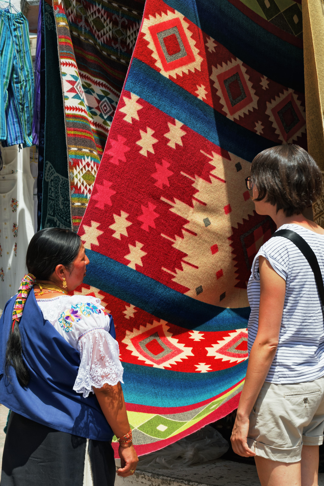 Alleine durch unsere Diskussion vor der Verkäuferin wir die Decke gleich um die Hälfte billiger. Trotzdem laufen wir weiter. Wir schauen uns bunte Decken, Ponchos, Tücher und Schmuck an, überall wollen die Leute uns an ihren Stand ziehen. Anny erwähnt in regelmäßigen Abständen die wunderschöne Decke.Und Geduld zahlt sich aus, am Ende gibt Micha nach. Juhuu!Mit einer tollen neuen Decke und ordentlichem Sonnenbrand auf den Schultern geht es auf den Weg zurück nach Quito.