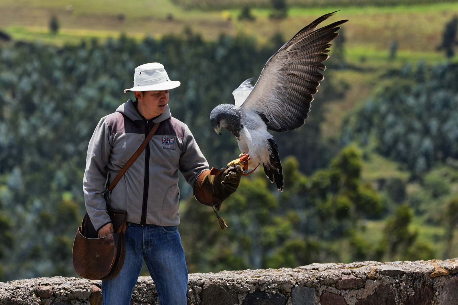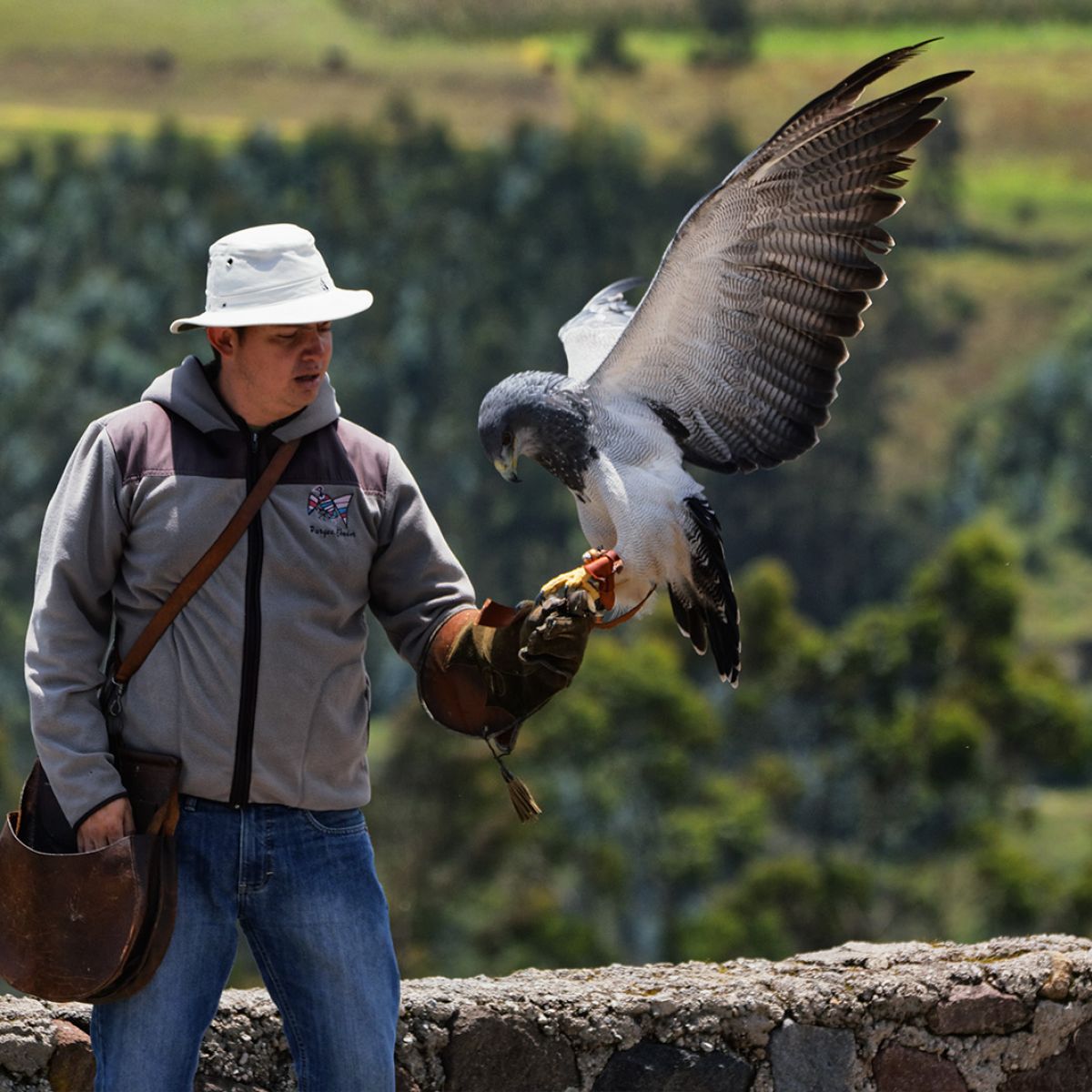 Im Park leben unterschiedliche Vogelarten – Eulen, Adler, Falken und natürlich die berühmten Andencondore – alle gerettet aus illegaler Haltung oder aus den Fängen von Wilderern. Teilweise werden die Tiere wieder ausgewildert, die nicht einheimischen Vögel bleiben bis an ihr Lebensende in deren Obhut. Man kann die Tiere in ihren Käfigen anschauen wie im Zoo, außerdem gibt es für Besucher eine Greifvogelflugschau. Wir haben einen tollen Blick von der Plattform, und beobachten diverse Greifvögel unterschiedlicher Größe beim Starten und Landen.