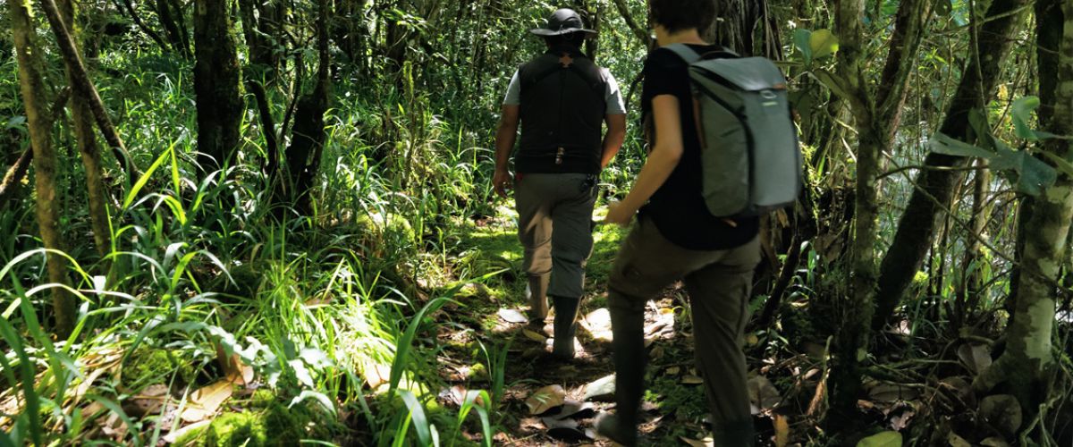Für den Nachmittag haben wir den Besuch einer Vogellecke geplant. Hier ist der berühmte Cock of the Rock oder Andenklippenvogel zu Hause. Wir ziehen wieder unsere Gummistiefel an und laufen zum Haus von Sandra Statz, die uns zur Lecke führen soll. Sandra kommt aus Wisconsin und hat sich hier in der Einöde niedergelassen. Sie sagt Hallo und läuft los, wir hinterher.