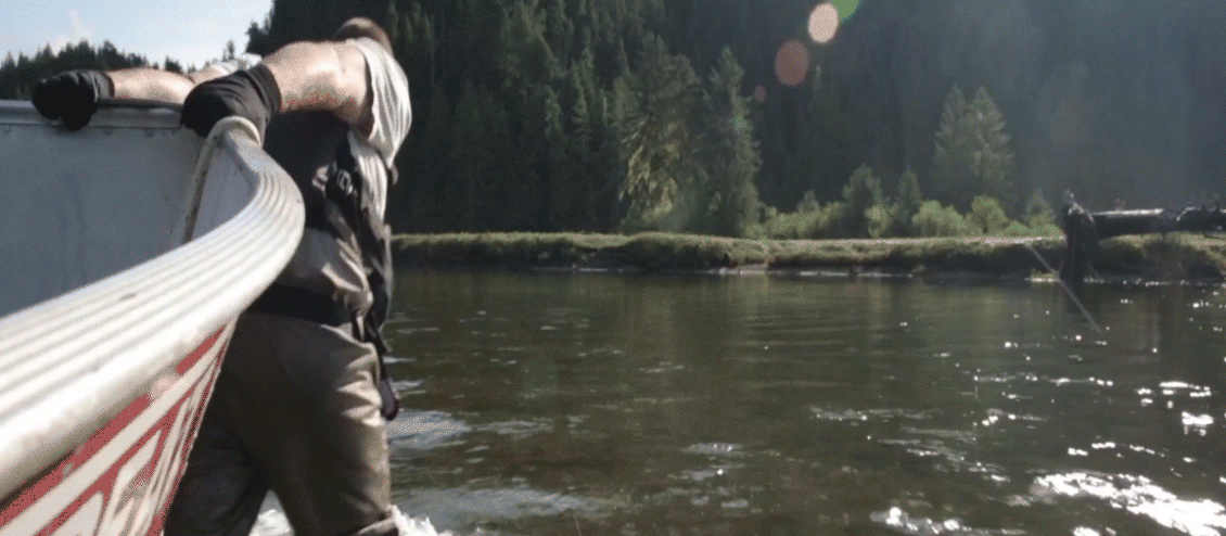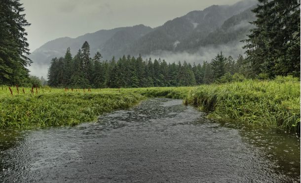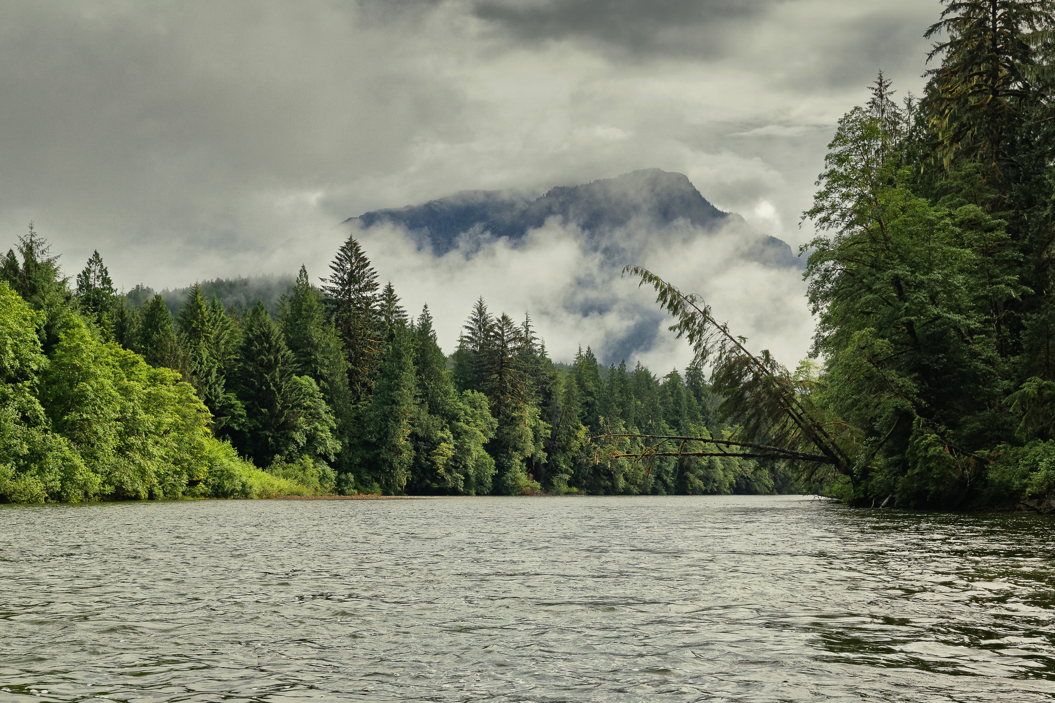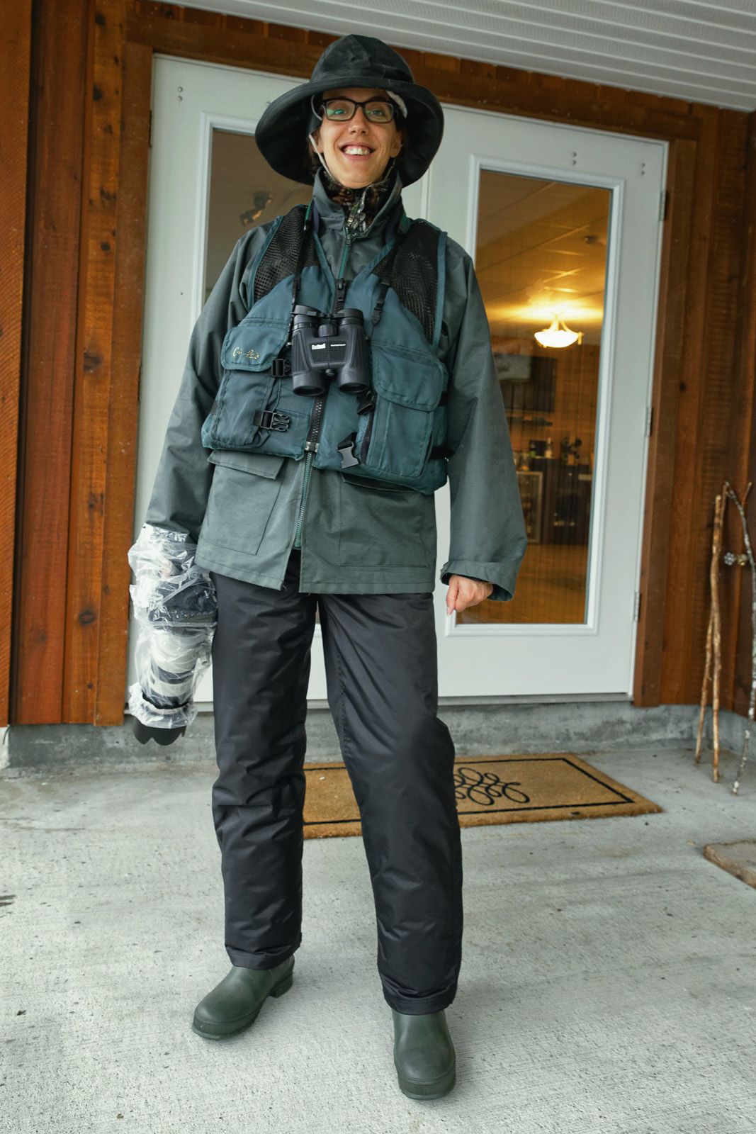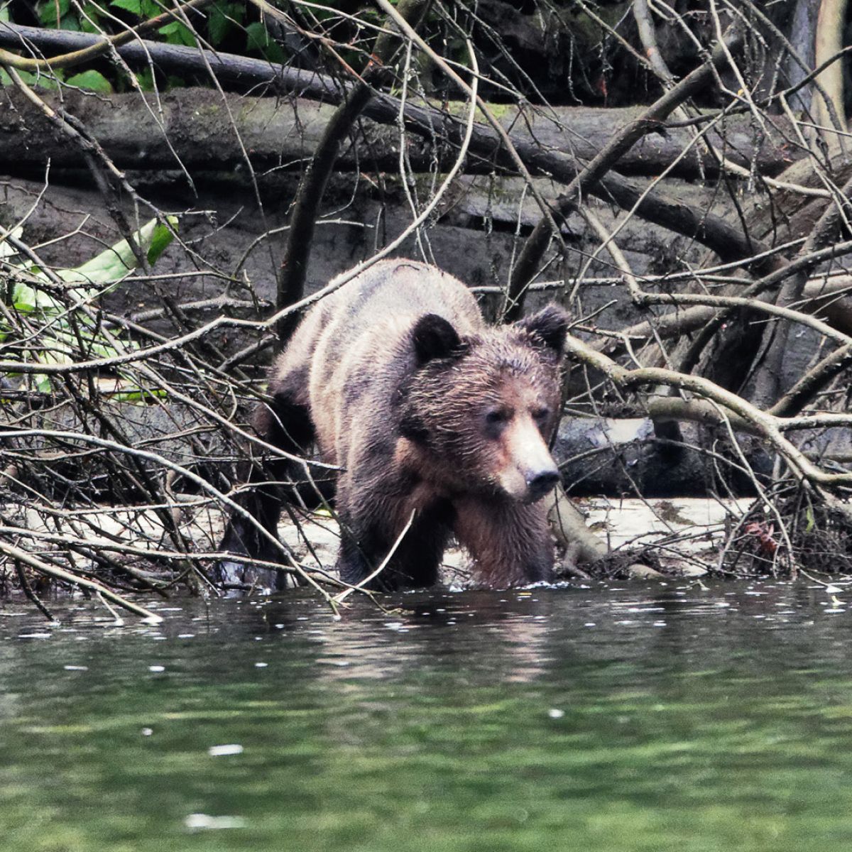 Der viele Regen und ein ordentlicher Tidenhub hat die verzweigte Flußlandschaft anschwellen lassen und wir sind erstaunt, wie weit wir die ganzen Wasserwege hinauf fahren können - im Vergleich zu den kommenden Ausflügen war das bereits das Maximum! Wir sind aufgeregt und schauen fleißig durch unsere Ferngläser, ob wir vielleicht eine Bewegung bemerken, die sich als Grizzly entpuppt. Da wir uns zum ersten Mal im Revier befinden, scouten wir fleißig alle Baumstümpfe, Wurzeln und einzelne Felsbrocken die sich beim besten Willen nicht zum Bären wandeln wollen. Müde, nass und verschwitzt kehren wir nach fast vier Stunden heim und trösten und damit, dass wir ja noch fünf Chancen vor uns haben.