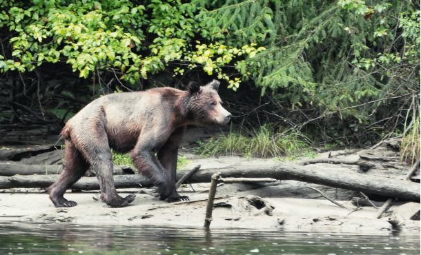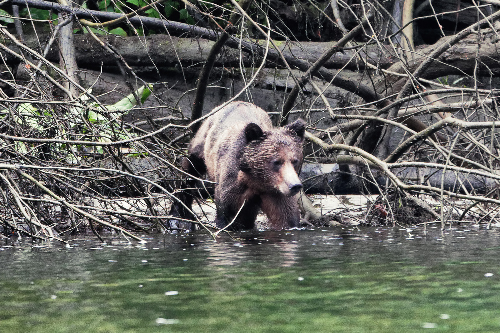 Aber Marcus beschließt langsam wieder Flußaufwärts zu fahren, an die Stelle, an der der Bär wieder an Land ging. Still und gespannt verharren wir, keiner traut sich irgend einen Mucks zu machen. Wir suchen das gegenüberliegende Flussufer nach einem großen, nassen „Hund“ ab und plötzlich - da! Der Grizzly kommt aus dem Dickicht heraus, kommt kurz zurück ans Wasser, sieht uns und beschließt noch ein wenig am Wasser entlang zu laufen.