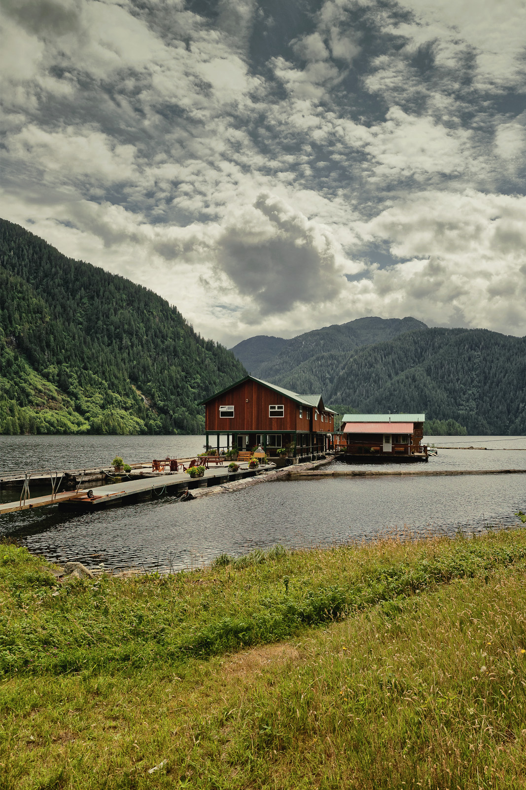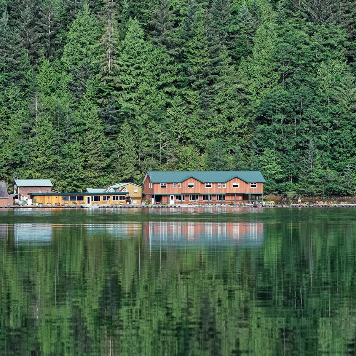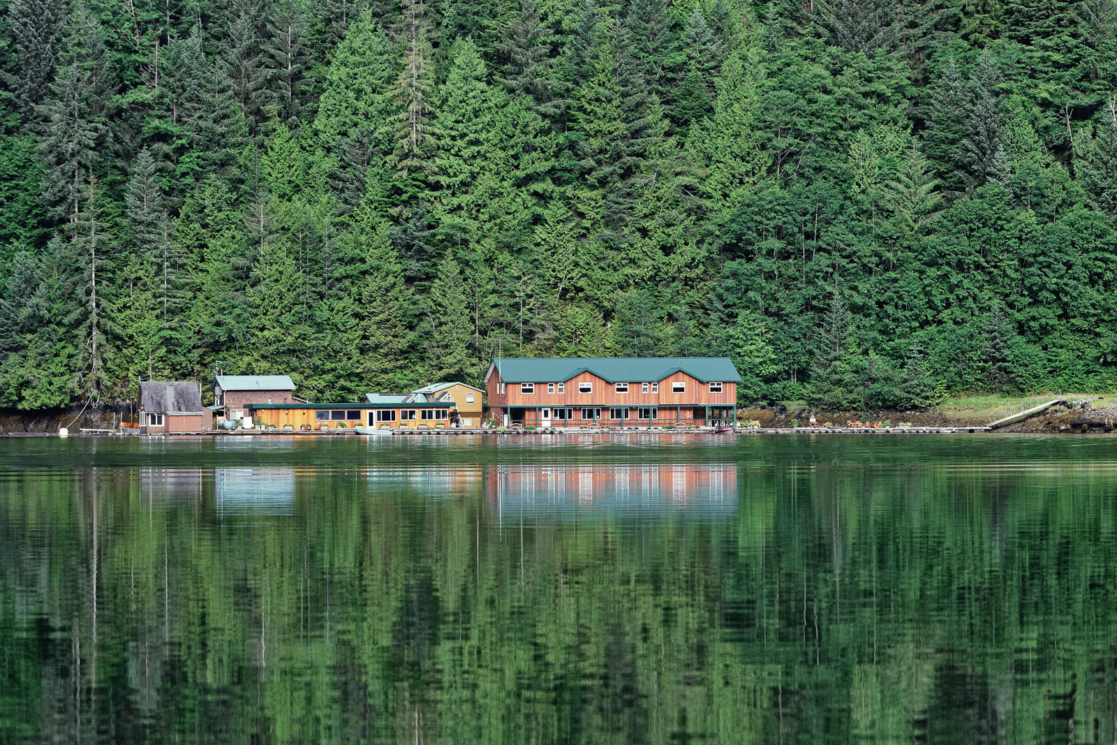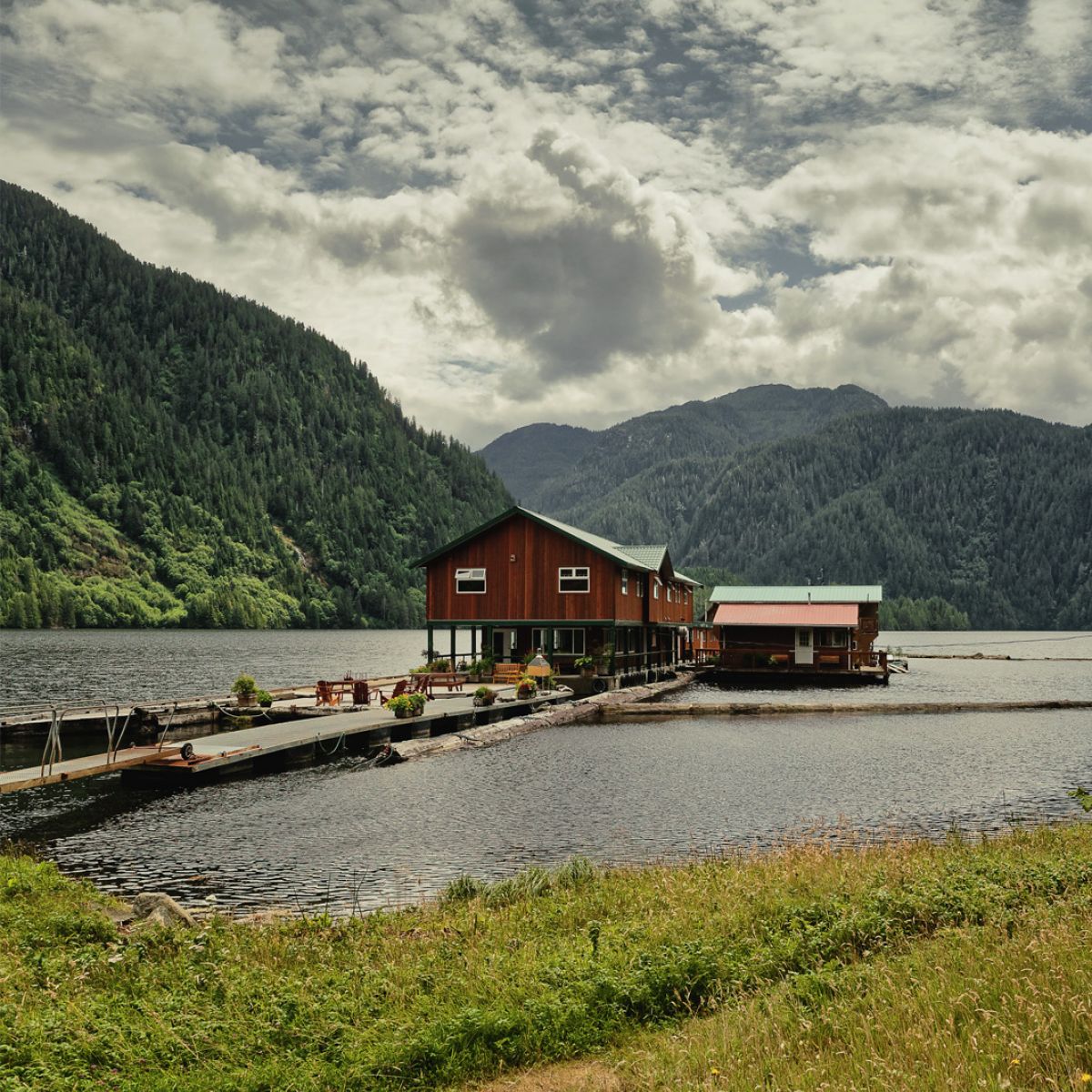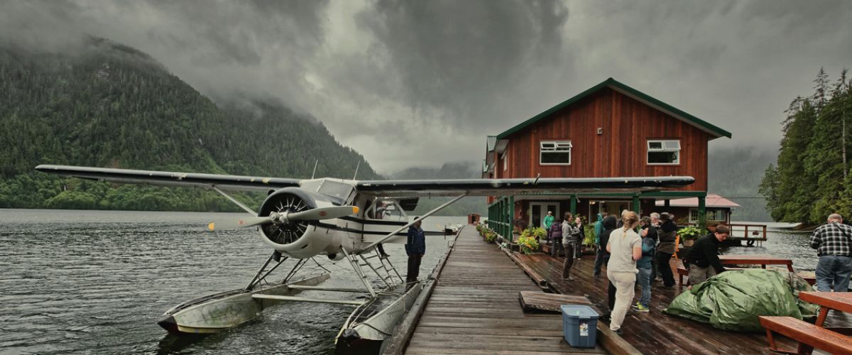 Die Lodge besteht aus einer Ansammlung von bebauten Pontons und liegt am Ende des Smith Inlets ca. 50m vom Festland entfernt „vor Anker“. Ein langer Steg vor dem einstöckigen Gemeinschaftsgebäude mit den Gästezimmern dient als Liegeplatz für drei Safari Boote und die Wasserflugzeuge, die fast täglich hier eintreffen.