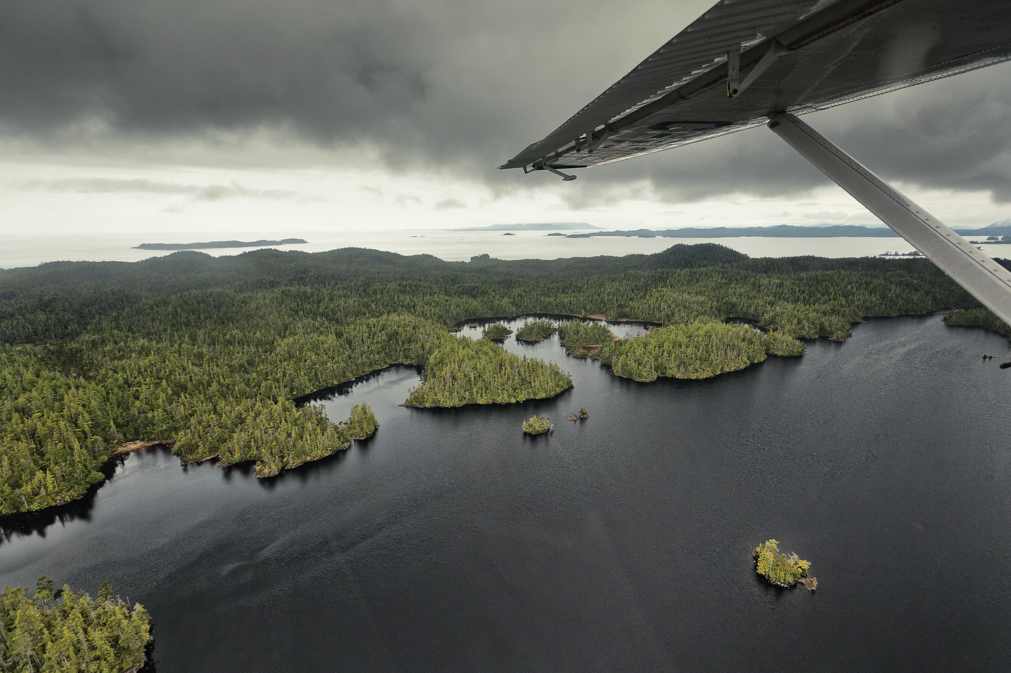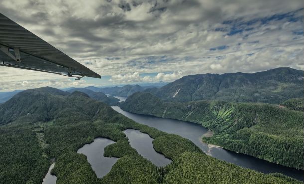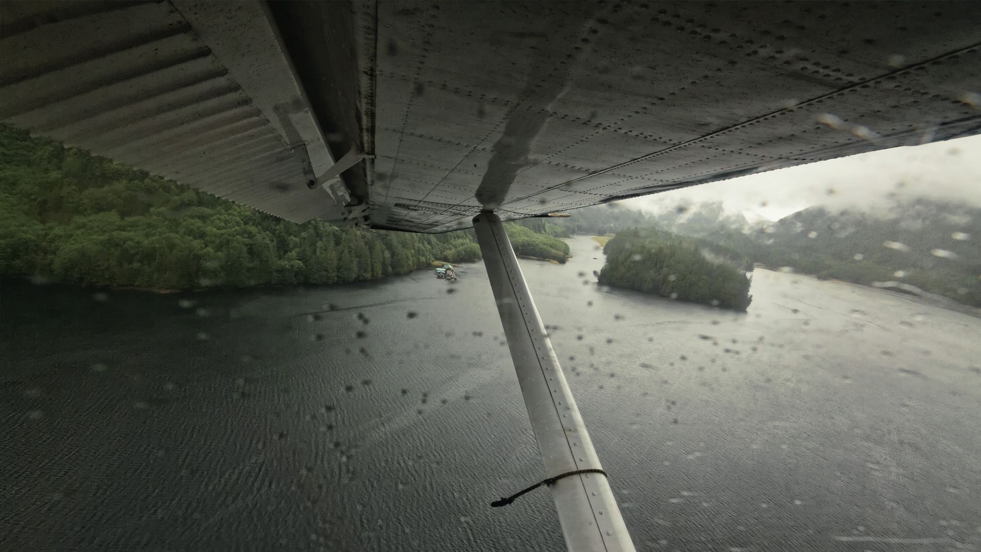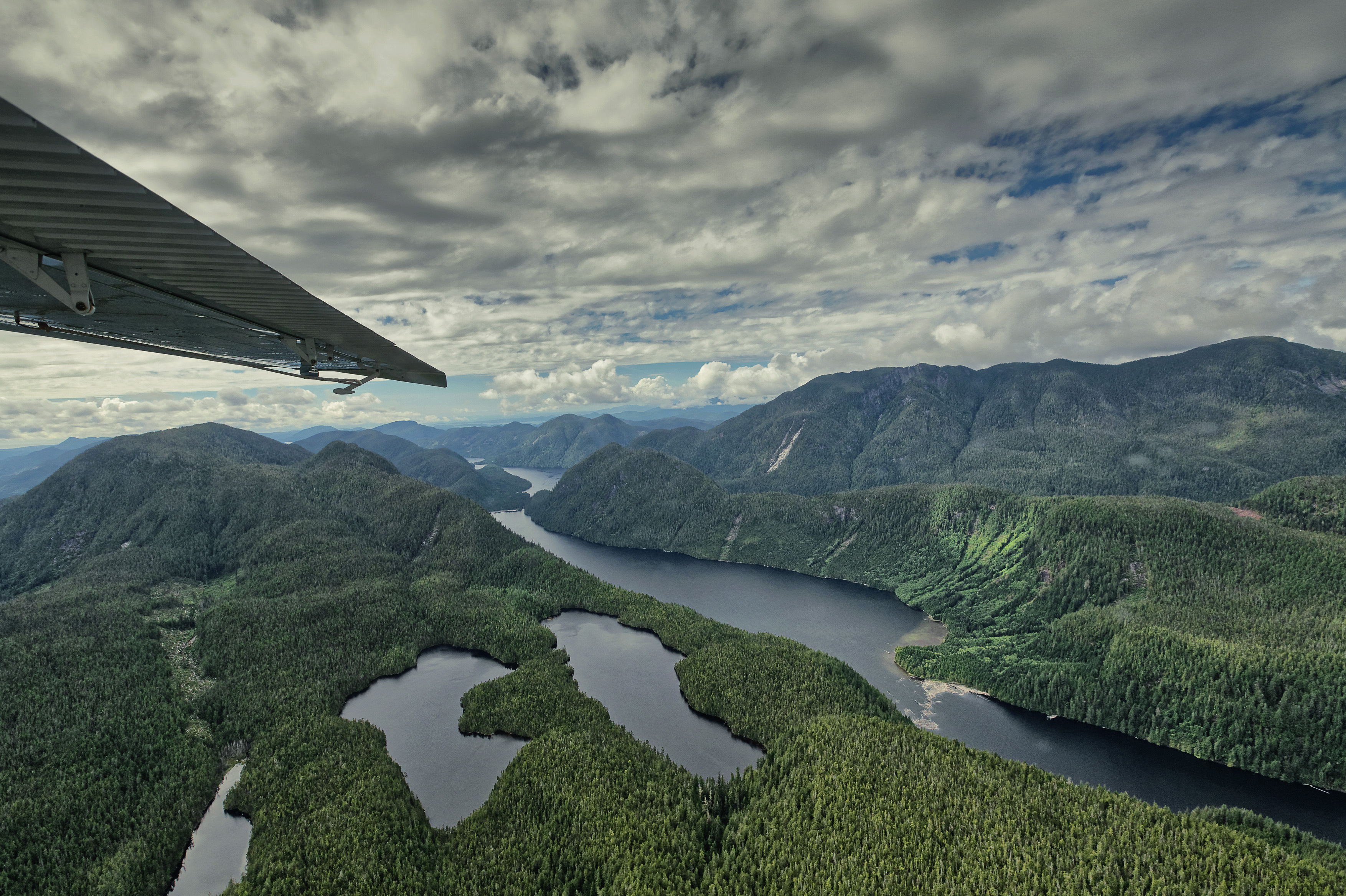 Im Tiefflug geht es mit 204 Km/h über den nördlichen Teil der Johnstone Strait und wir sehen die Baumwipfel recht nahe unter uns vorbeiziehen, als wir das Festland erreichen. Aufgrund des schlechten Wetters müssen wir einen Umweg machen, weil wir auf Sicht(!) fliegen und die Berge meiden. Es fängt zu regnen an und wir hängen bald tief in den Wolken. Waren da nicht Berge irgendwo?