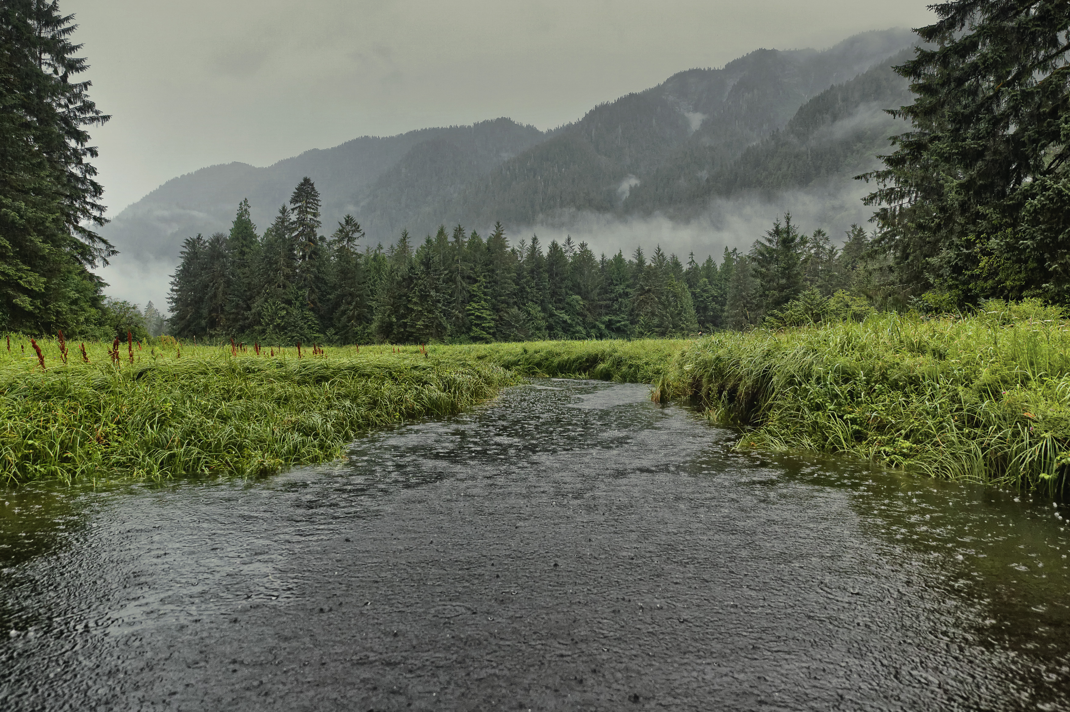 Der Nieselregen, der auf alles einen Wasserschleier legt nervt gewaltig und Anny beschließt, sich von nun an auszuklinken. Wie ein kleiner, nasser Zombie sitz sie im Boot und wartet nur darauf, dass endlich alles vorbei ist. Micha gibt nicht so schnell auf und klammert sich an den Feldstecher, denn die Hoffnung stirbt zuletzt. Wir fahren das ganze Inlet hoch, bis zum höchsten Punkt an dem der Fluss nicht mehr befahrbar ist. Da haben wir in den vergangenen Tagen schon Spuren gefunden. Die Tiere sind da, keine Frage. Aber bei dem Wetter würden wir den Wald auch nicht verlassen wollen.