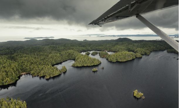 Unser Wasserflugzeug (DHC-2 Beaver) liegt schon am Dock und nachdem unser RV am Seitenstreifen fachmännisch geparkt ist, treffen wir dort Owen aus Australien, Cornelia & Dieter – ebenfalls aus Deutschland. Die Plätze werden zugewiesen und wir krabbeln über die Schwimmer ein paar kleine Sprossen hinauf in den den Flieger. Origami kommt dem gekonnten einfalten auf die Sitze wohl näher als „bequemes Einsteigen“. Nach einem der kürzesten Sicherheitsbriefings der Luftfahrtgeschichte (Das ist Eure Weste und hier geht die Tür auf), zieht uns schon der 450PS starke Pratt & Whitney R-985SB3 (luftgekühlter Neunzylinder-Sternmotor) in den wolkenverhangenen Himmel über Port Hardy.