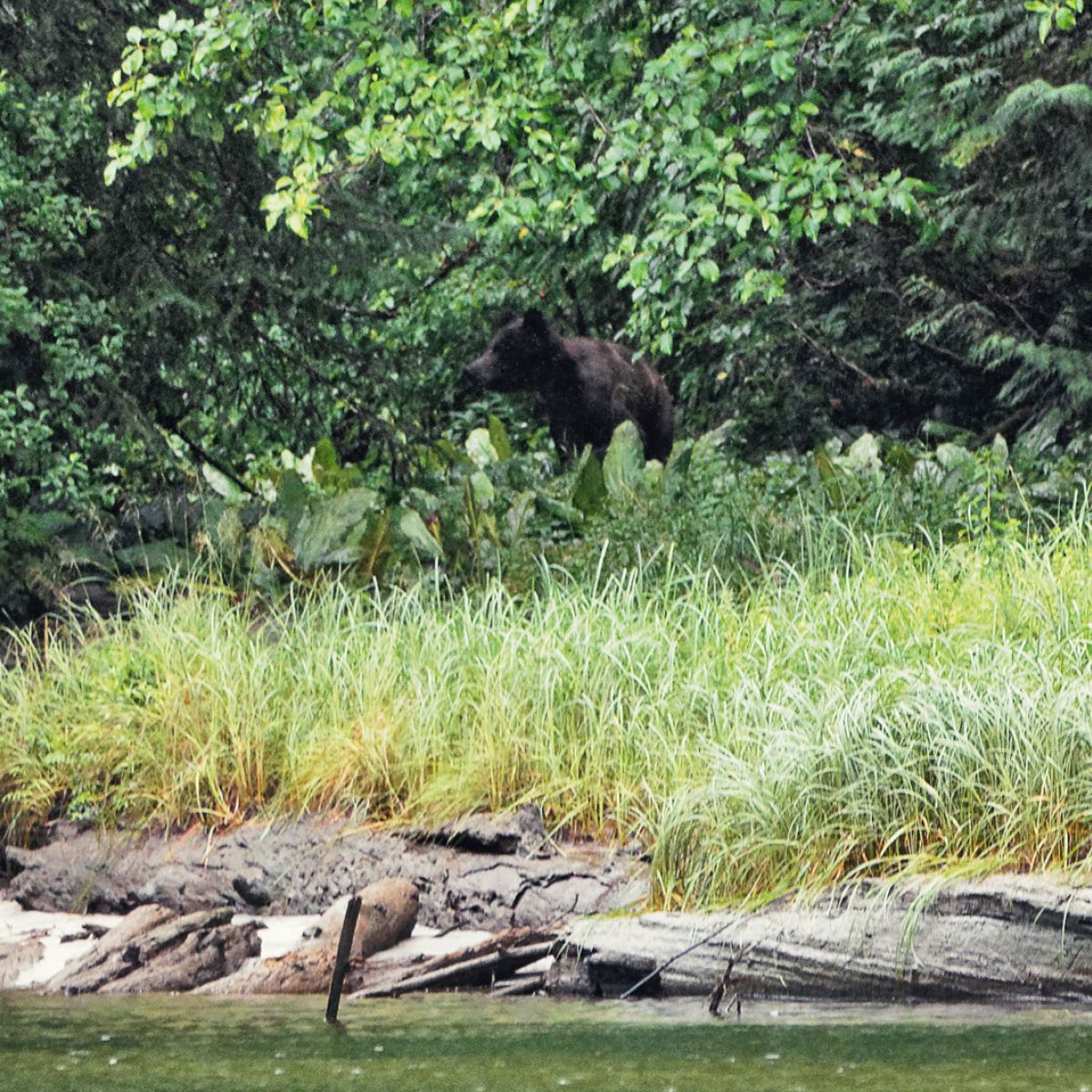 Wir drehen um und sind gerade dabei zurück zu fahren, als unser Guide Marcus plötzlich einen Bären sieht, der hinter unserem Rücken den Fluß durchquert und auf der anderen Seite sofort im Gebüsch verschwindet. Anny ist den Tränen nahe, denn sie hat den Augenblick verpasst, aber die Szene war verdammt schnell vorüber. Außerdem auch schlecht zu orten, wenn man in Millisekunden den richtigen Baum beschreiben will.