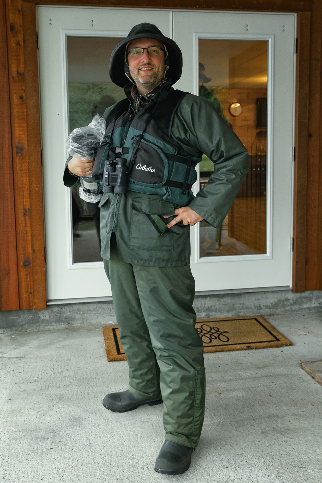 Kurz darauf geht es zur Anprobe unserer Safari Klamotten: einem Strampelanzug aus Neopren in modischen Waldtarnmuster und darüber eine Schicht Ölzeug in Oliv, inklusive einer Art Südwester mit breiter Krempe, damit das Regenwasser nicht in die Kleidung laufen kann. Dazu noch weite gefütterte Gummistiefel , fertig. Das Umziehen im Trockenraum war eine Qual, dafür waren die Klamotten draußen auf dem Wasser ein wahrer Segen.