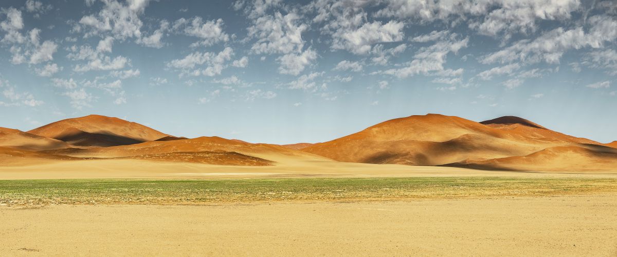 Mit rasanter Geschwindigkeit macht nun der Himmel auf und die geschlossene Wolkendecke reduziert sich auf kleine Popcorn-Wolken, die nun wie kleine weiße Farbtupfer auf blauem Himmel stehen. Wir halten an Düne 40, unseres Erachtens die durchaus hübschere Düne, weil der vom Wind geformte Grat nicht von Menschen bestiegen werden darf und weil dezente Vegetation das Vorfeld dieses kolossalen Sandbergs schmückt.
