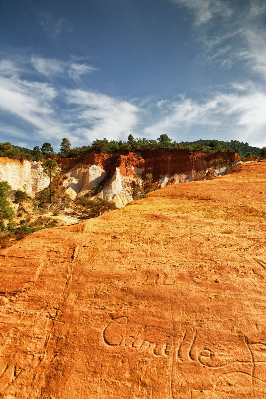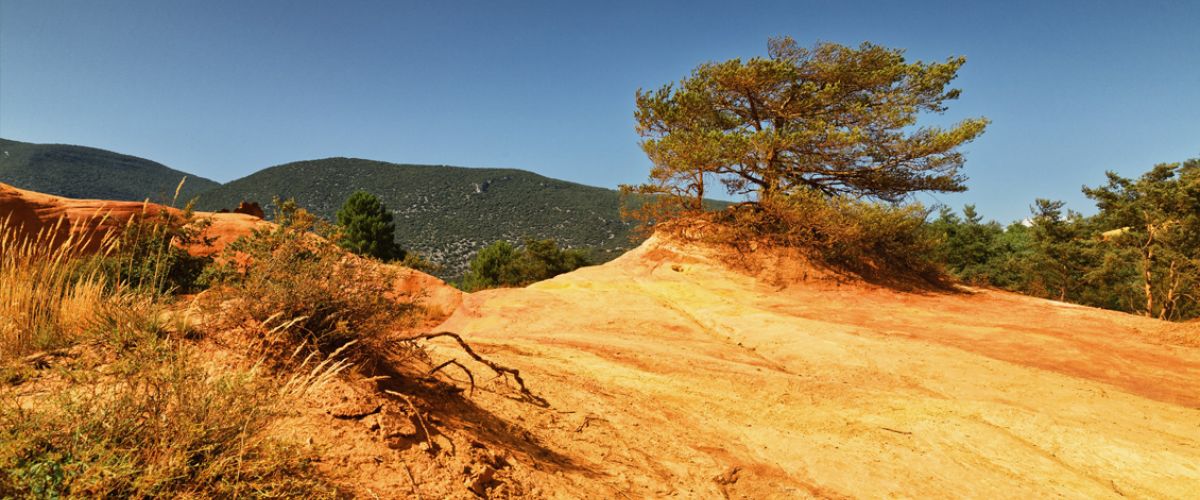 Und da wir heute schon im Thema Ocker sind, schauen wir uns am späten Nachmittag die Ockerbrüche von Rustrel an. Die Ockerfelsen liegen gut verteilt, die prächtigsten lassen sich aber in relativ kurzer Zeit zu Fuß erwandern. Am schönsten sind die Skulpturen am Chemin des fées, die wie Nadeln in den Himmel ragen. Die vielfältigen Farbtöne des Ockers bieten einen tollen Anblick. Man gewöhnt sich so daran, dass man die Welt um sich herum fast als farblos empfindet, wenn man die Ockerbrüche wieder verlässt. Für uns Fotografen bietet sich hier eine ungeahnte Vielfalt an Motiven, besonders einzelne Bäume und Pflanzen, die direkt auf dem ockerfarbenen Boden wachsen.