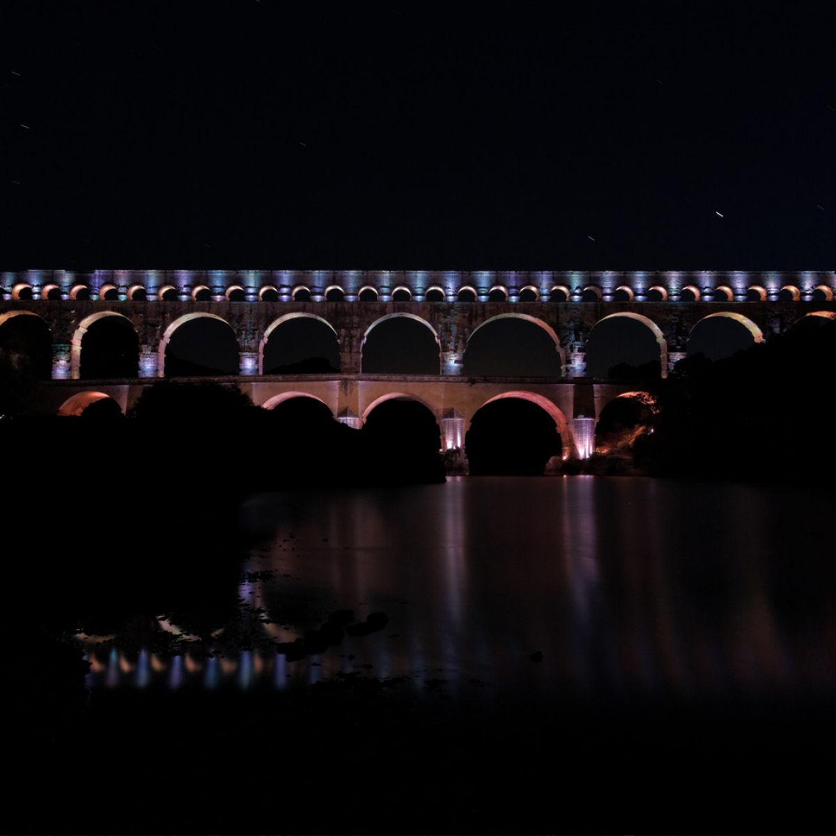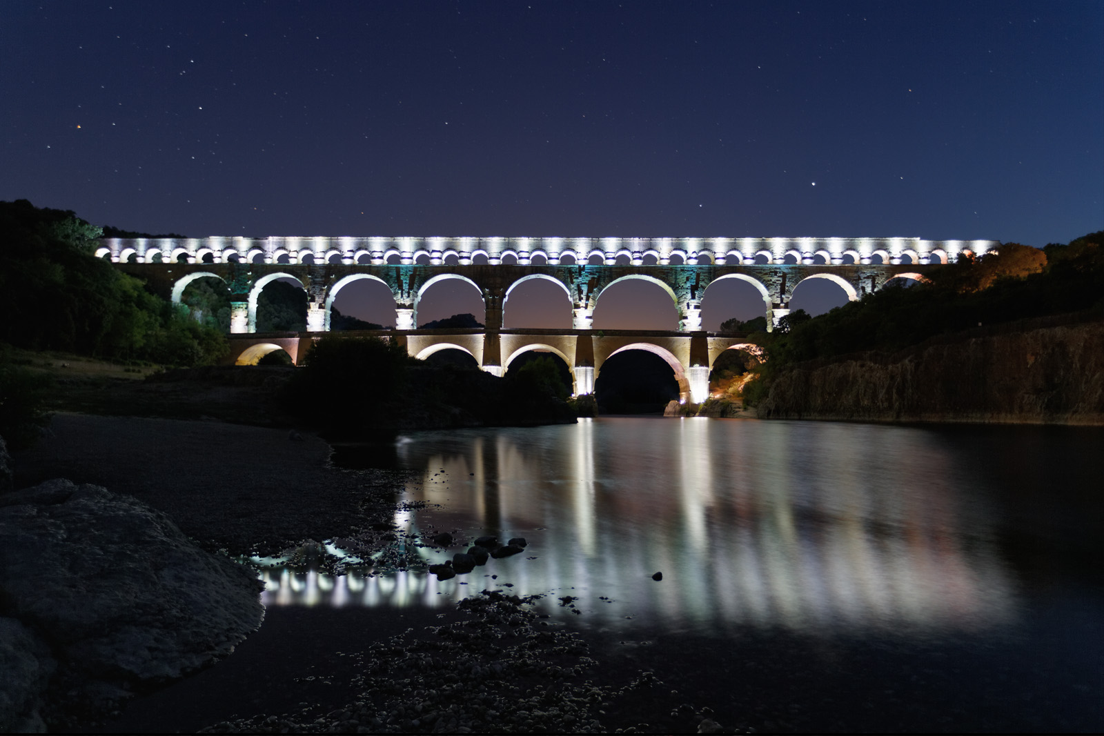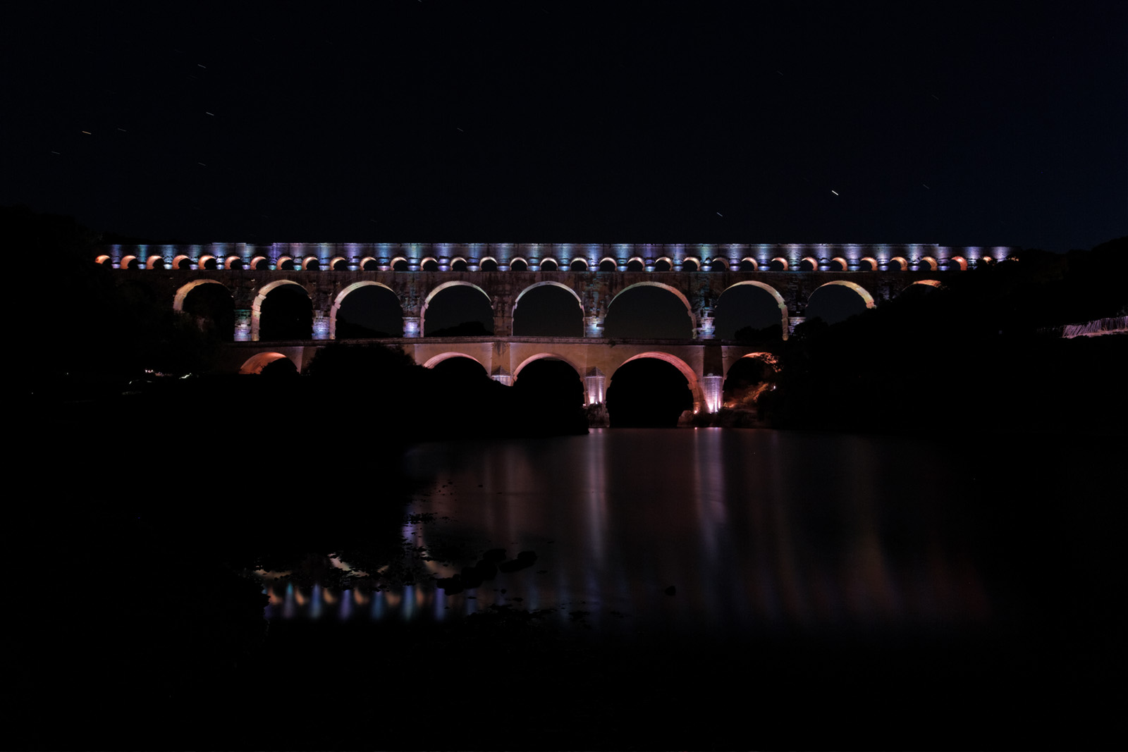 Nachdem wir das knapp 50 m hohe und 275 m lange (obere Ebene) Aquädukt von allen erdenklichen Seiten abgelichtet haben, holen wir unseren Picknickkorb und machen es uns am Strand direkt am Gardon gemütlich, wo man extra kleine überdachte Plattformen für die Gäste gebaut hat. Bei Baguette, Salami, Schinken und Käse genießen wir den Sonnenuntergang und die beginnende Light-Show mit einem wohltemperierten Schluck Rotwein.