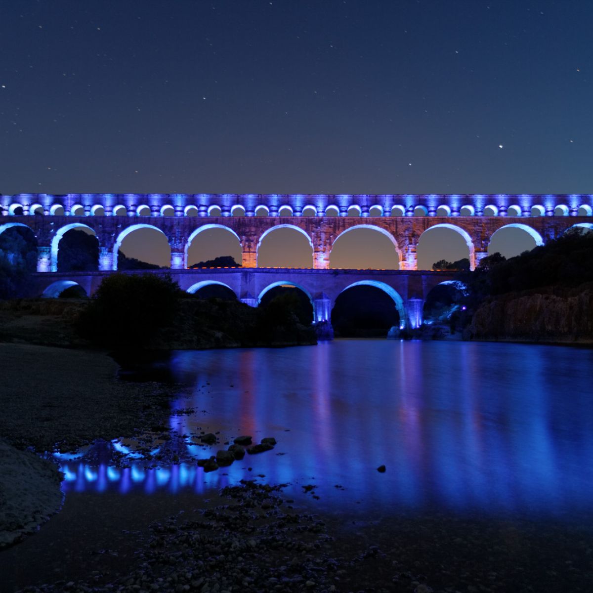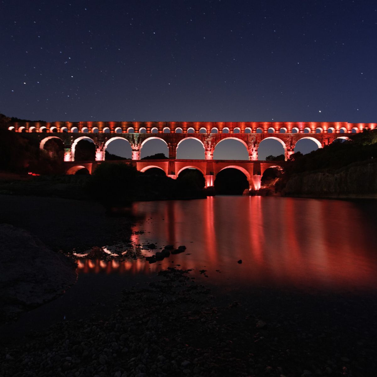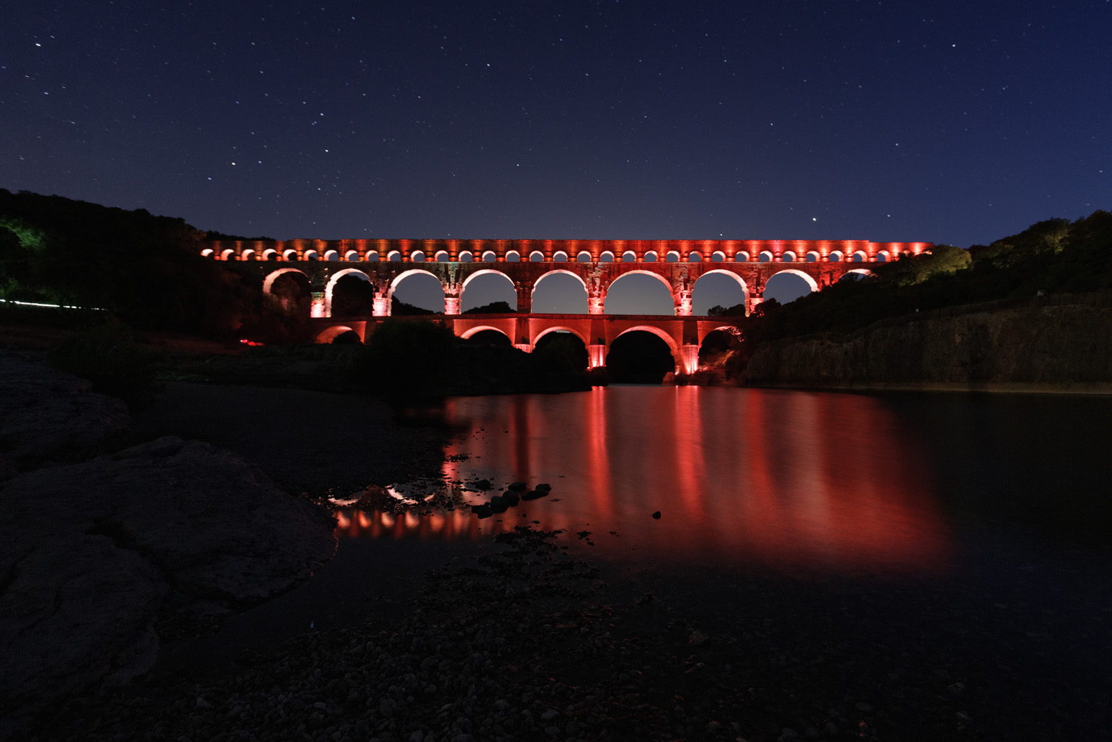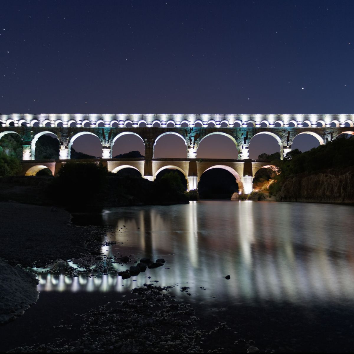 Nachdem wir das knapp 50 m hohe und 275 m lange (obere Ebene) Aquädukt von allen erdenklichen Seiten abgelichtet haben, holen wir unseren Picknickkorb und machen es uns am Strand direkt am Gardon gemütlich, wo man extra kleine überdachte Plattformen für die Gäste gebaut hat. Bei Baguette, Salami, Schinken und Käse genießen wir den Sonnenuntergang und die beginnende Light-Show mit einem wohltemperierten Schluck Rotwein.