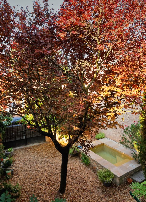Nach den ersten fünf Minuten haben wir schon Stiche abbekommen, die es in sich haben. Aber wir lassen uns nicht beirren und genießen den Abend im Hof unter dem Blätterdach eines roten Ahorns bei Weißwein, Baguette, Käse, Salami und Oliven.