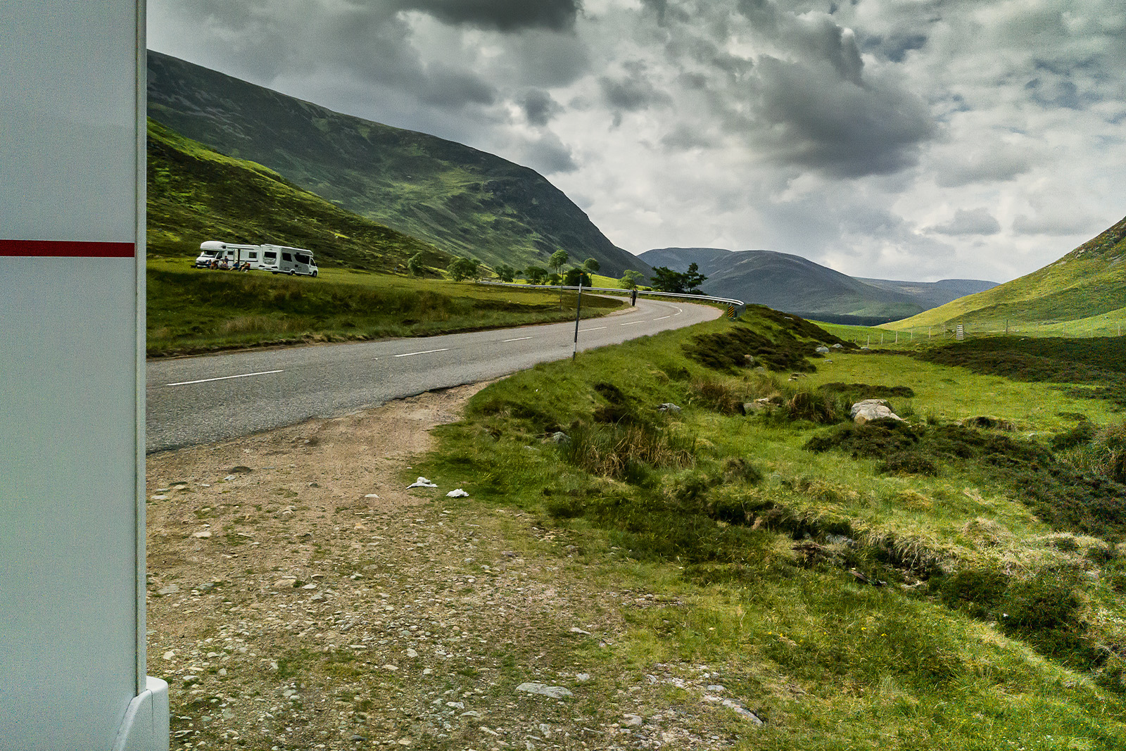 Also machen wir uns wieder auf den Weg und folgen der Wegbeschreibung der Besitzer zu einem Parkplatz, auf dem wir wild campen können. Was nach 20 Minuten Fahrt klingt, werden eineinhalb Stunden. Aber jede Minute lohnt sich und wir sind froh, dass wir bei wenig Verkehr unseren Lkw zwischendurch mal kurz am Straßenrand anhalten können. Wir folgen der Old Military Road und fahren relativ schnell in den Nationalpark über Glenshee nach Norden. Die Landschaft ist spektakulär und das Abendlicht wunderschön und es hat überall kleine Parkbuchten abseits der Straße, die sich super für die Nacht eignen.