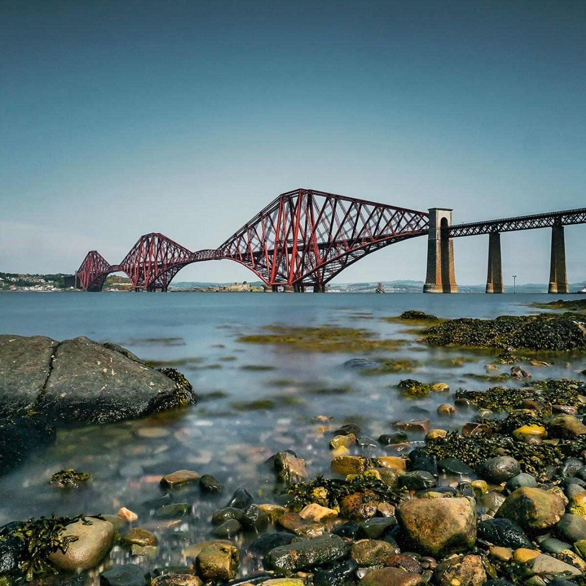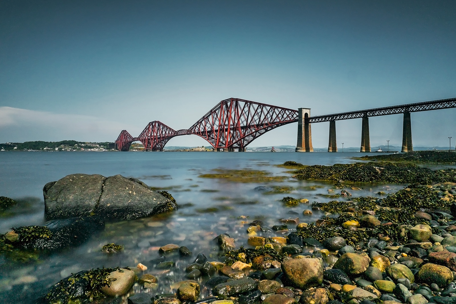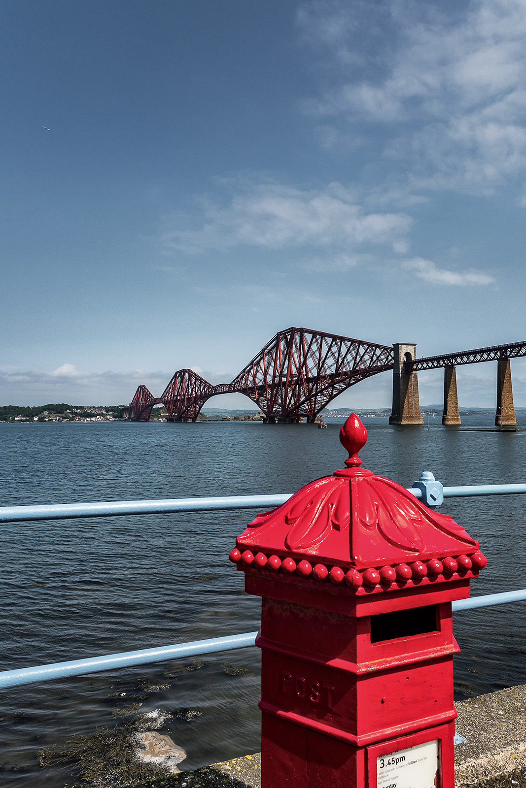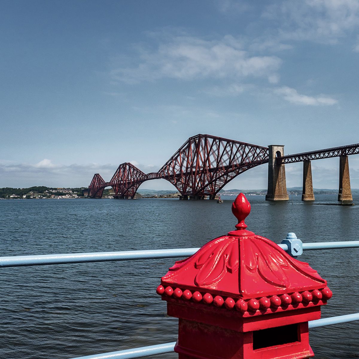 Wir fahren weiter nach South Queensferry an den Firth of Forth, um uns die spektakuläre zweigleisige Eisenbahnbrücke anzuschauen, die bei ihrer Eröffnung im Jahr 1890 die größte Spannweite aller Brücken weltweit hatte. Die 2523 Meter lange Stahlkonstruktion leuchtet knallrot unter einem blauen Sommerhimmel, fast ohne Wolken. Im Westen liegen zwei weitere Brücken – die alte Forth Road Bridge und die nagelneue New Forth Road Bridge. Aber zuerst einmal zwängen wir unser Wohnmobil durch die enge, einspurige Hauptstraße des kleinen, beschaulichen Hafenstädtchens und sind heilfroh, als wir auf einem großen Parkplatz unweit der Brücke einen Platz für unser Gefährt finden.