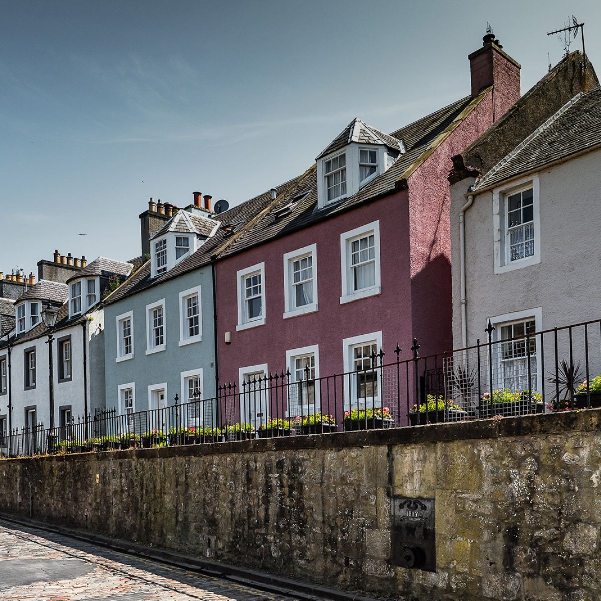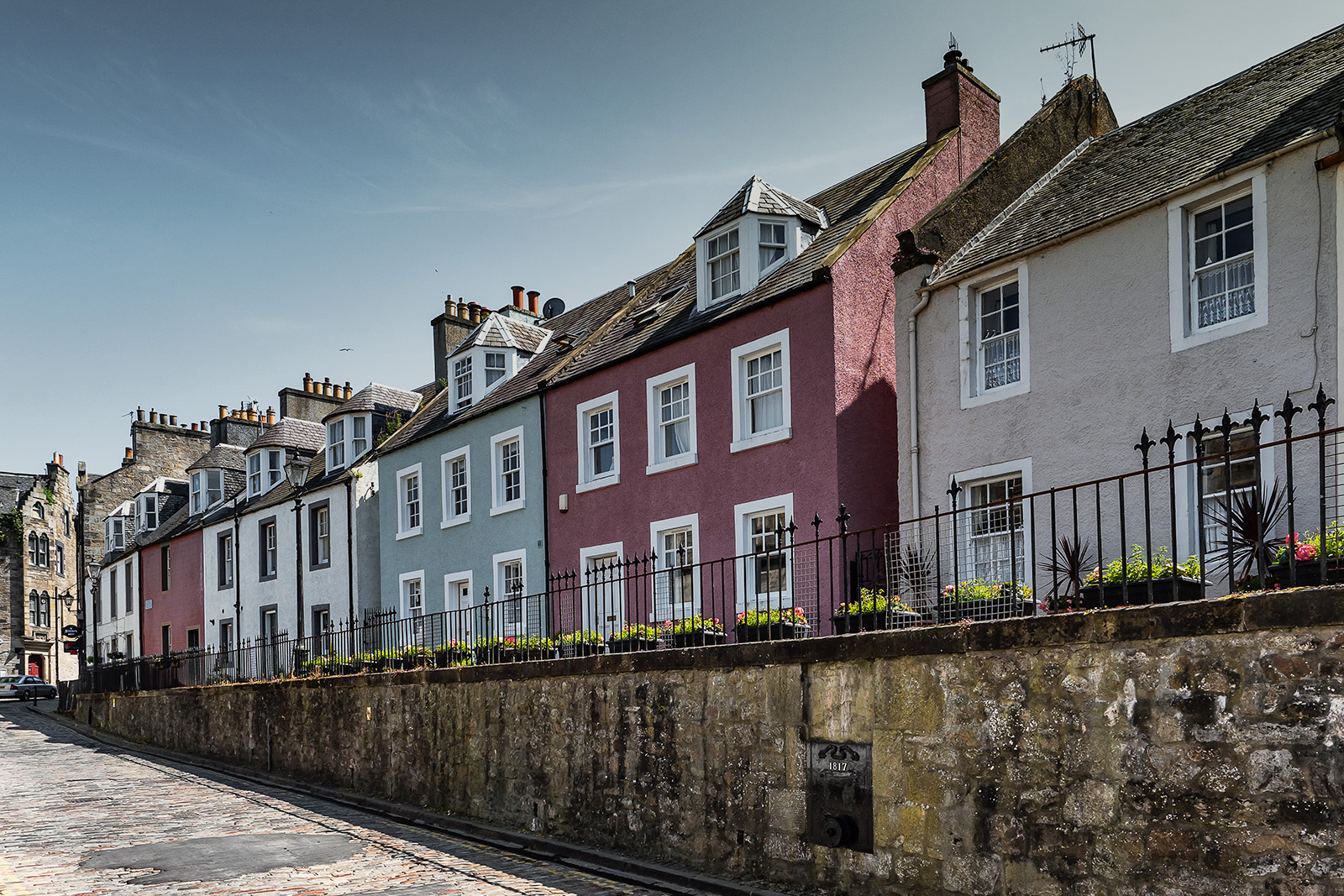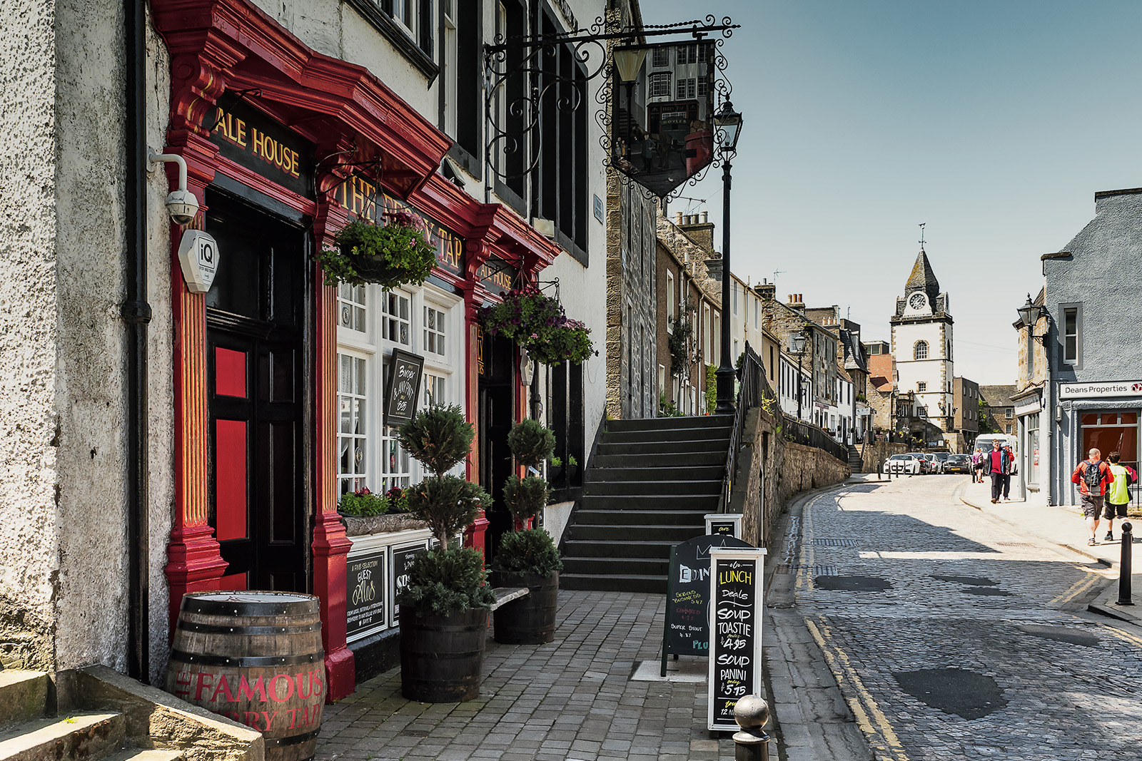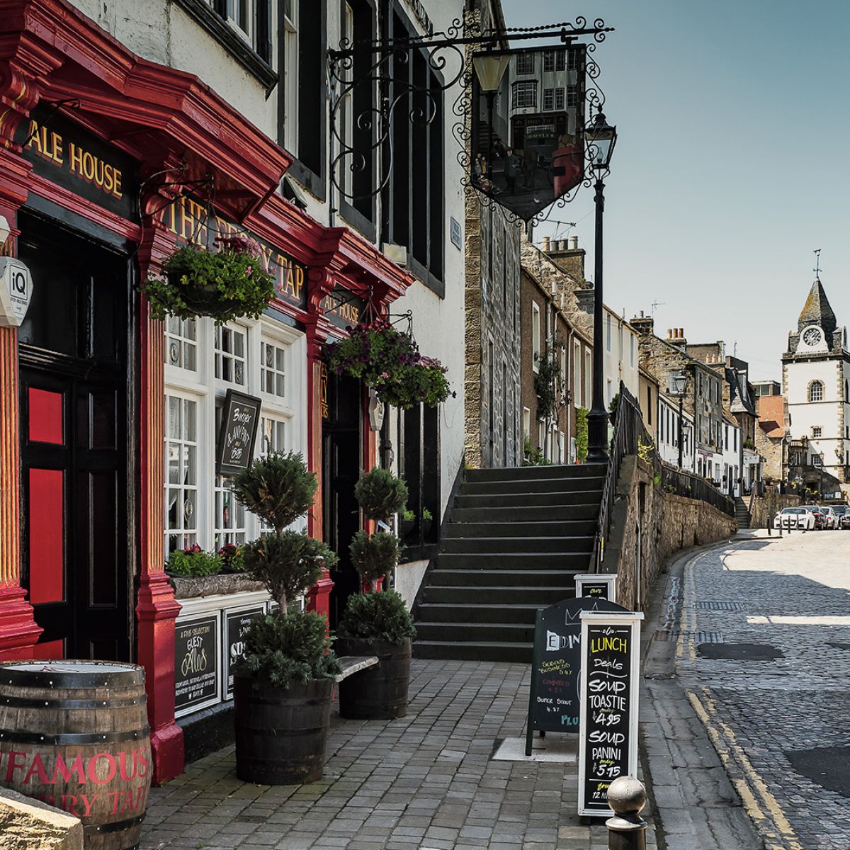 Wir fahren weiter nach South Queensferry an den Firth of Forth, um uns die spektakuläre zweigleisige Eisenbahnbrücke anzuschauen, die bei ihrer Eröffnung im Jahr 1890 die größte Spannweite aller Brücken weltweit hatte. Die 2523 Meter lange Stahlkonstruktion leuchtet knallrot unter einem blauen Sommerhimmel, fast ohne Wolken. Im Westen liegen zwei weitere Brücken – die alte Forth Road Bridge und die nagelneue New Forth Road Bridge. Aber zuerst einmal zwängen wir unser Wohnmobil durch die enge, einspurige Hauptstraße des kleinen, beschaulichen Hafenstädtchens und sind heilfroh, als wir auf einem großen Parkplatz unweit der Brücke einen Platz für unser Gefährt finden.