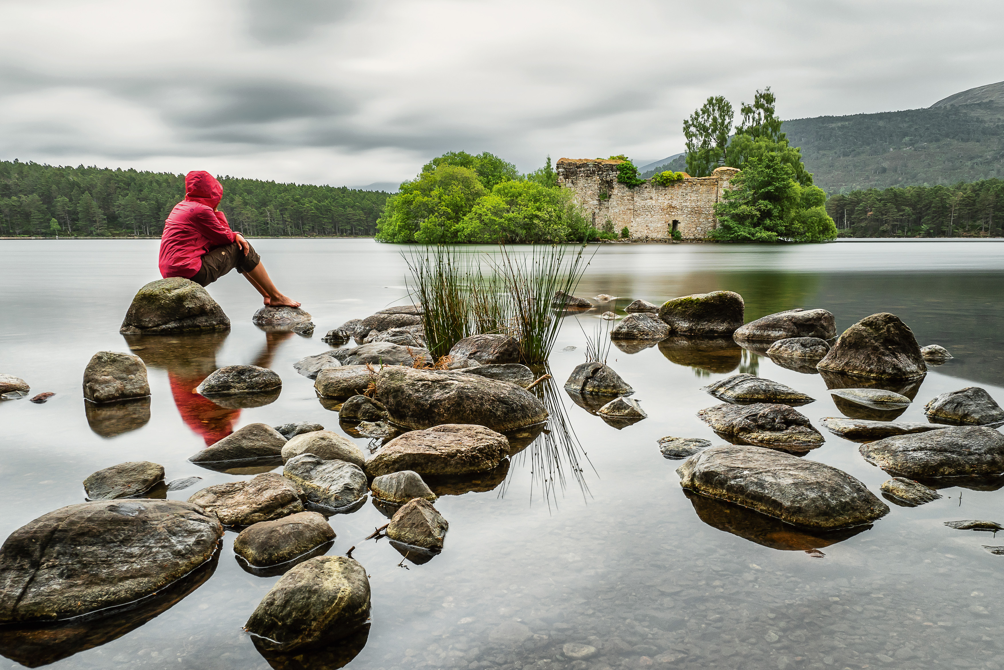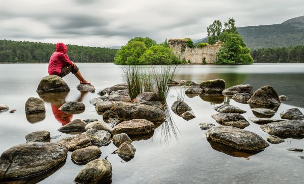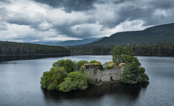 Es geht nach Süden – wir folgen dem Spey und freuen uns an der sanften, hügeligen Landschaft, durch die sich das schwarze Wasser zieht. Das nächstes Ziel ist Loch an Eilean, ein kleiner See im Tal des Spey in der Nähe von Aviemore. Das besondere an diesem See ist eine kleine Burgruine, die auf einer Insel am Rande des Sees sitzt und ursprünglich durch eine Brücke mit dem Festland verbunden war – und jetzt natürlich ein tolles Fotomotiv abgibt. Im 18. Jahrhundert wurde die Anlage aufgegeben, da sie nicht mehr den militärischen Erfordernissen entsprach.