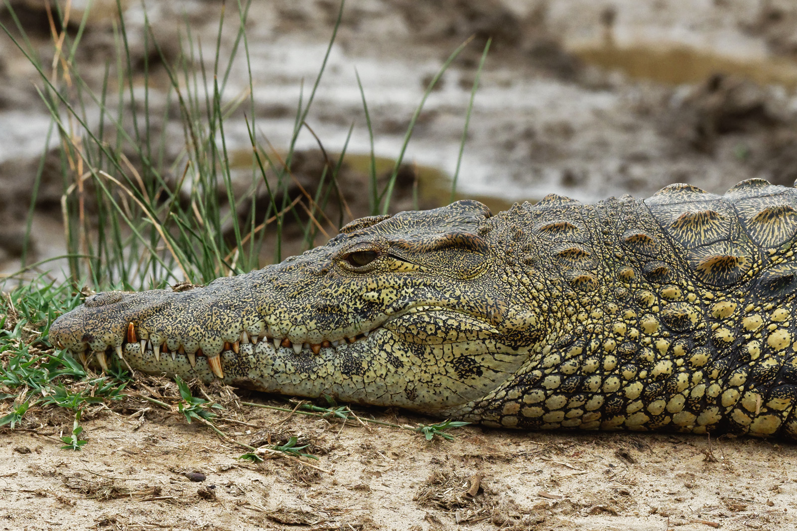 Wir drehen ab, lassen beide Tiere in Ruhe und widmen uns der Ansammlung von Tieren direkt vor uns. Am Ufer im Hintergrund liegen reglos zwei mächtige Krokodile und wir sind beeindruckt von ihrer Größe.