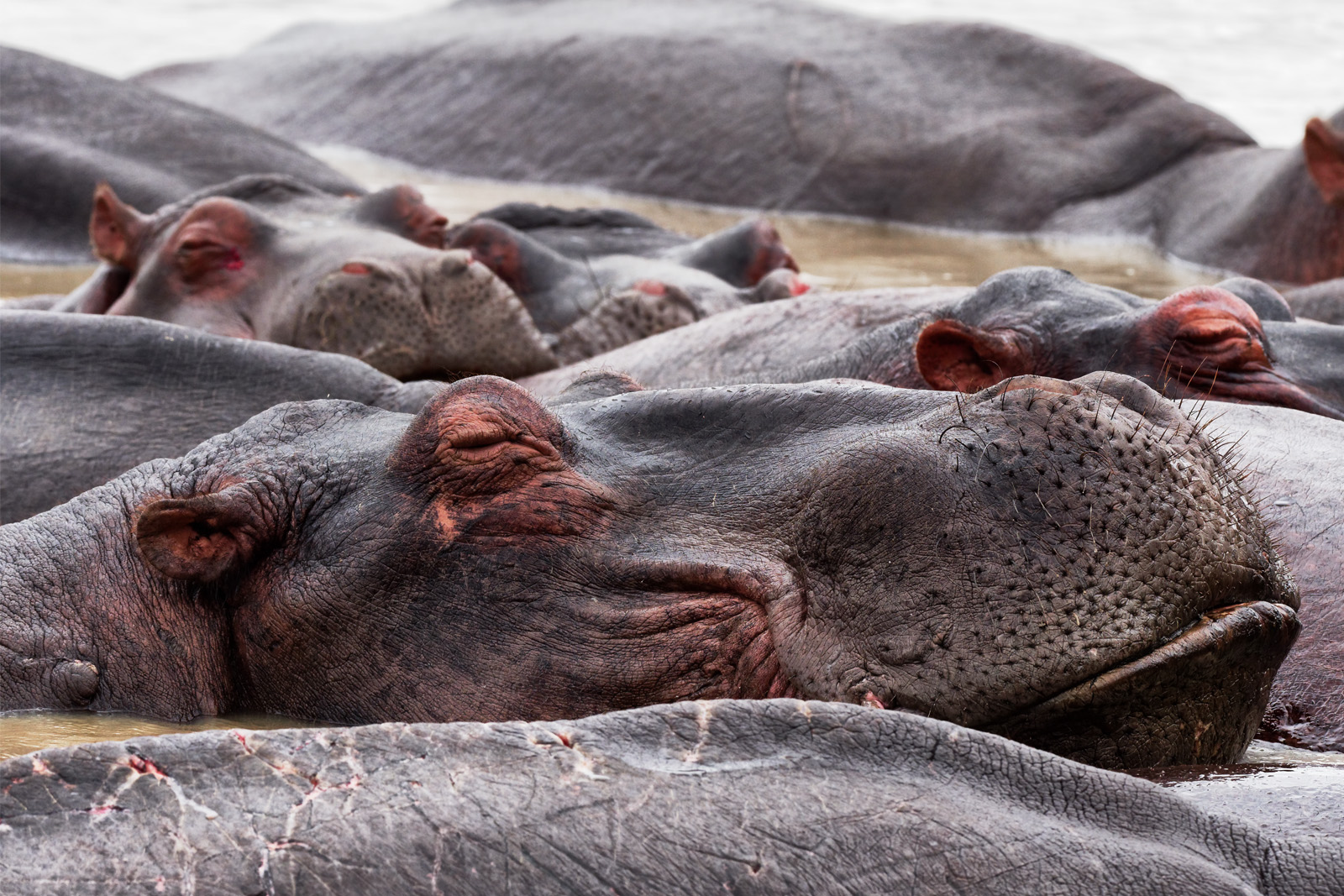 Ein wenig später finden wir eine noch größere Gruppe am Flussufer aneinander gekuschelt und ein paar Meter davon entfernt entdecken wir eine junge Mutter, die ihren winzigen Nachwuchs vor den neugierigen Booten zu schützen versucht. Das kleine Flusspferd beobachtet uns nervös mit weit aufgerissenen Augen und sucht ängstlich den Kontakt zur seiner Mama.
