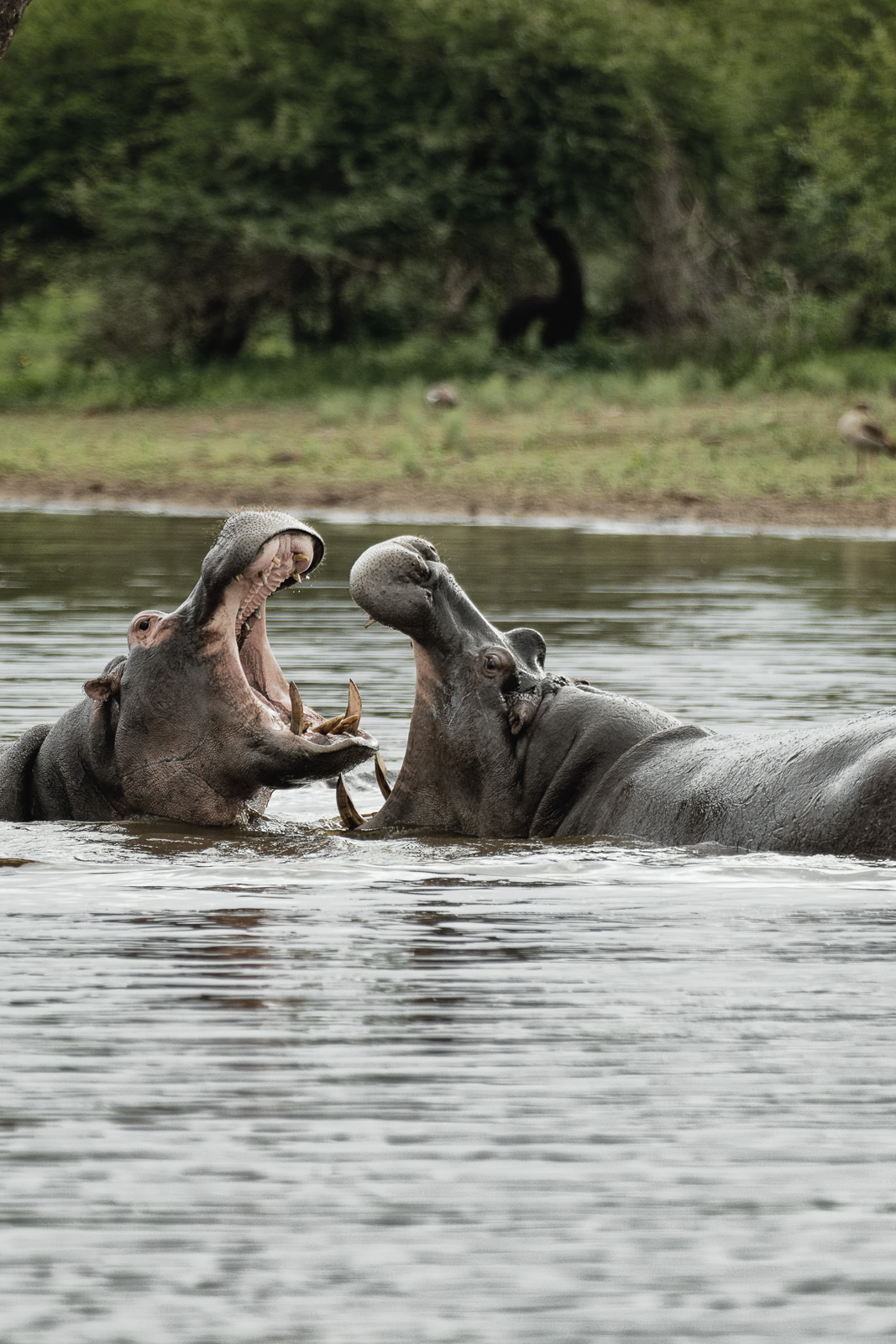 Kurz vor dem Abzweig zur Tshokwane Road / Crocodile Bridge kommen wir an ein Wasserloch, an dem sich eine Gruppe Flusspferde tummeln und zwei Bullen ausgiebig miteinander rangeln.