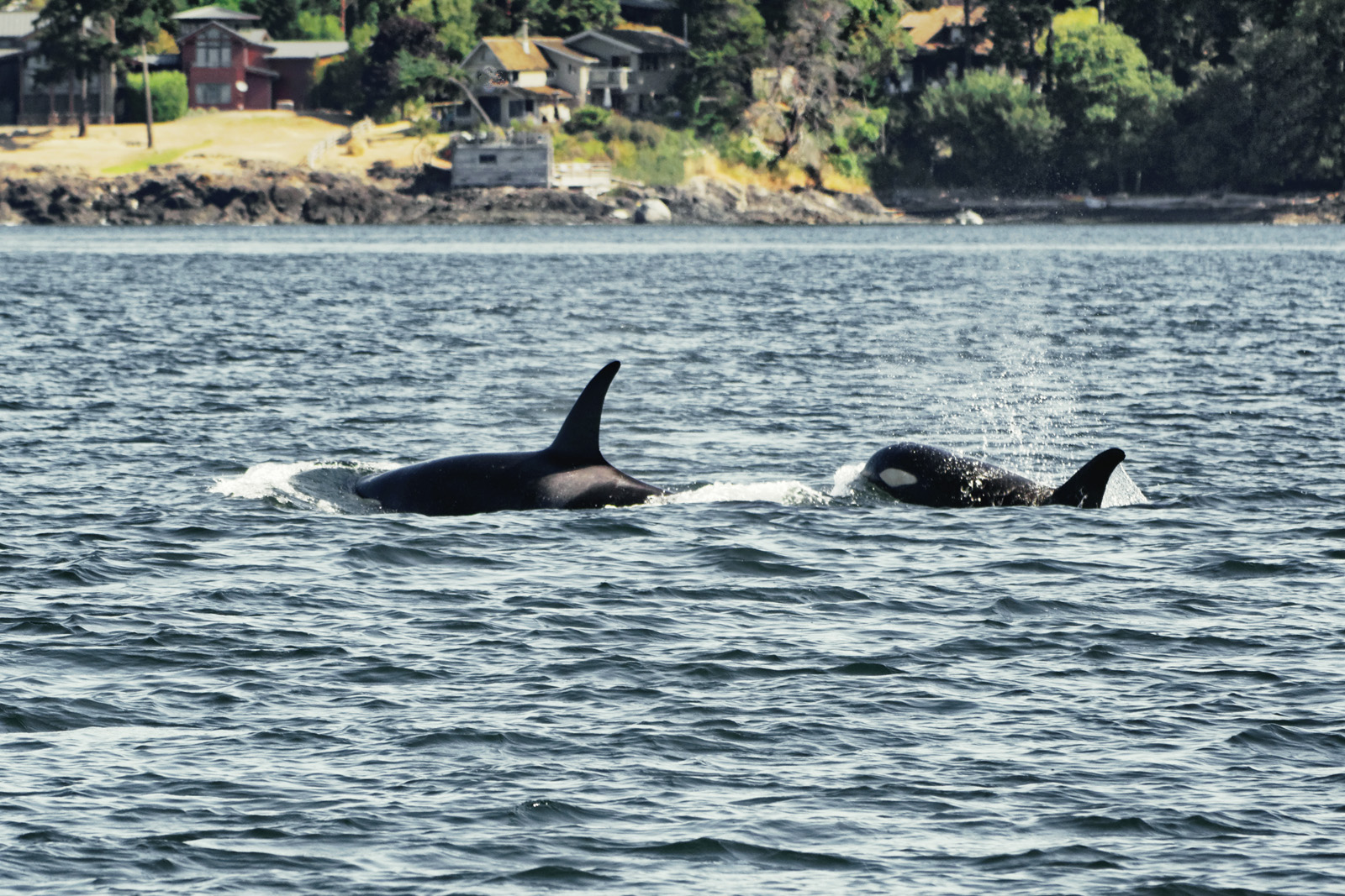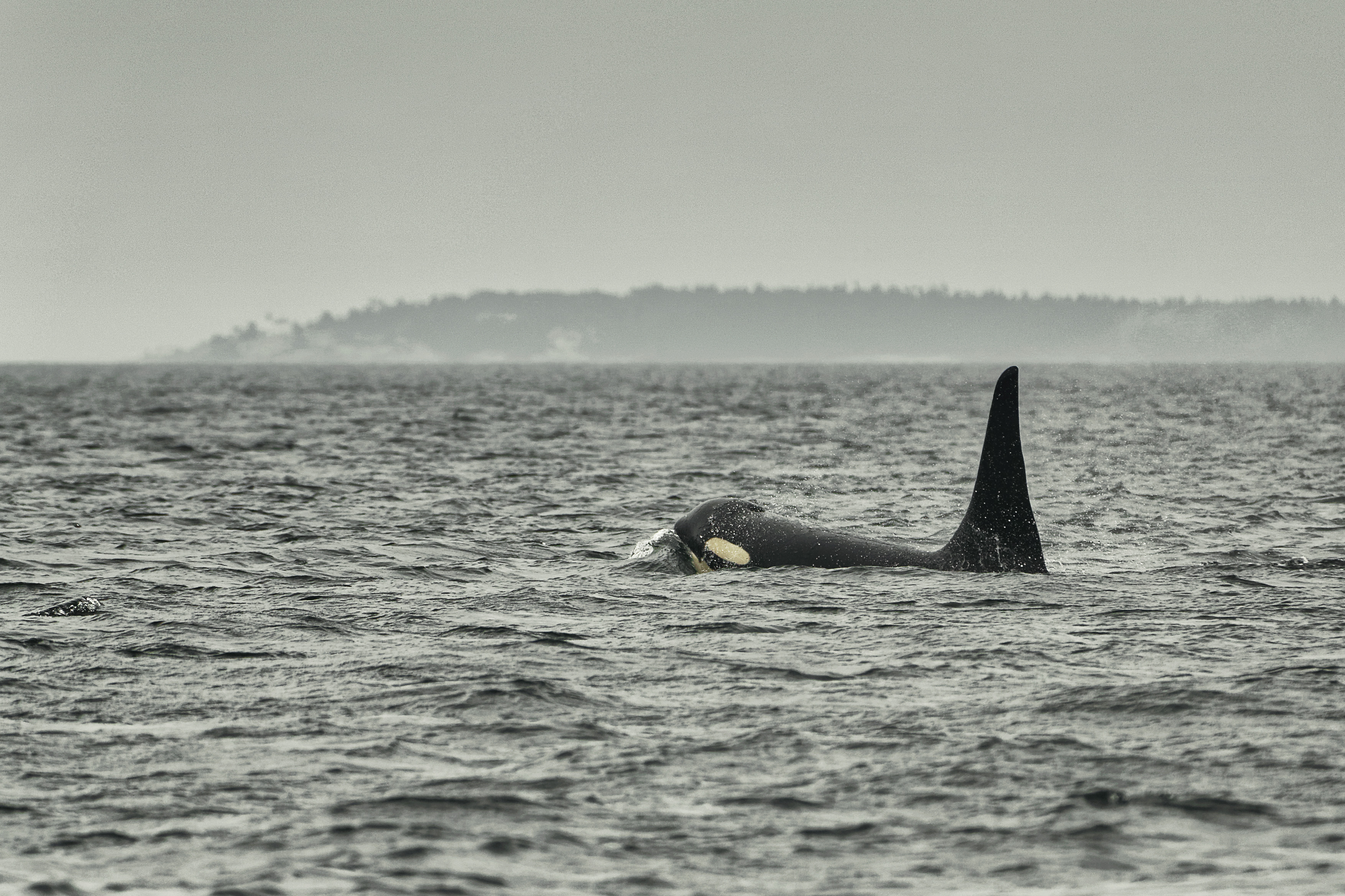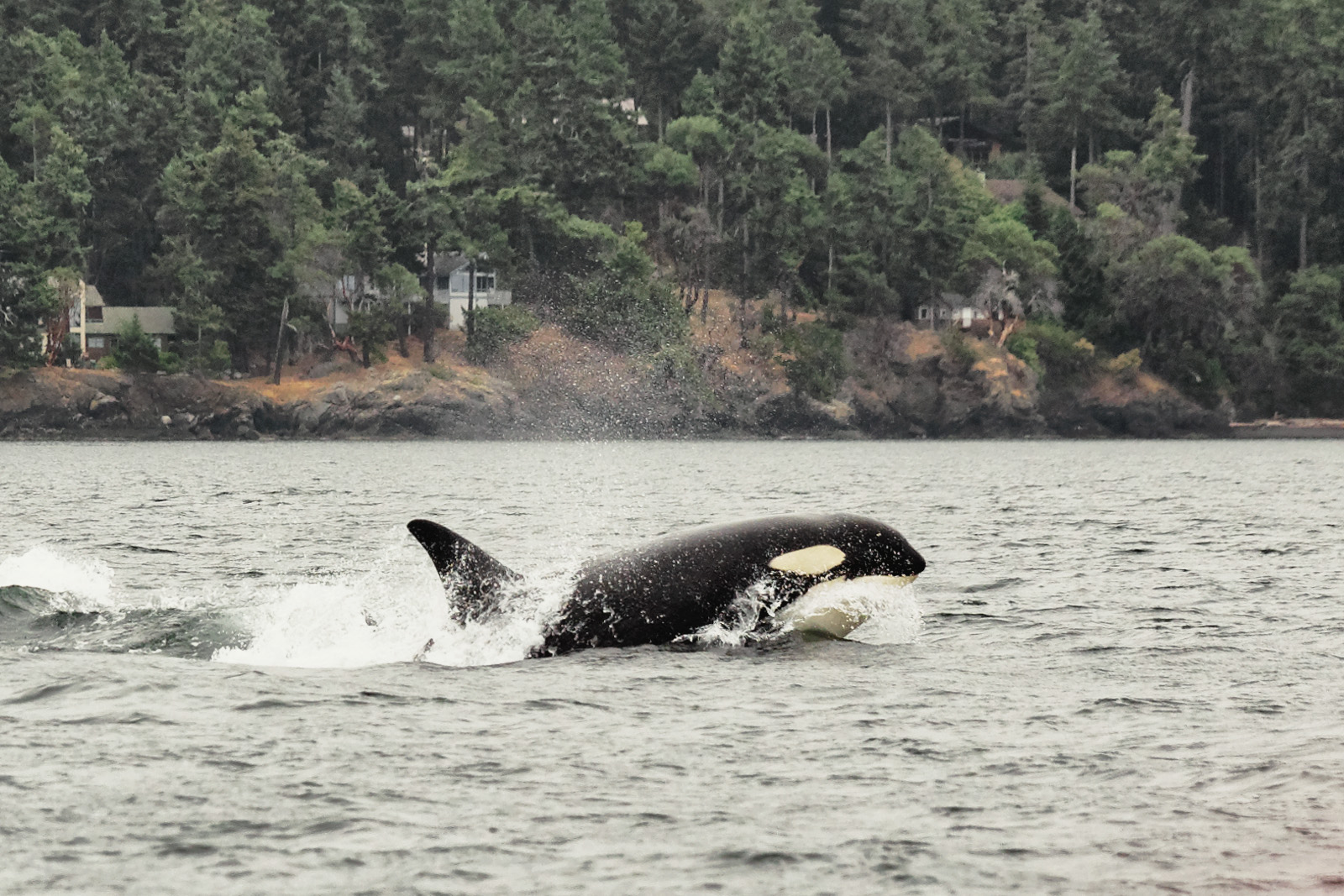 Plötzlich dreht das Boot scharf nach Backbord ab und der Captain teilt uns mit, dass weiter im Norden eine Gruppe von Transcendences in der Haro Strait gesichtet wurden. Wir hangeln uns am Küstensaum der San Juan Insel entlang und folgen einer kleiner Gruppe von Orcas, die mit schöner Regelmäßigkeit an der Wasseroberfläche erscheinen.