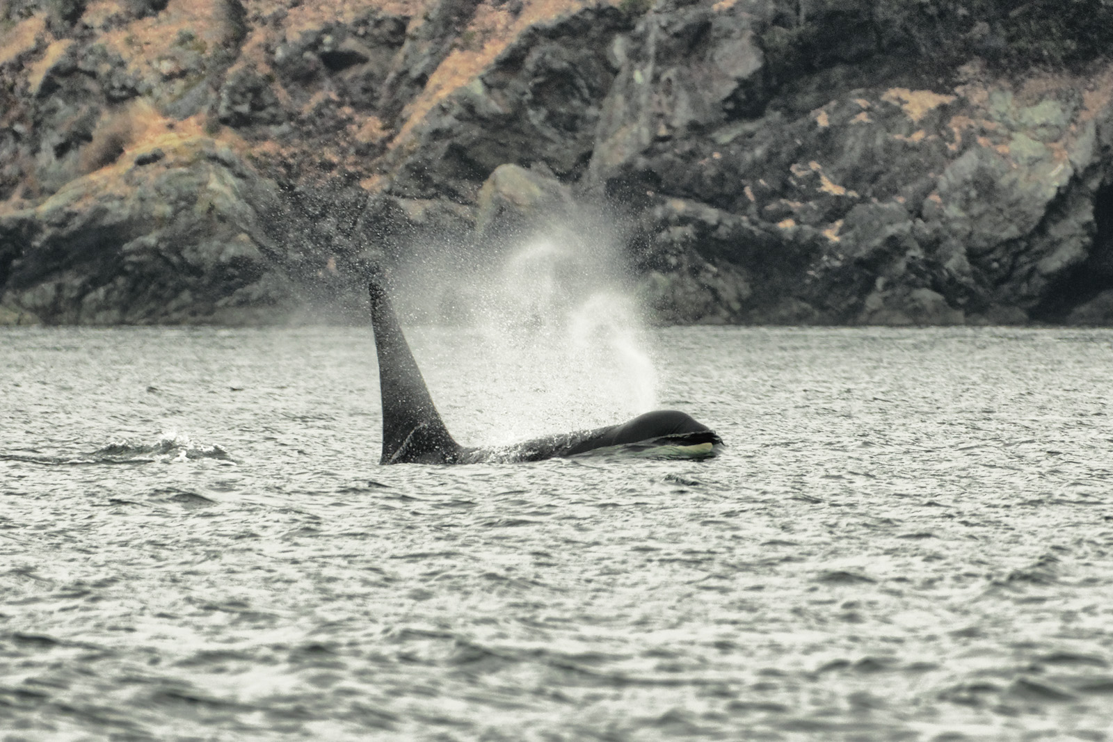 Bannmeile dieses Mal nicht, denn wir waren ja zuerst da. Die Orcas sind flink unterwegs und es ist sehr schwer den genauen Punkt zu erwischen, an dem ein Tier zum Atmen an die Oberfläche kommt. Aber spektakulär ist das Schauspiel allemal! Viel zu schnell geht es wieder auf den Rückweg, ein kleiner Abstecher zu einer