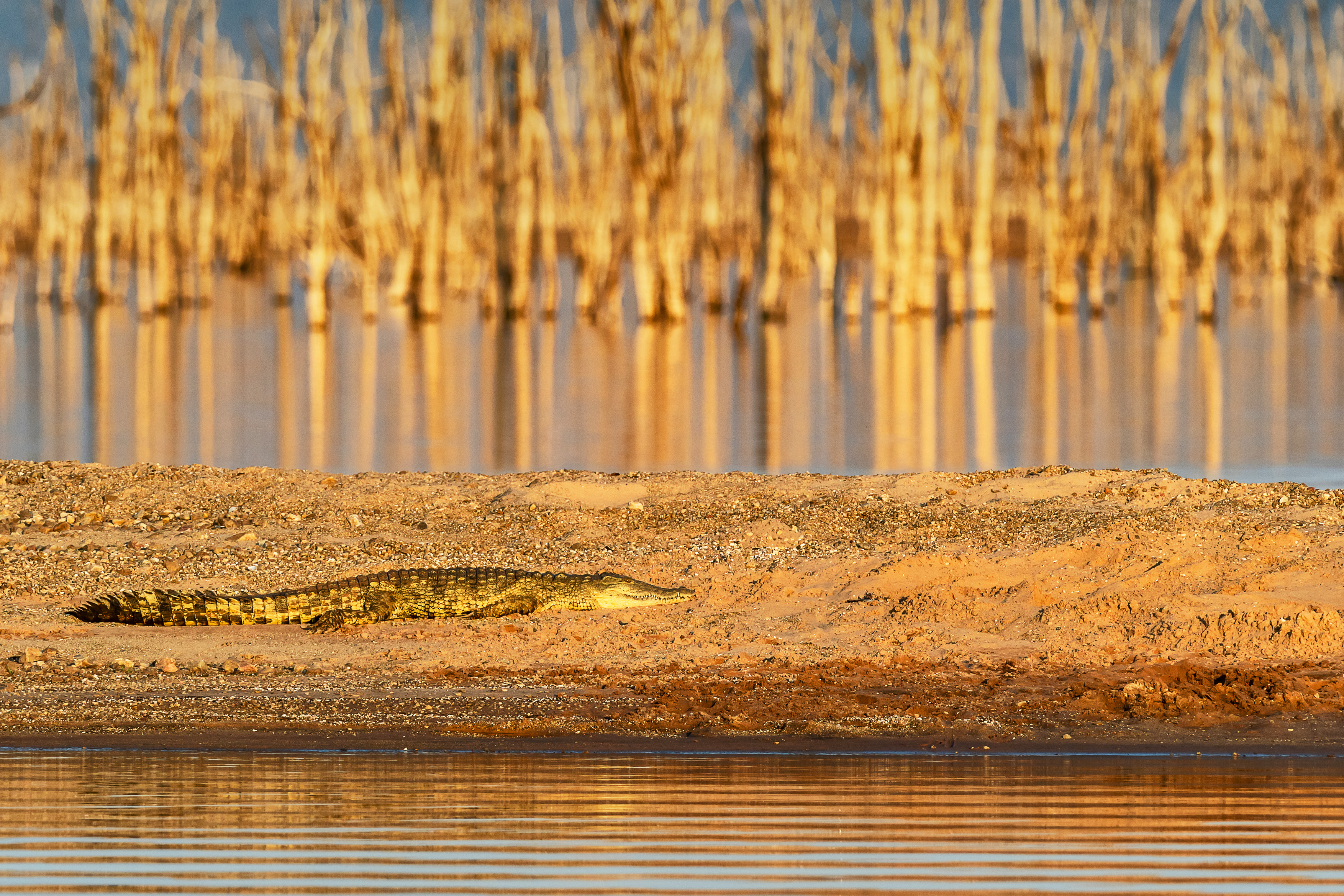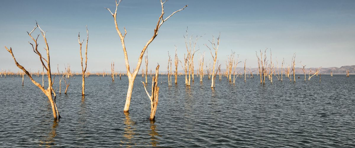 Als wir das gegenüberliegende Ufer erreichen, fährt unser Boot vorsichtig um die toten Mopane Bäume, die zu hunderten im Wasser stehen, herum und legt an.