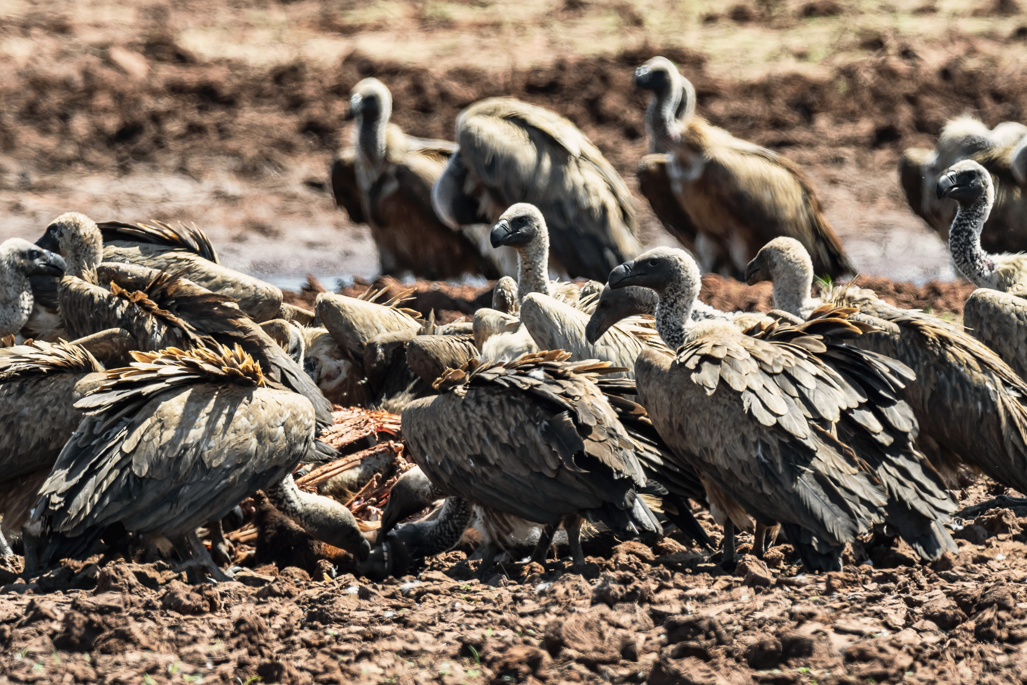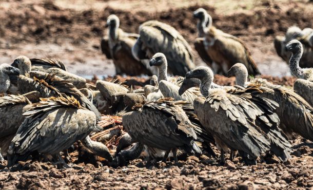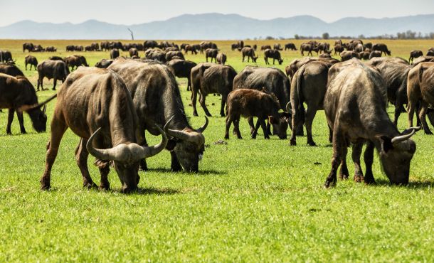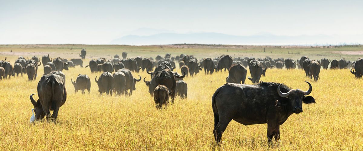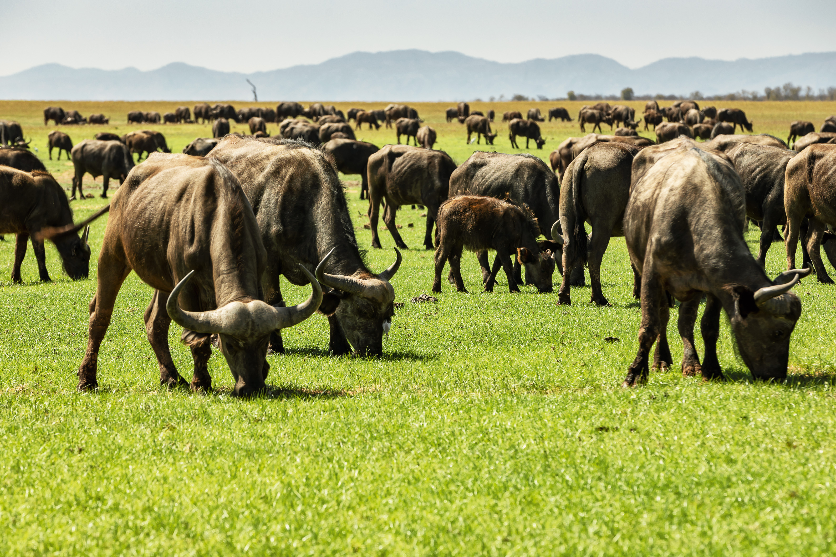Das Gras leuchtet unter einem schier endlos blauen Himmel, der Wind weht angenehm, das Wetter ist perfekt! Wir tauchen in eine Büffelherde ein und die knapp 200 Tiere fließen wie Wasser um das Fahrzeug herum. Ein Schwarm Geier sitzt am Rande des Wassers auf einem zwei Tage alten Kadaver und die Vögel streiten sich um die letzten Fetzen. Da bleibt selbst für den kleinen Schakal, der um die Gruppe schleicht, nichts mehr übrig.