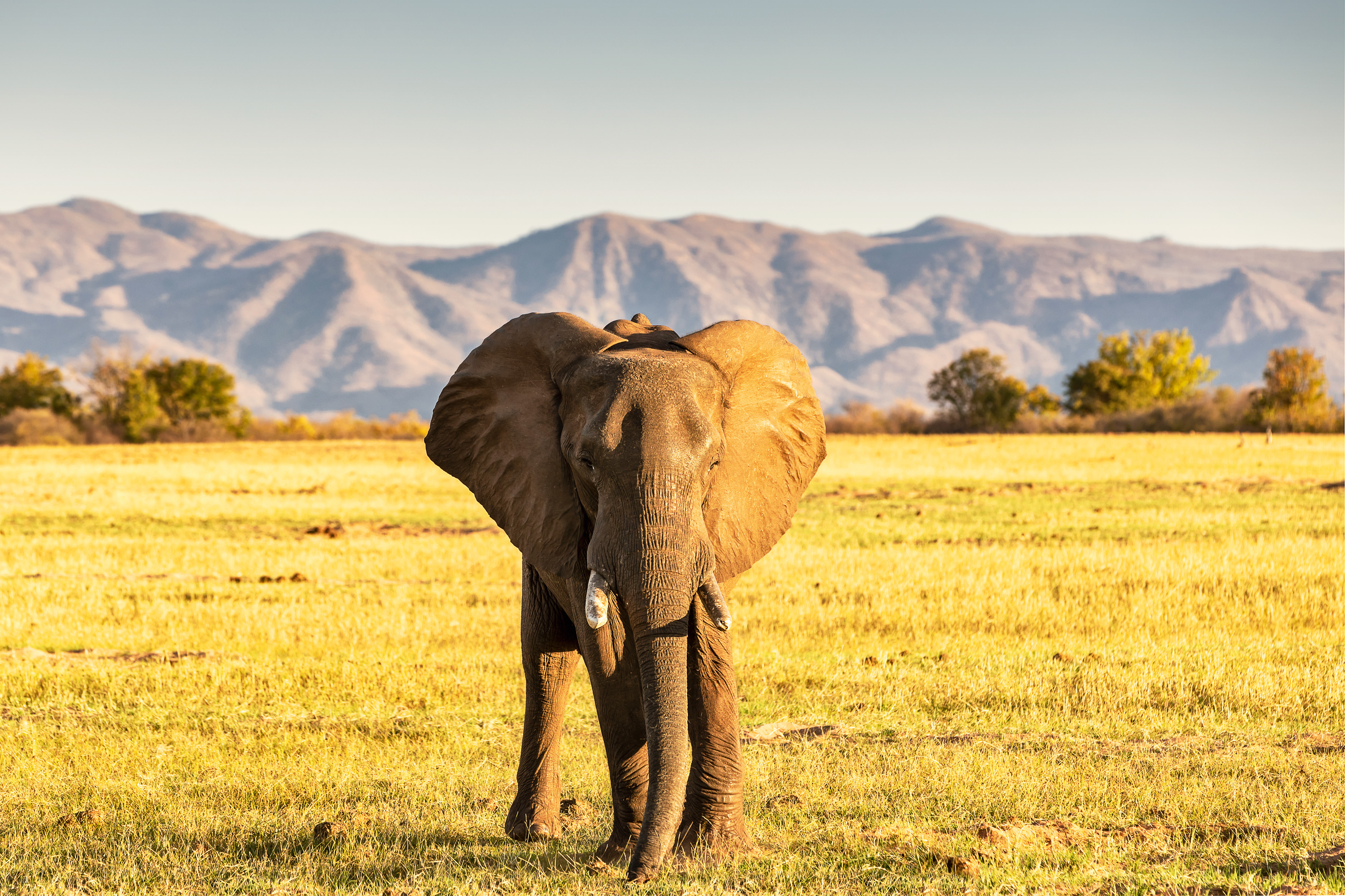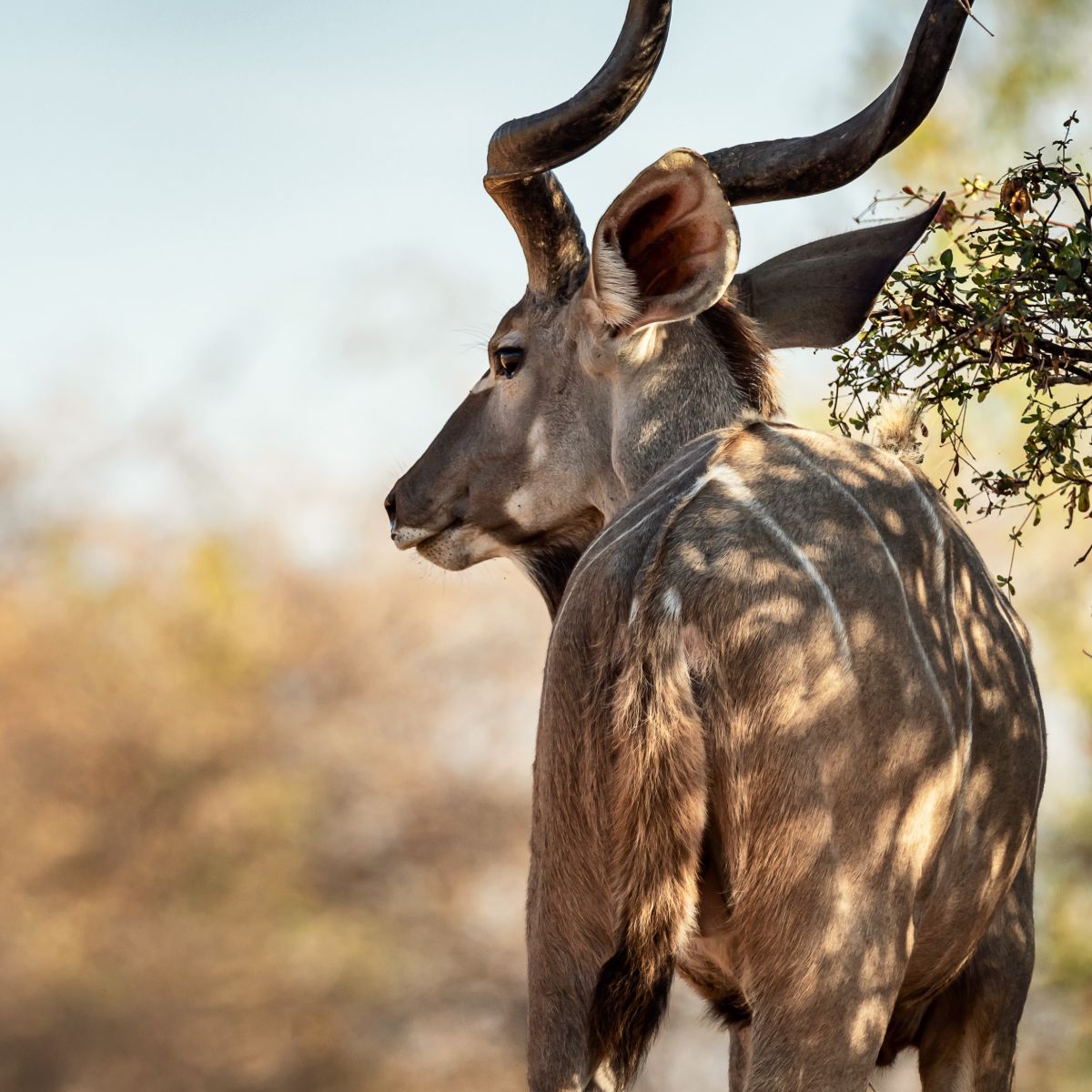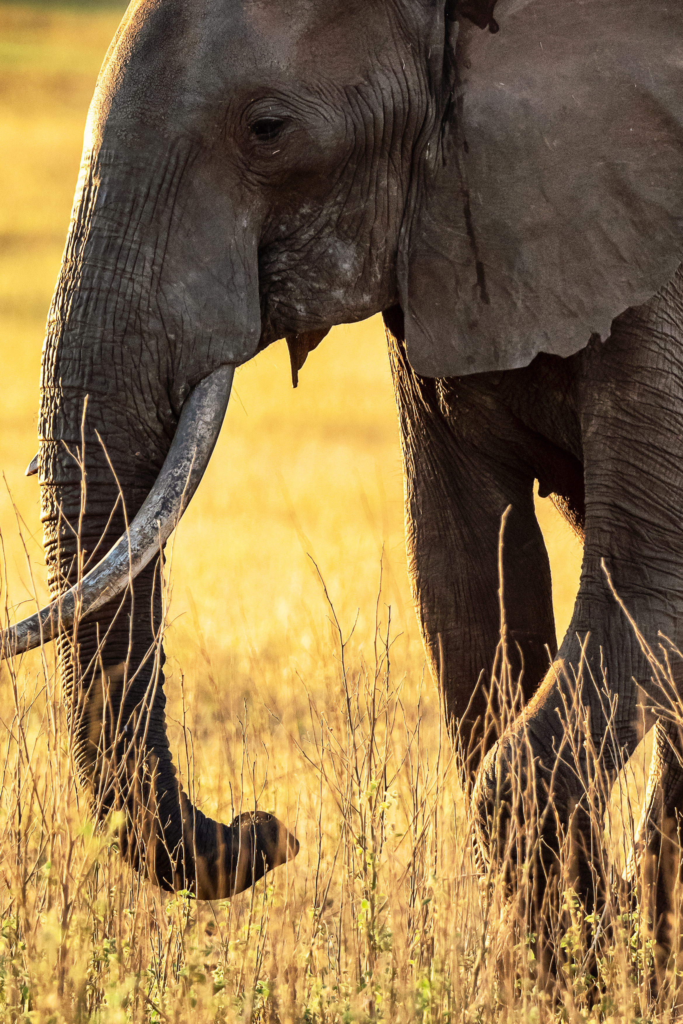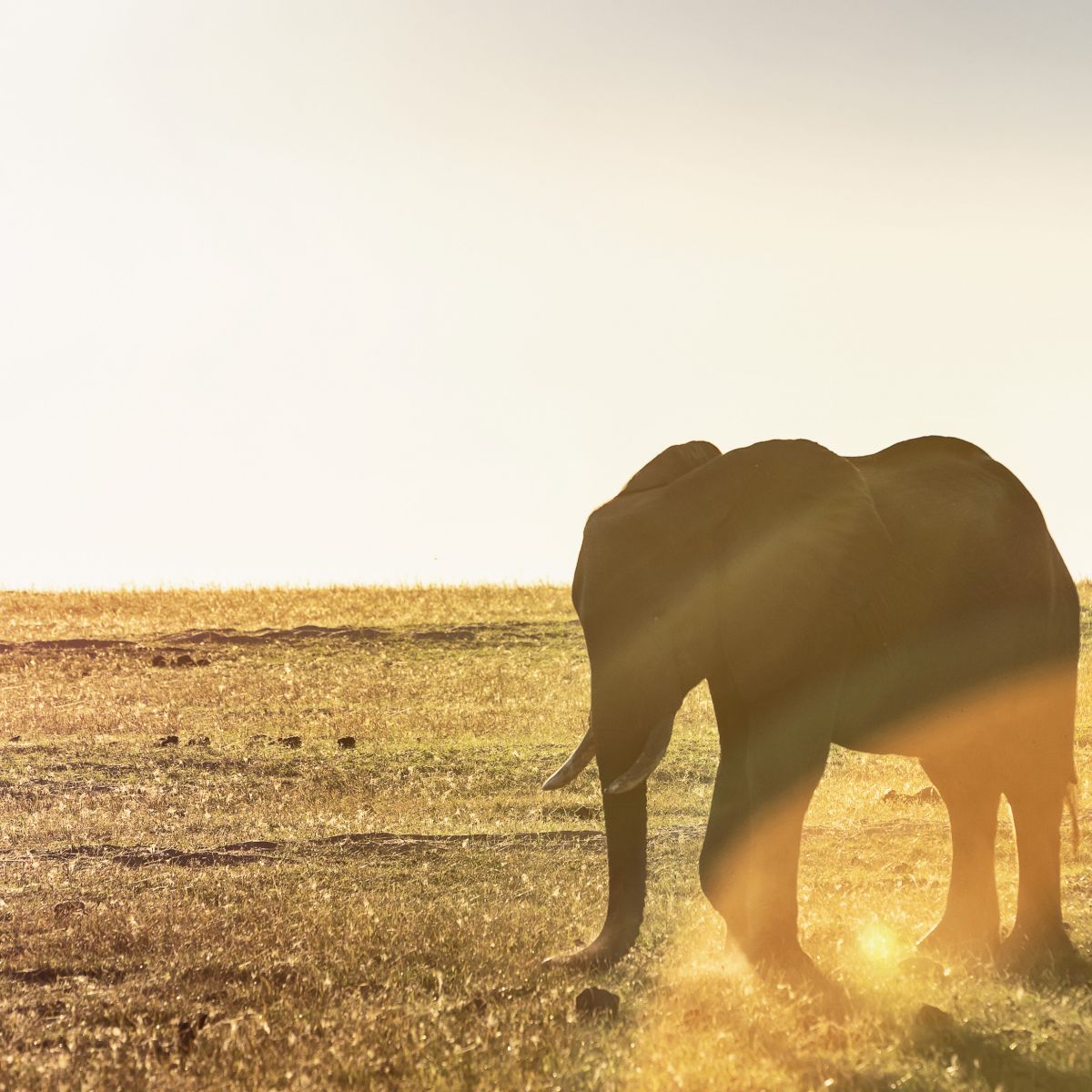 Diesen Nachmittag beobachten wir wie zahlreiche Elefanten und Impalas friedlich auf der unendlich weiten Ebene grasen. Die Abendsonne taucht die Welt in ein goldenes Licht und wir genießen unseren Gin & Tonic am Rande der ruhig dahinziehenden Büffelherde, die wir vom Morning-Drive schon kennen. Wir werden Zeuge eines faszinierenden Farbspiels und halten die Momente des warmen Gegenlichts mit vielen Bildern fest.